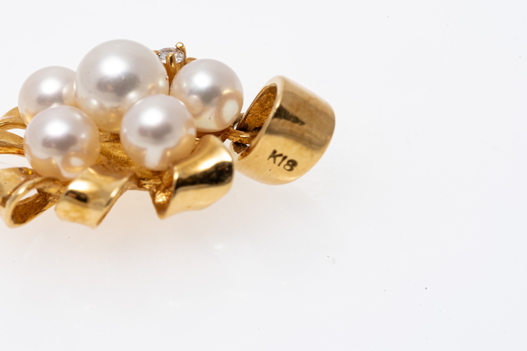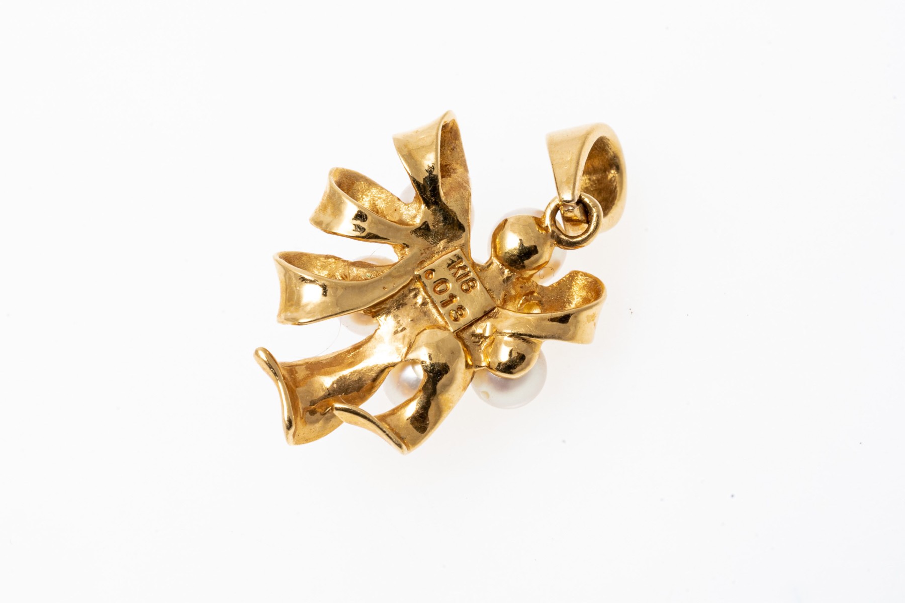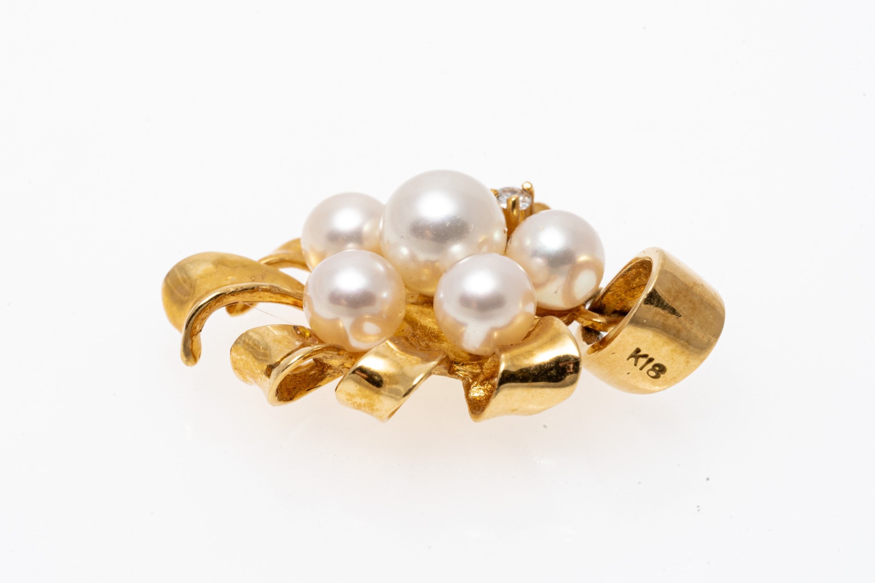 18k yellow gold lovely cultured pearl and ribbon motif pendant, decorated with a round faceted diamond, approximately 0.01 CTS, prong set, finished with a solid bale