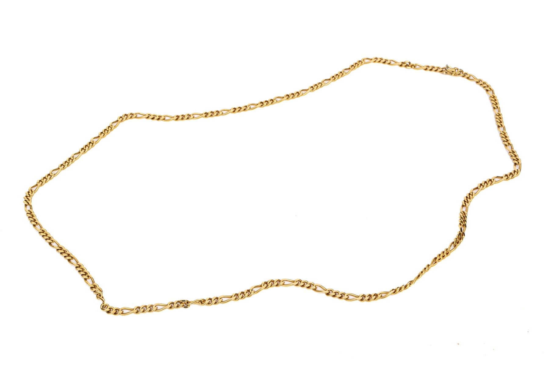 18k yellow gold opera length heavy figaro style chain, finished with a hidden box clasp and a figure eight safety