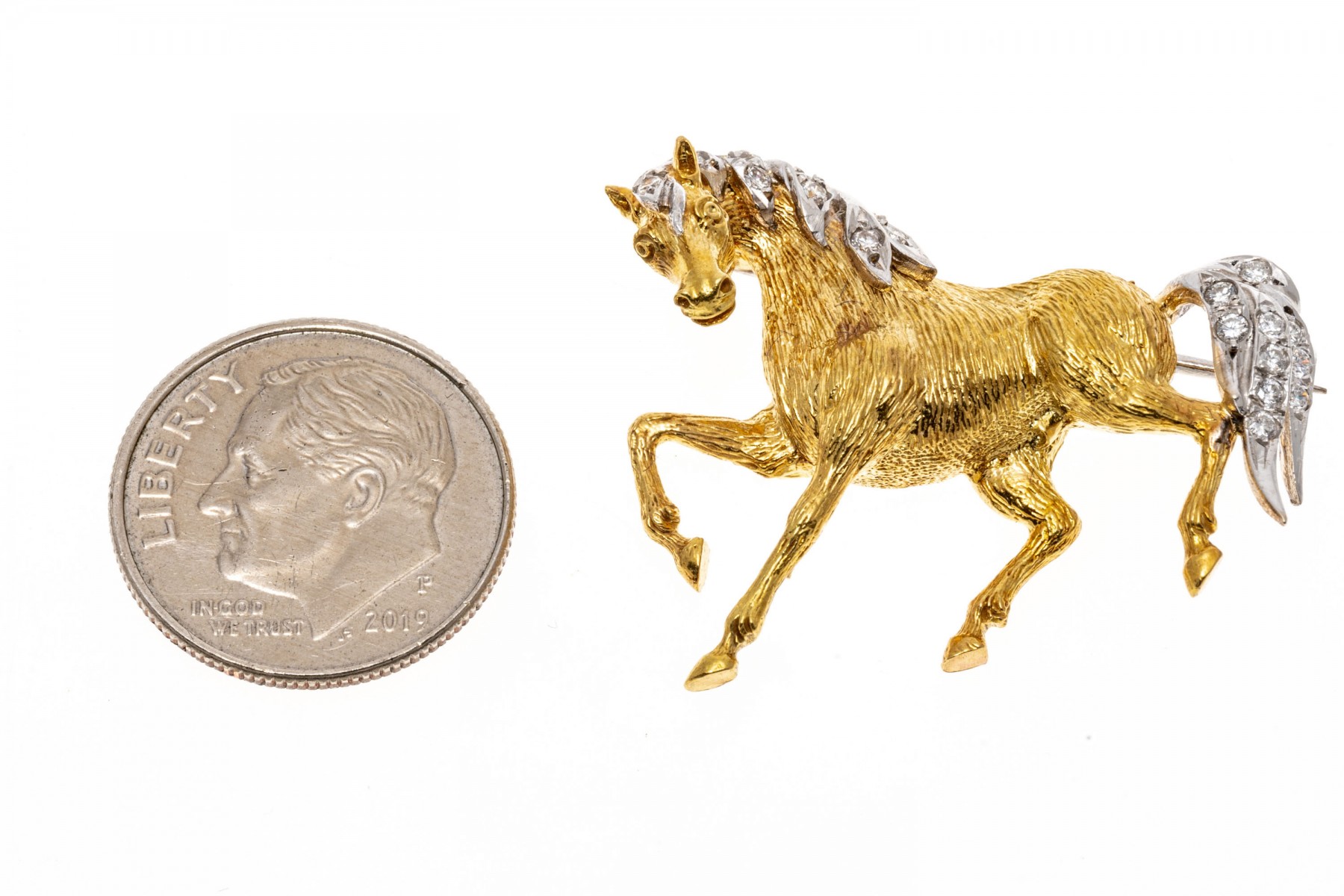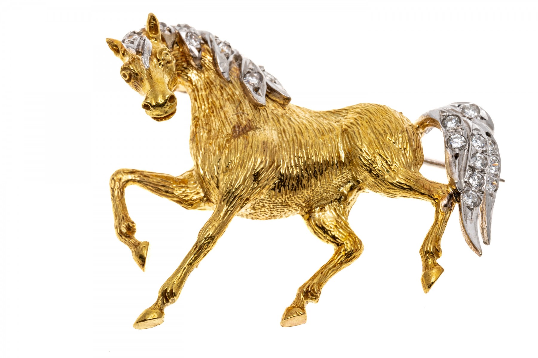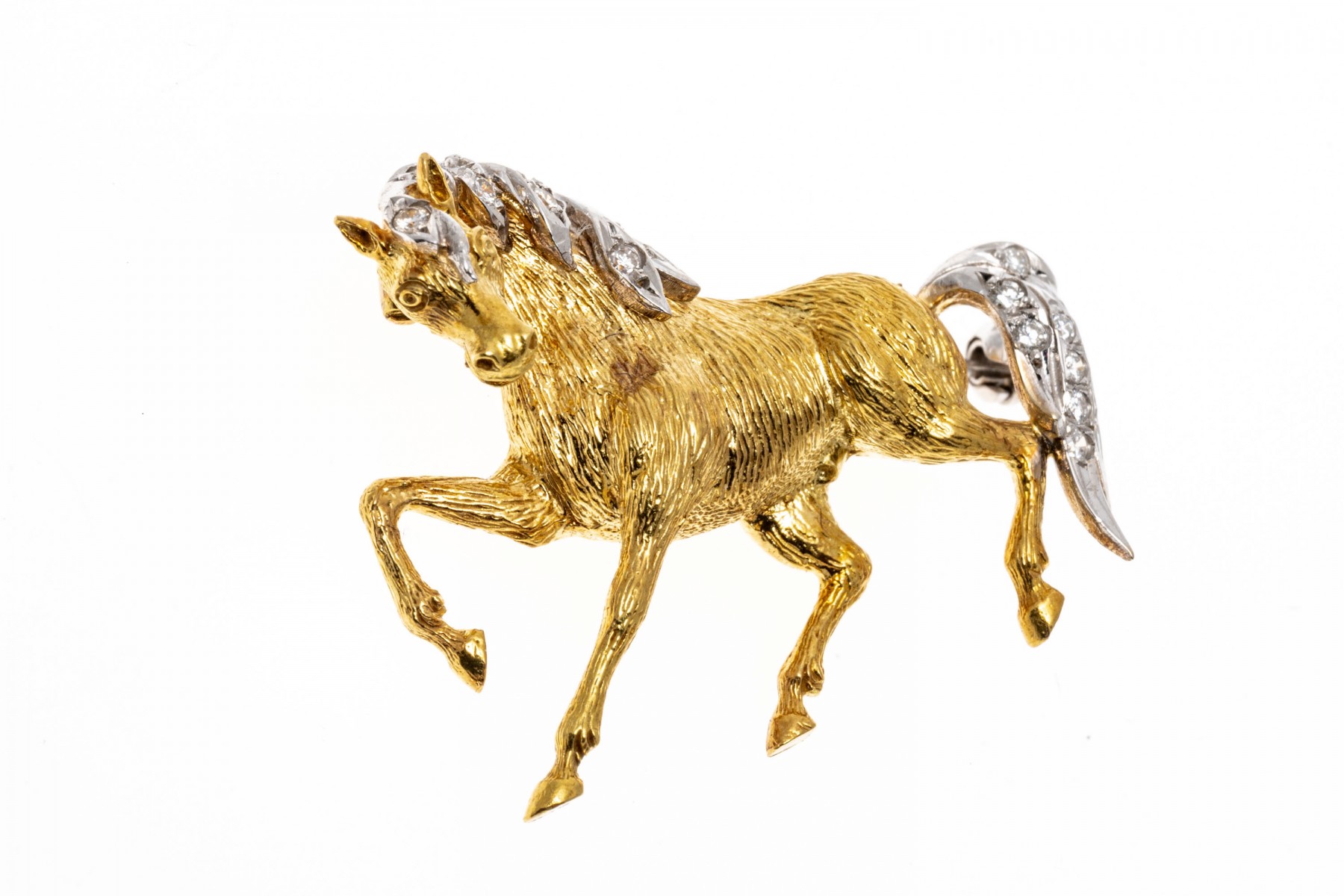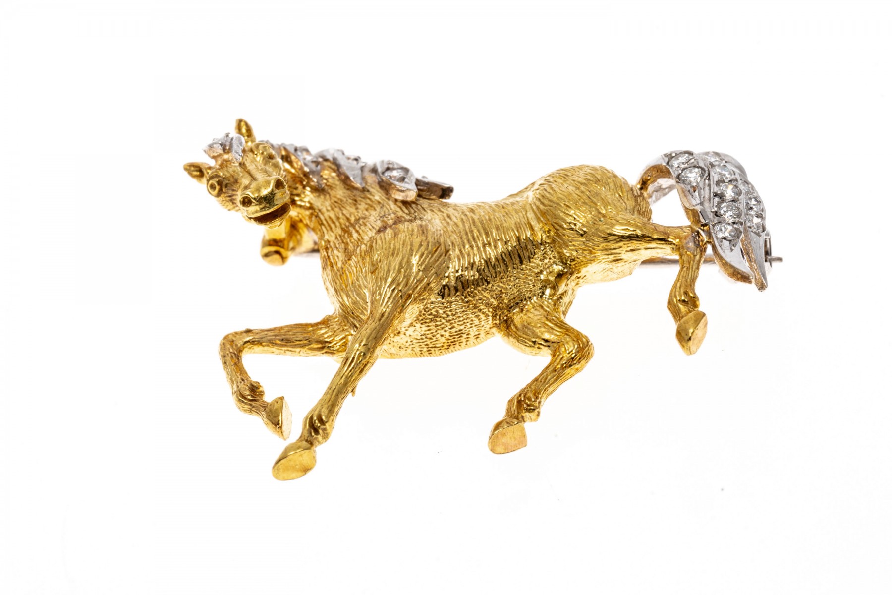 18k yellow gold brooch. This playful yellow gold animal form brooch is a horse motif, Florentine finished and decorated with a round faceted diamonds set mane and tail, approximately 0.14 TCW, and finished with synthetic ruby eyes