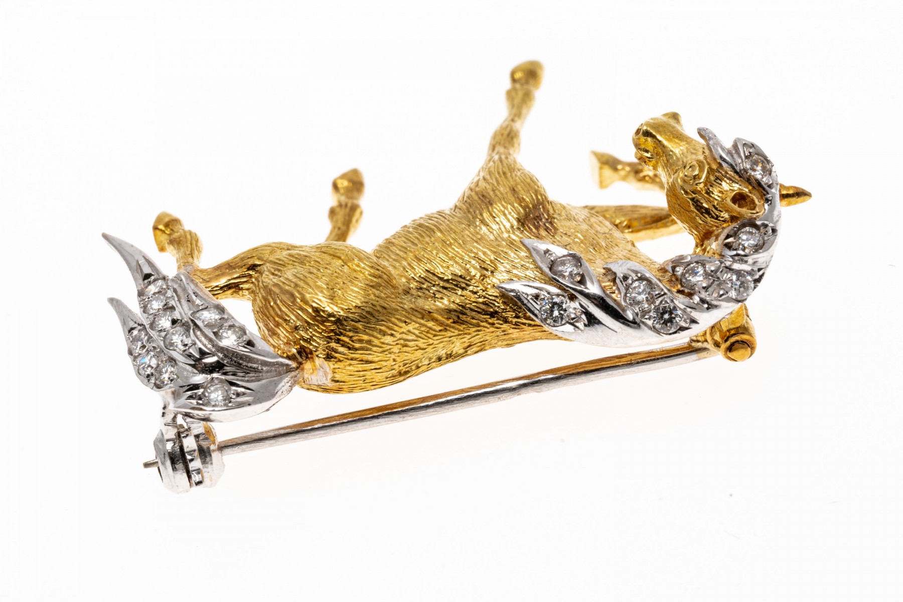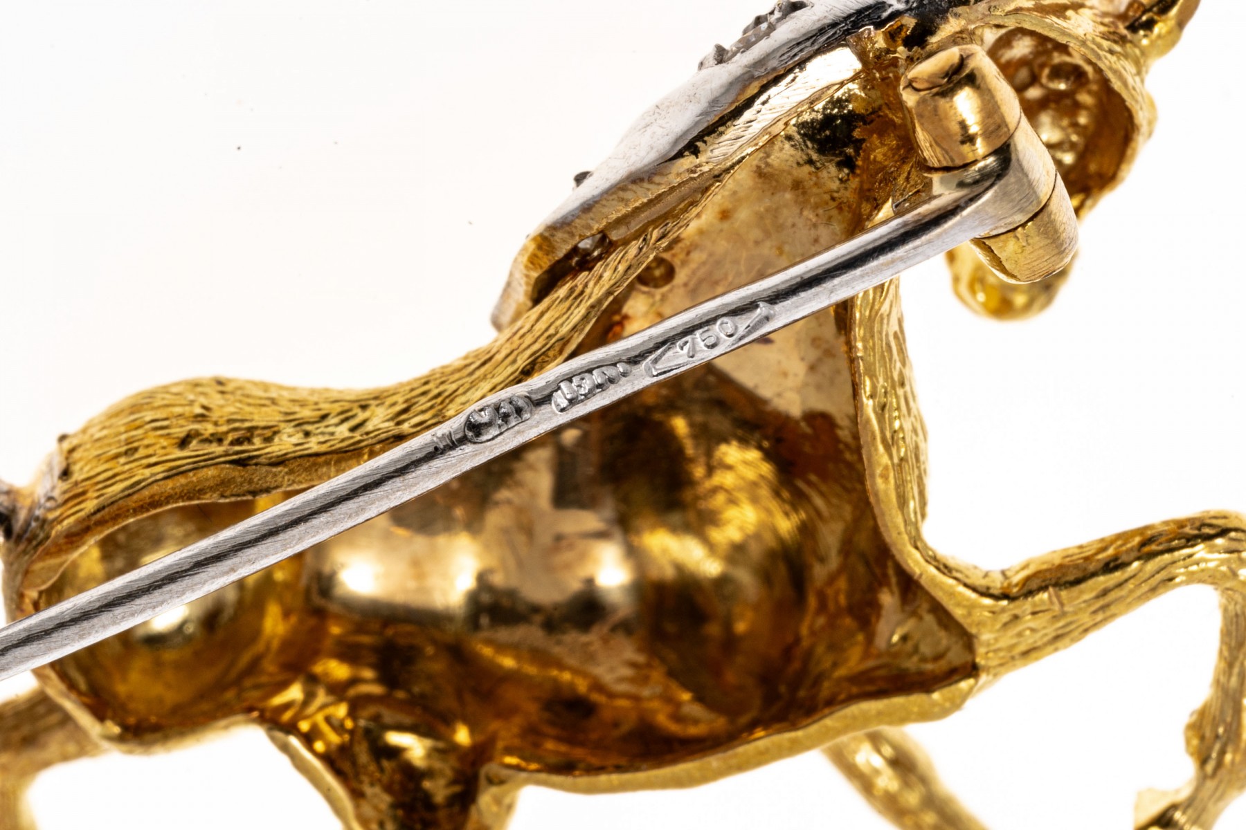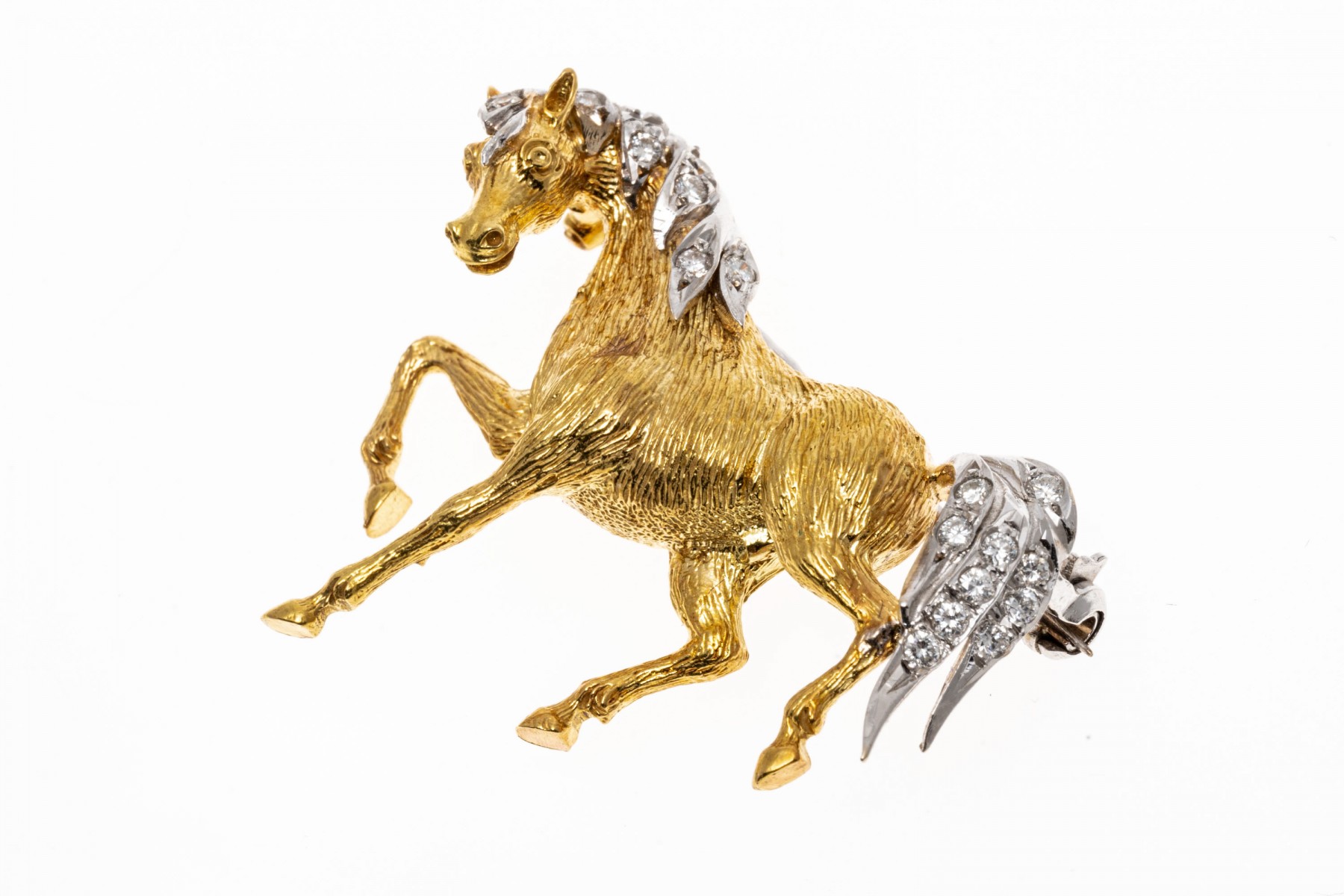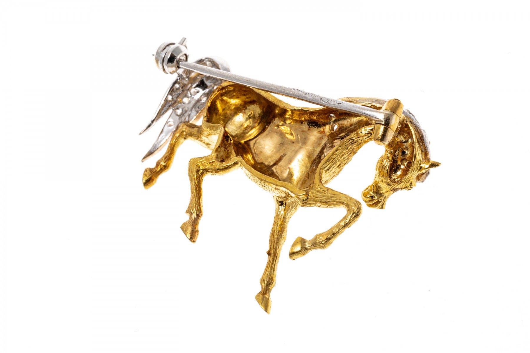 18k yellow gold brooch. This playful yellow gold animal form brooch is a horse motif, Florentine finished and decorated with a round faceted diamonds set mane and tail, approximately 0.14 TCW, and finished with synthetic ruby eyes