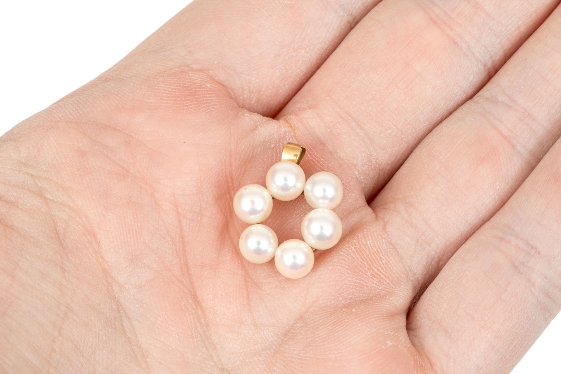 18k yellow gold pretty 5.25mm cultured pearl open circle pendant, beautiful lustre, finished with a notched style bale