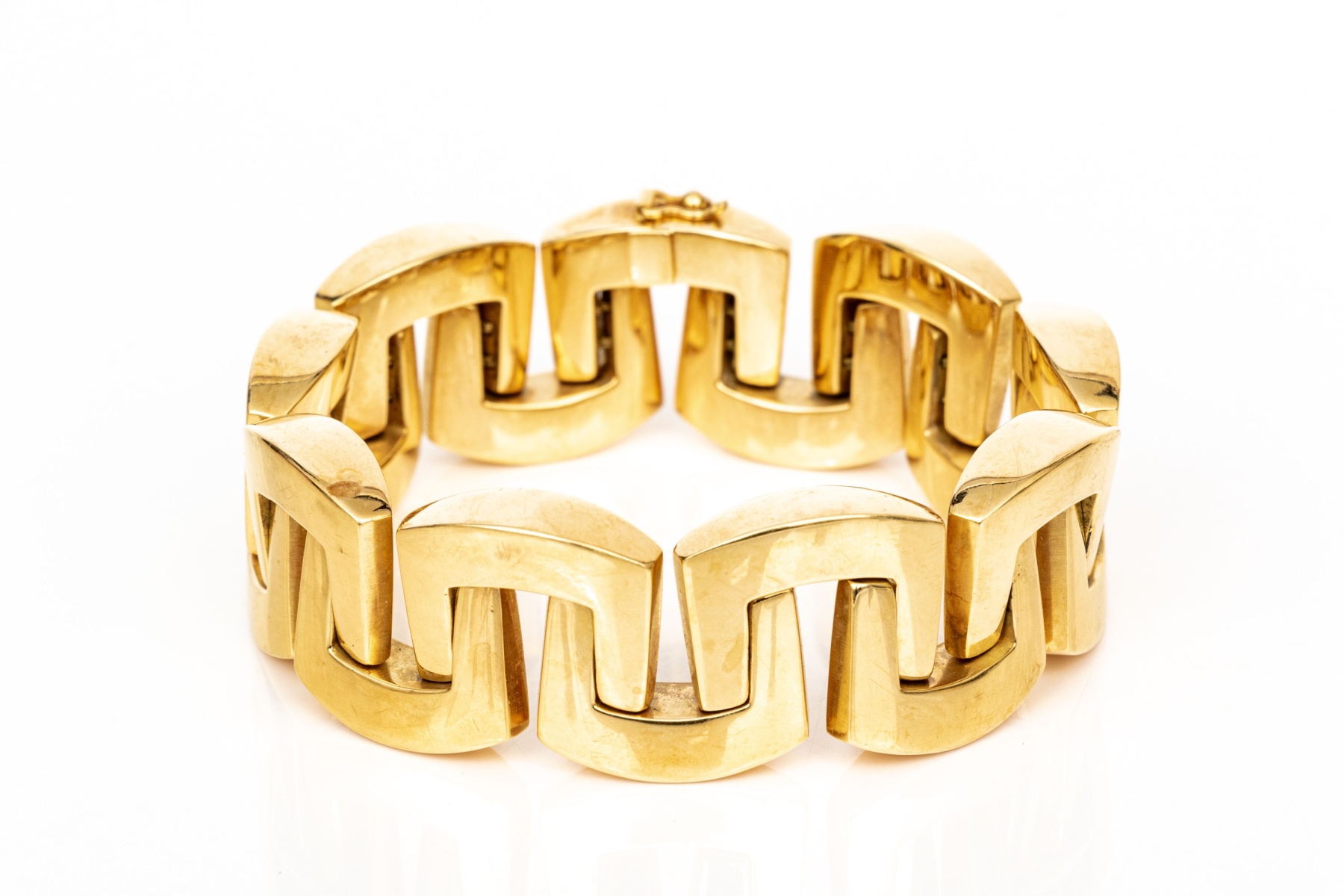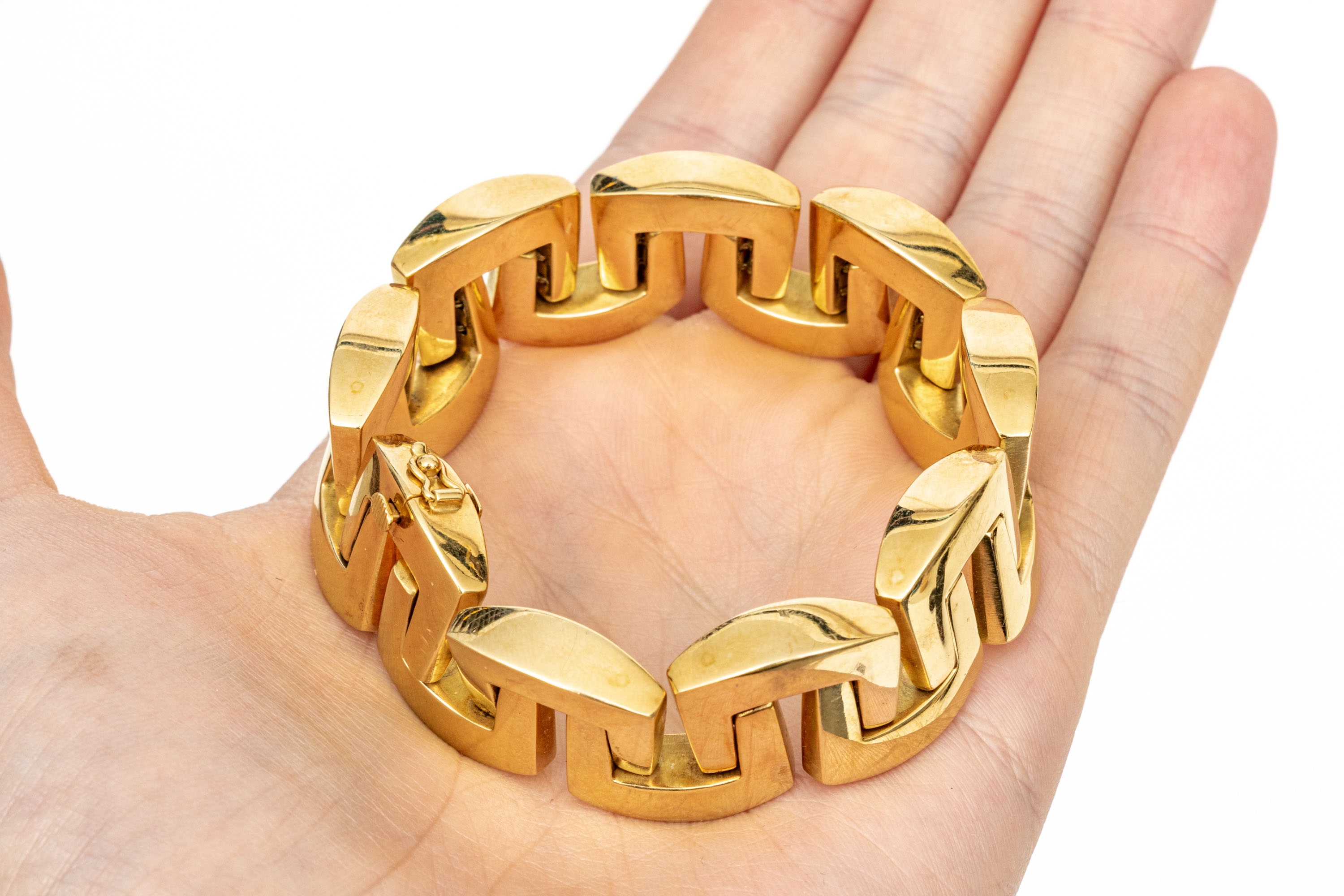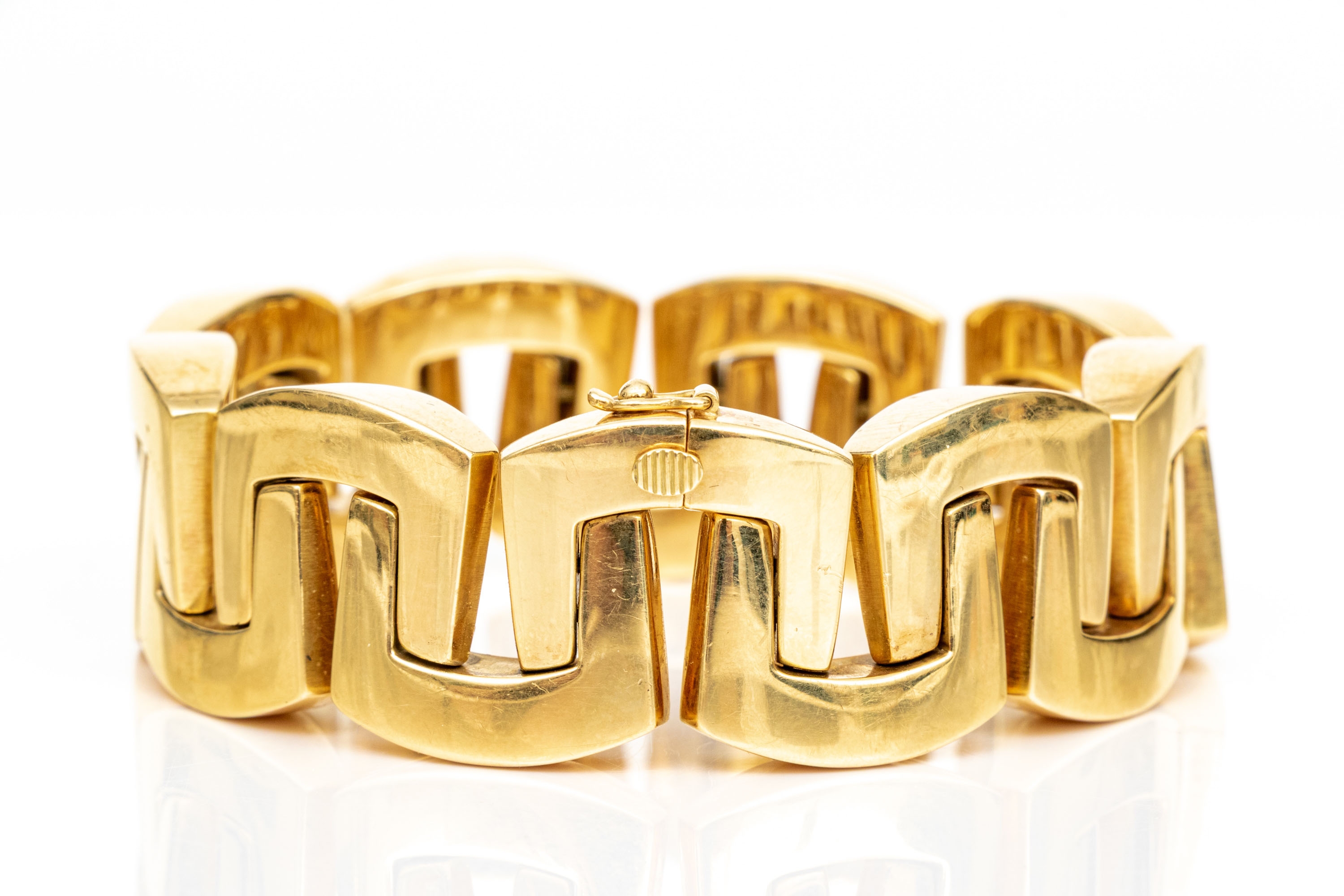 18k yellow gold striking chunky opposing "C" patterned link bracelet. This striking bracelet features large hinged nested opposing "C" style links, with a high polished finish, and completed with a hidden box style clasp and a figure eight safety