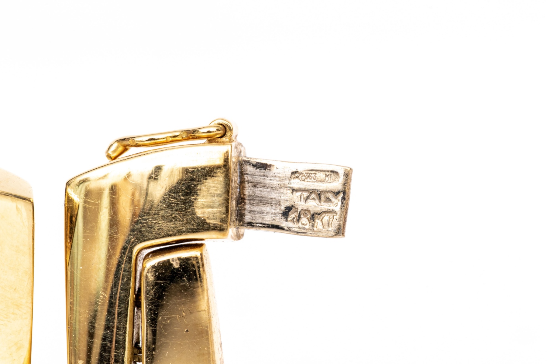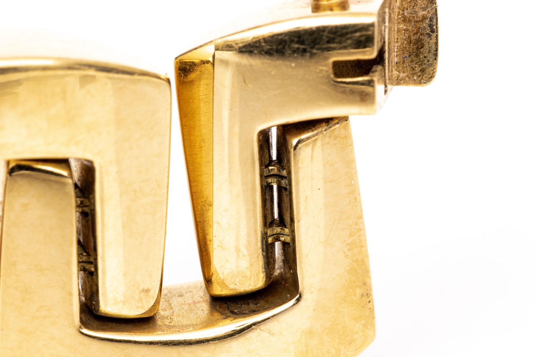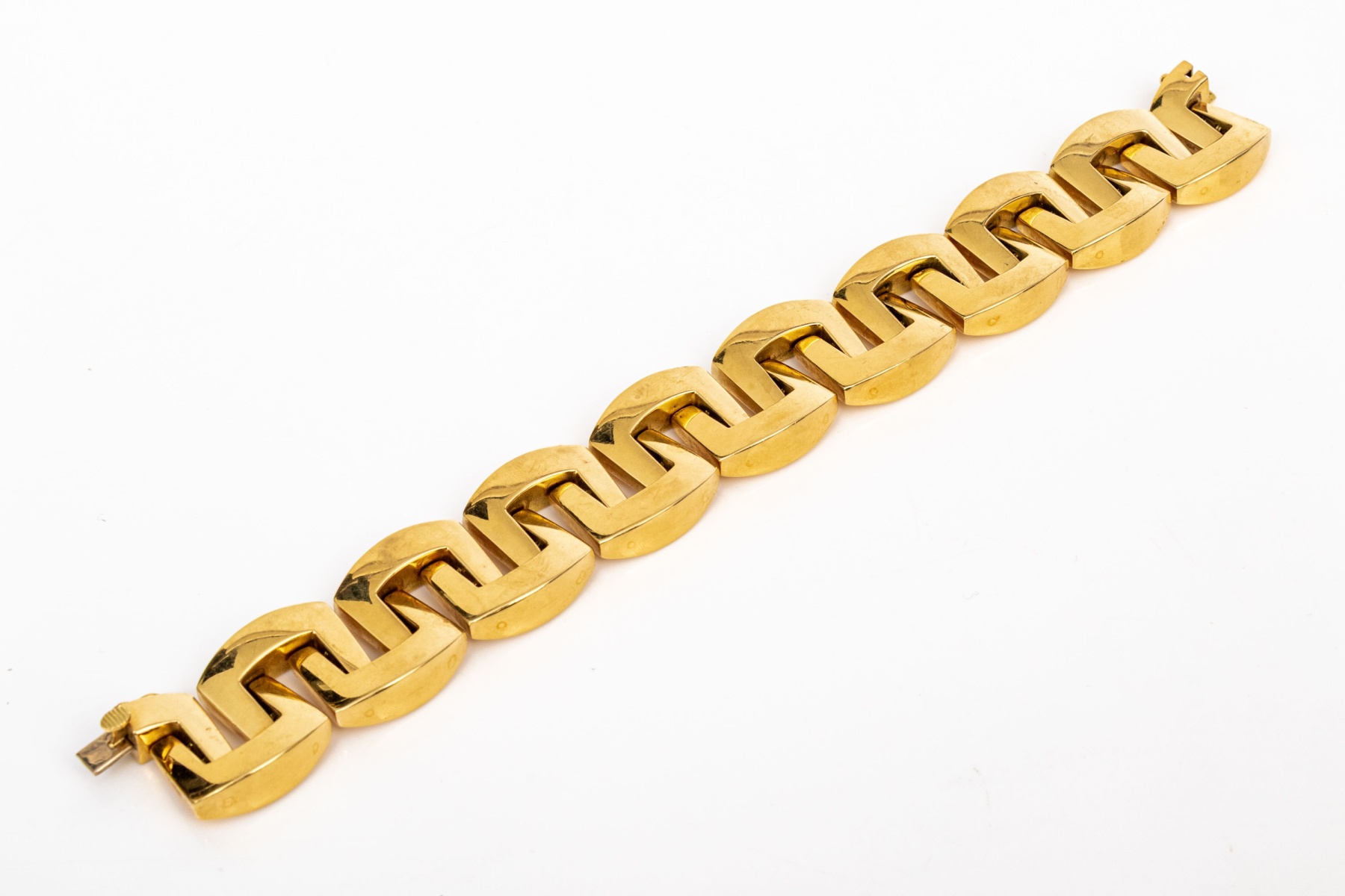 18k yellow gold striking chunky opposing "C" patterned link bracelet. This striking bracelet features large hinged nested opposing "C" style links, with a high polished finish, and completed with a hidden box style clasp and a figure eight safety