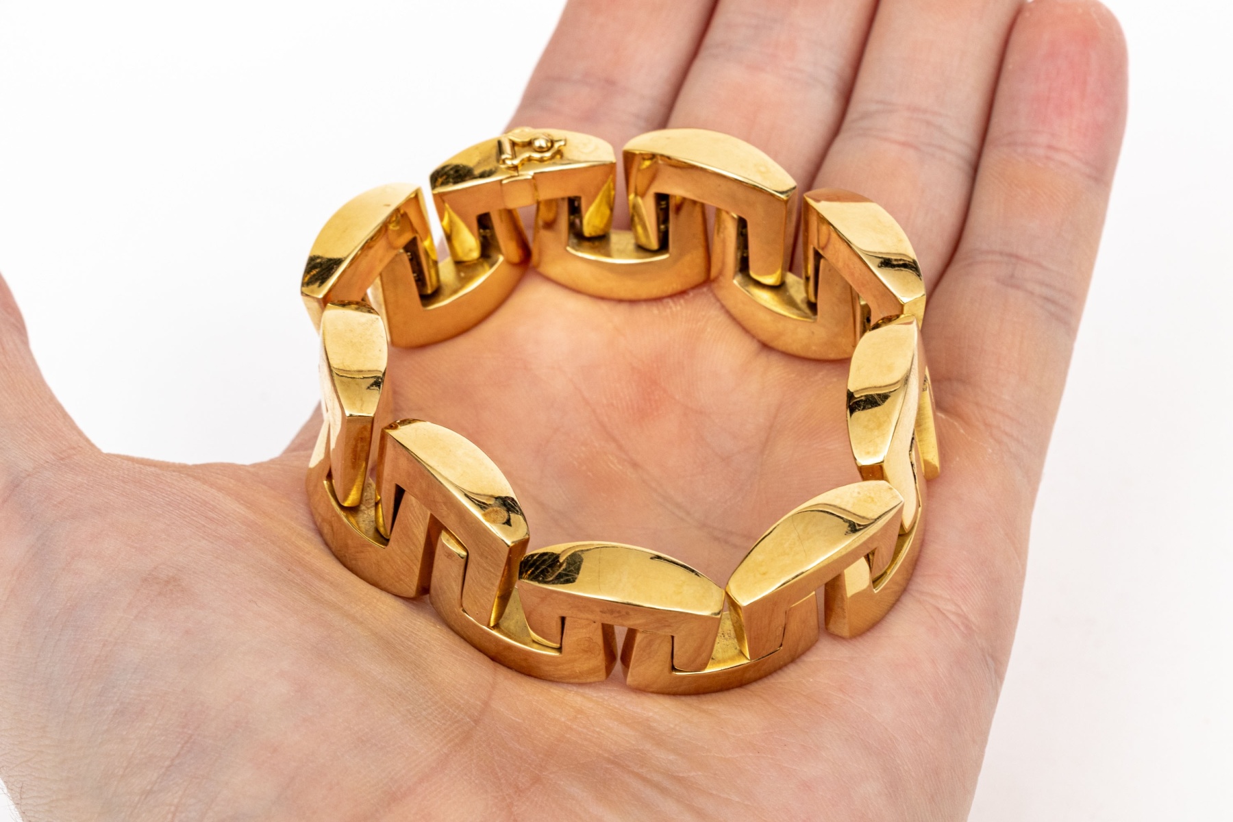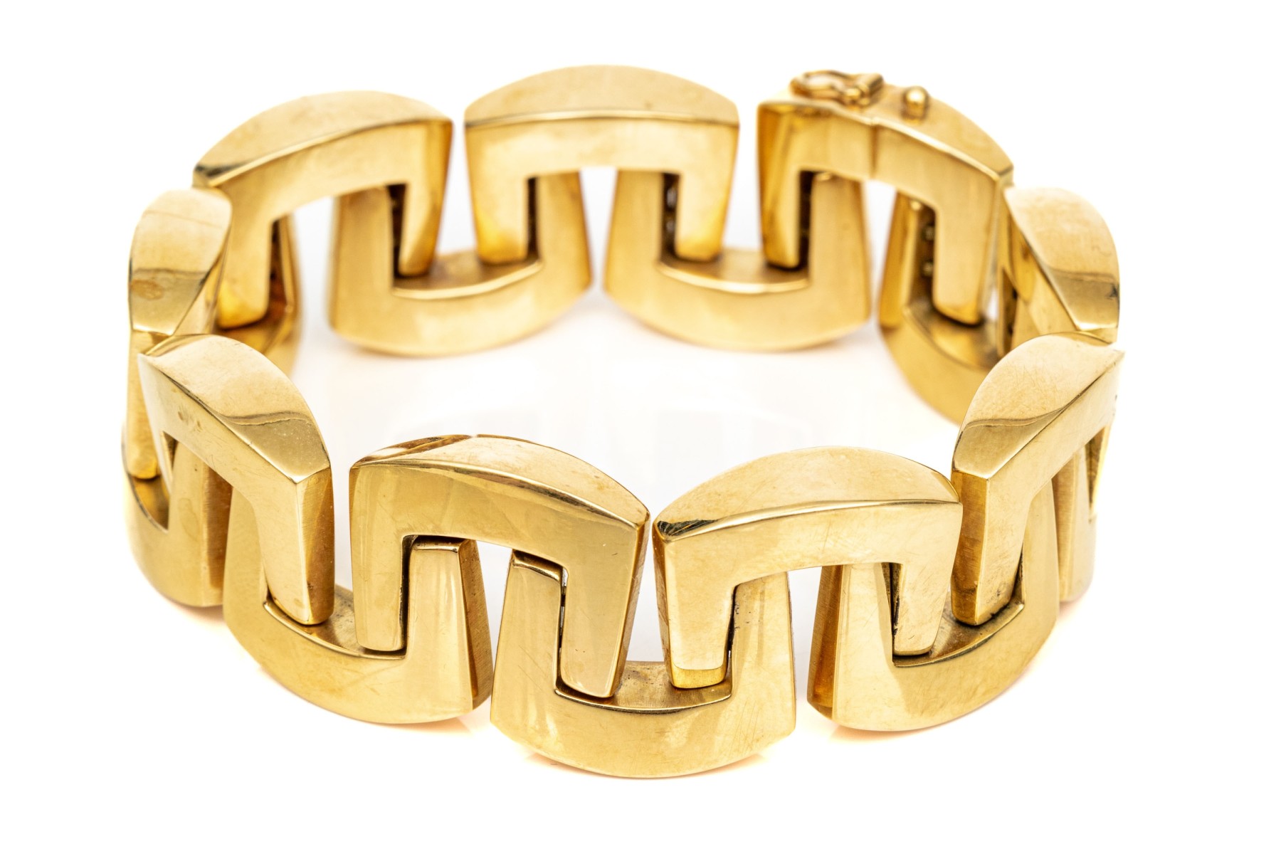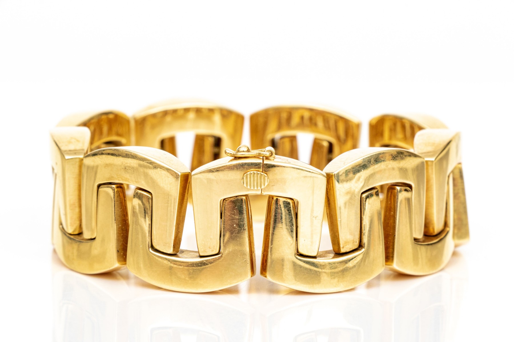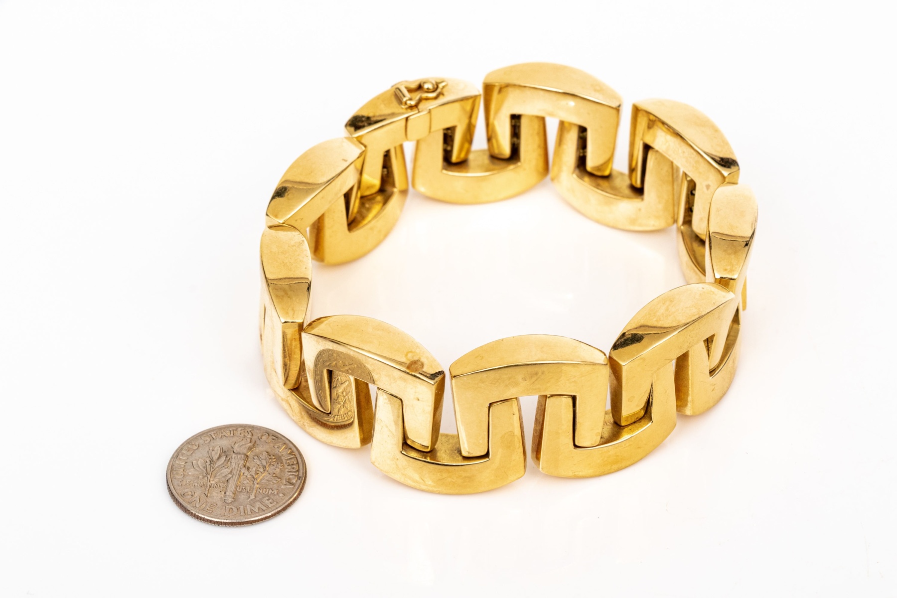 18k yellow gold striking chunky opposing "C" patterned link bracelet. This striking bracelet features large hinged nested opposing "C" style links, with a high polished finish, and completed with a hidden box style clasp and a figure eight safety