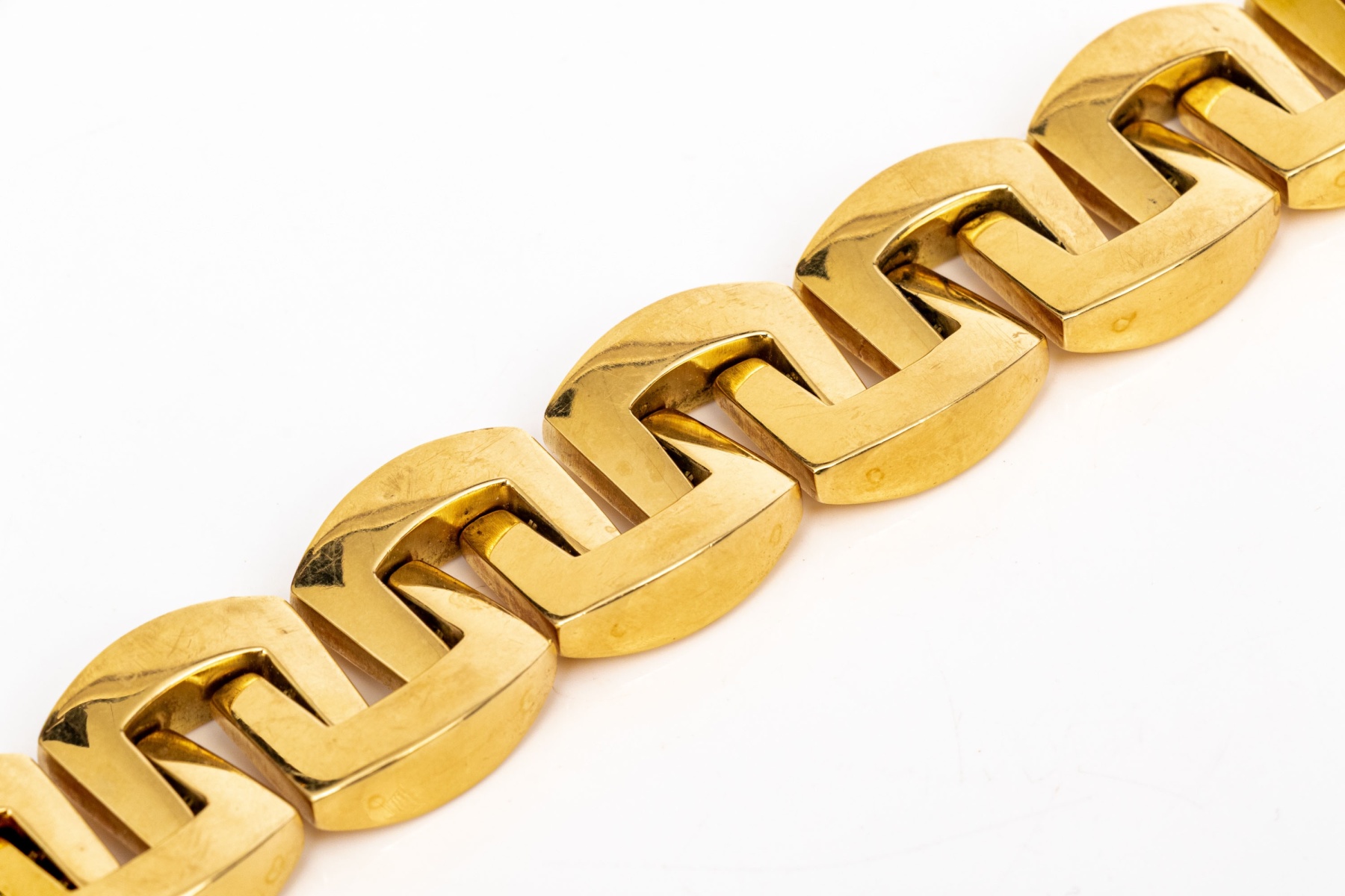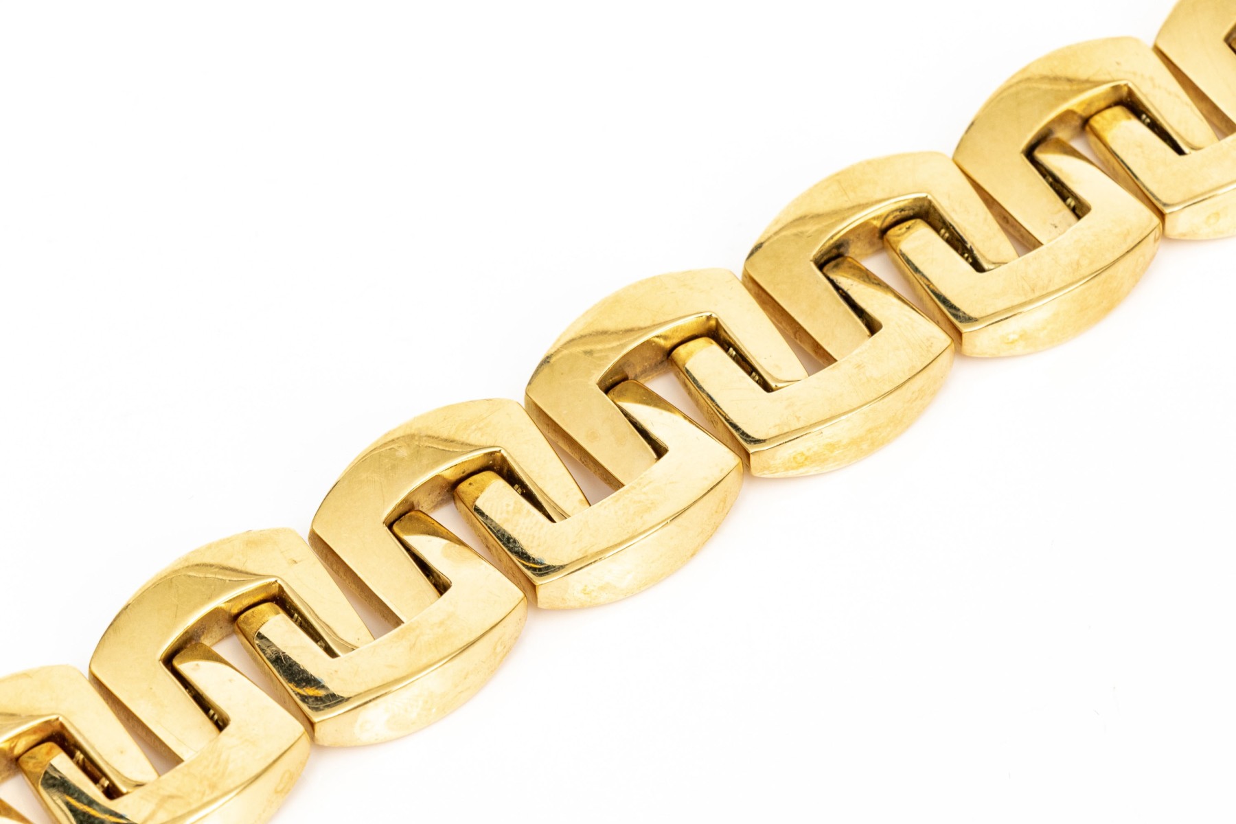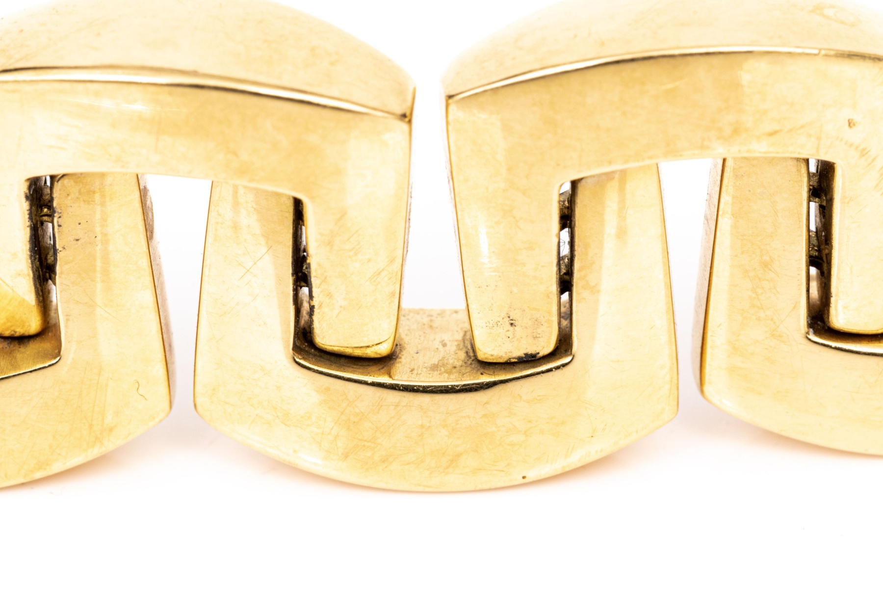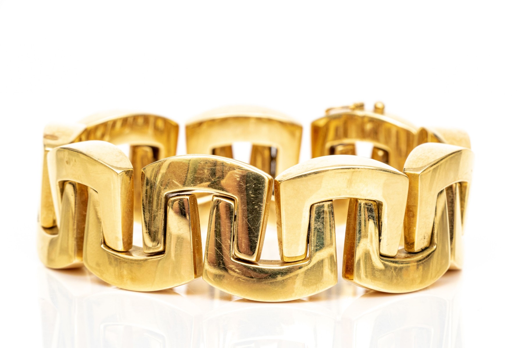 18k yellow gold striking chunky opposing "C" patterned link bracelet. This striking bracelet features large hinged nested opposing "C" style links, with a high polished finish, and completed with a hidden box style clasp and a figure eight safety