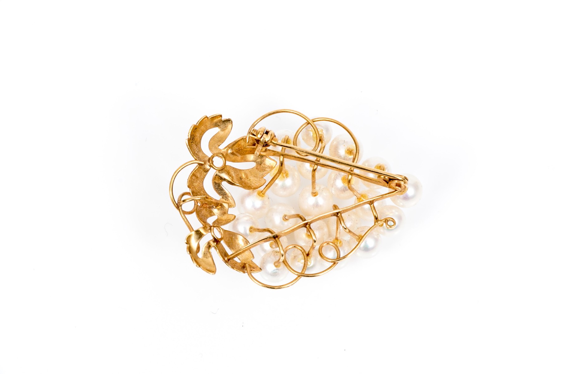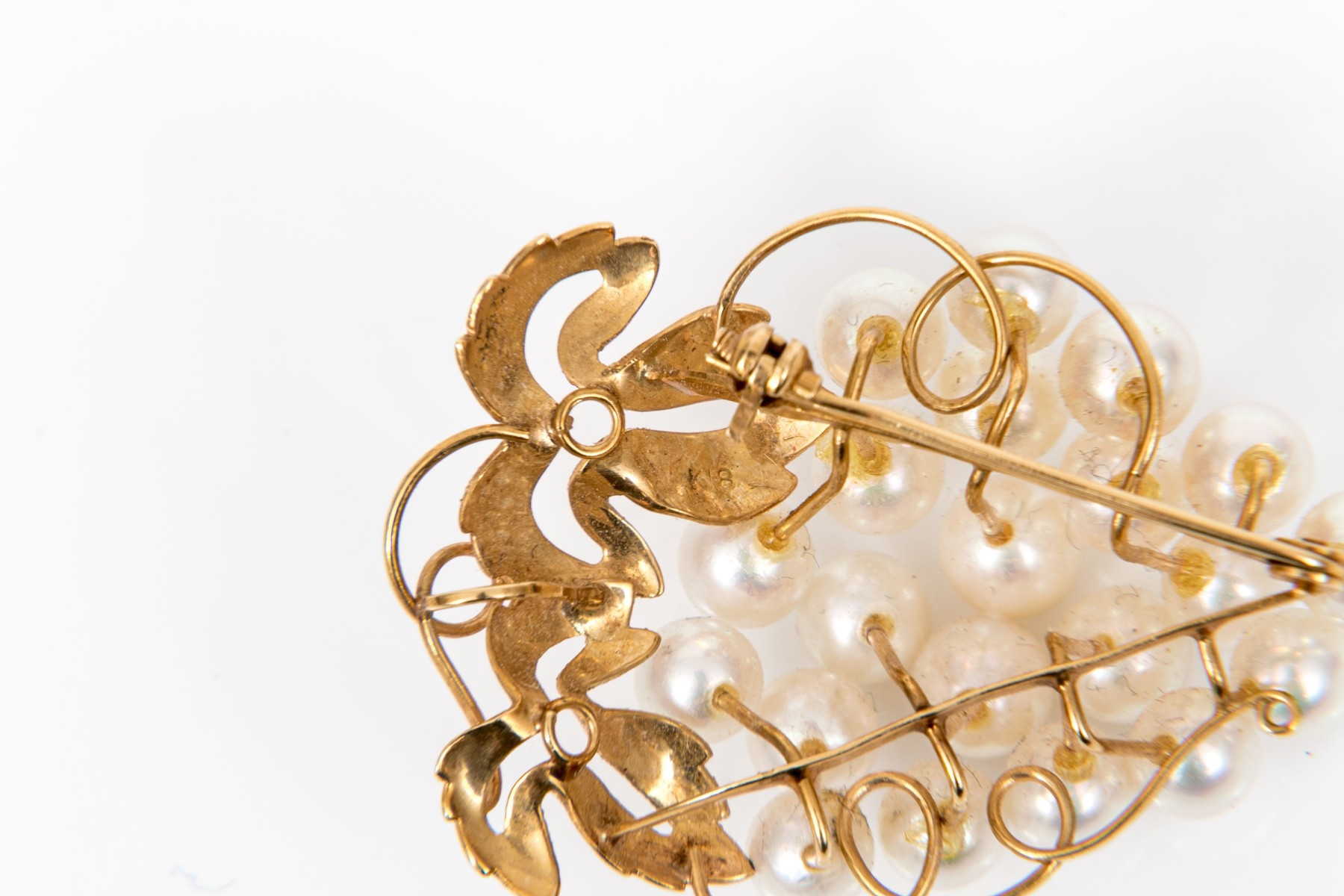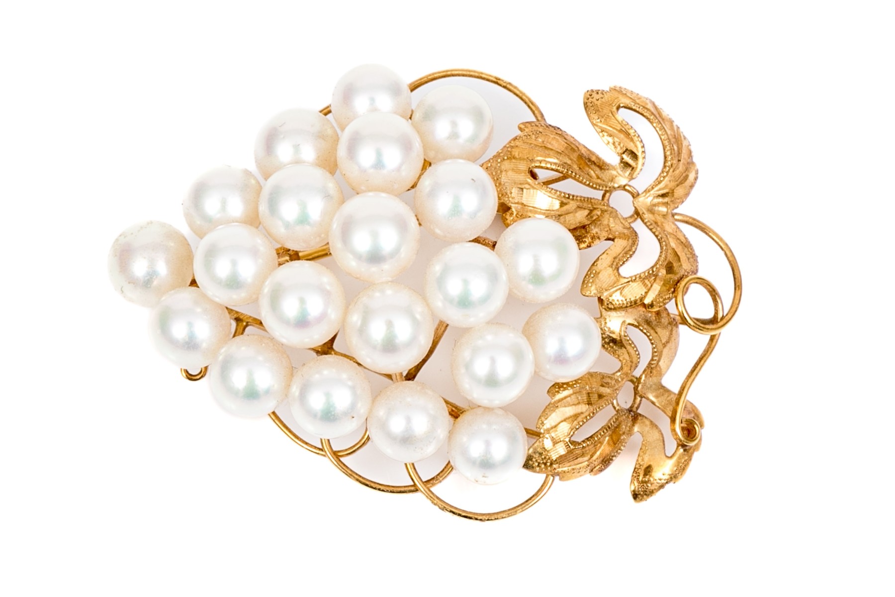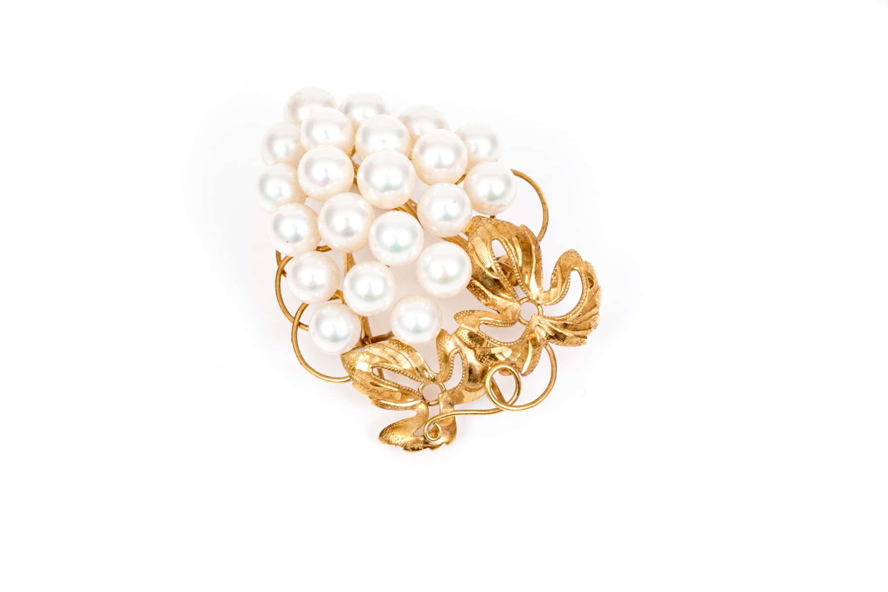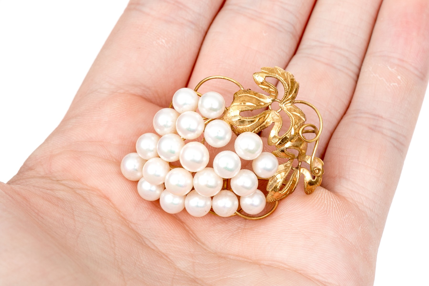 18k yellow gold striking cultured pearl grape motif brooch, set with 5 mm to 5.25 mm cultured pearls and diamonds cut leaves