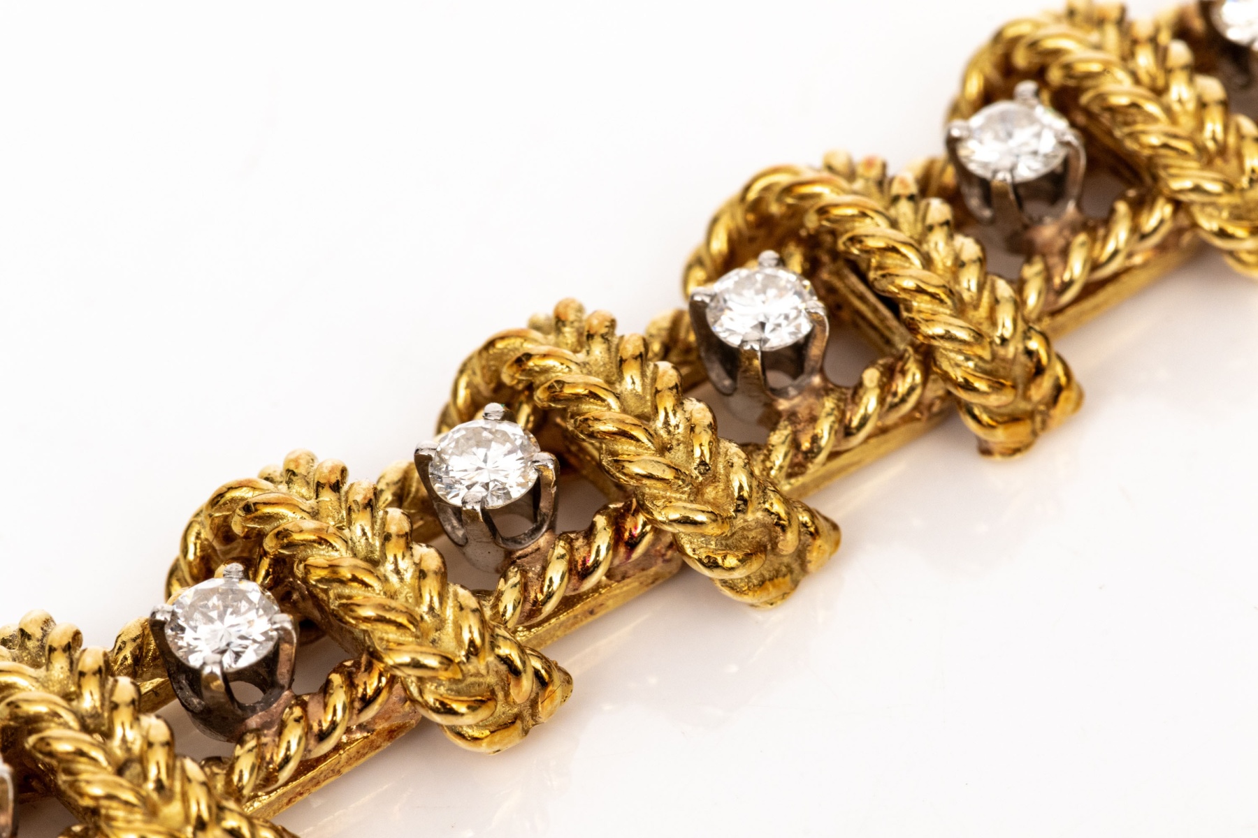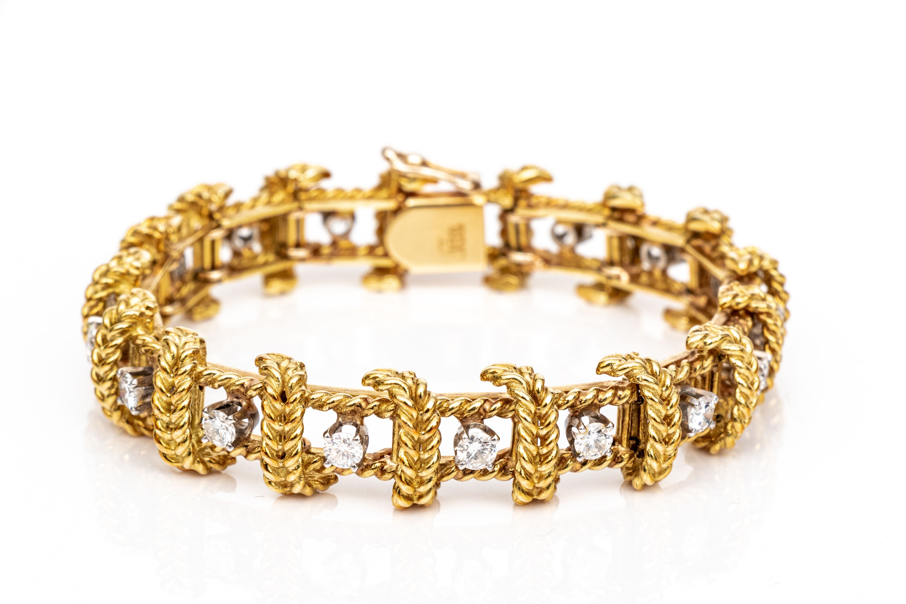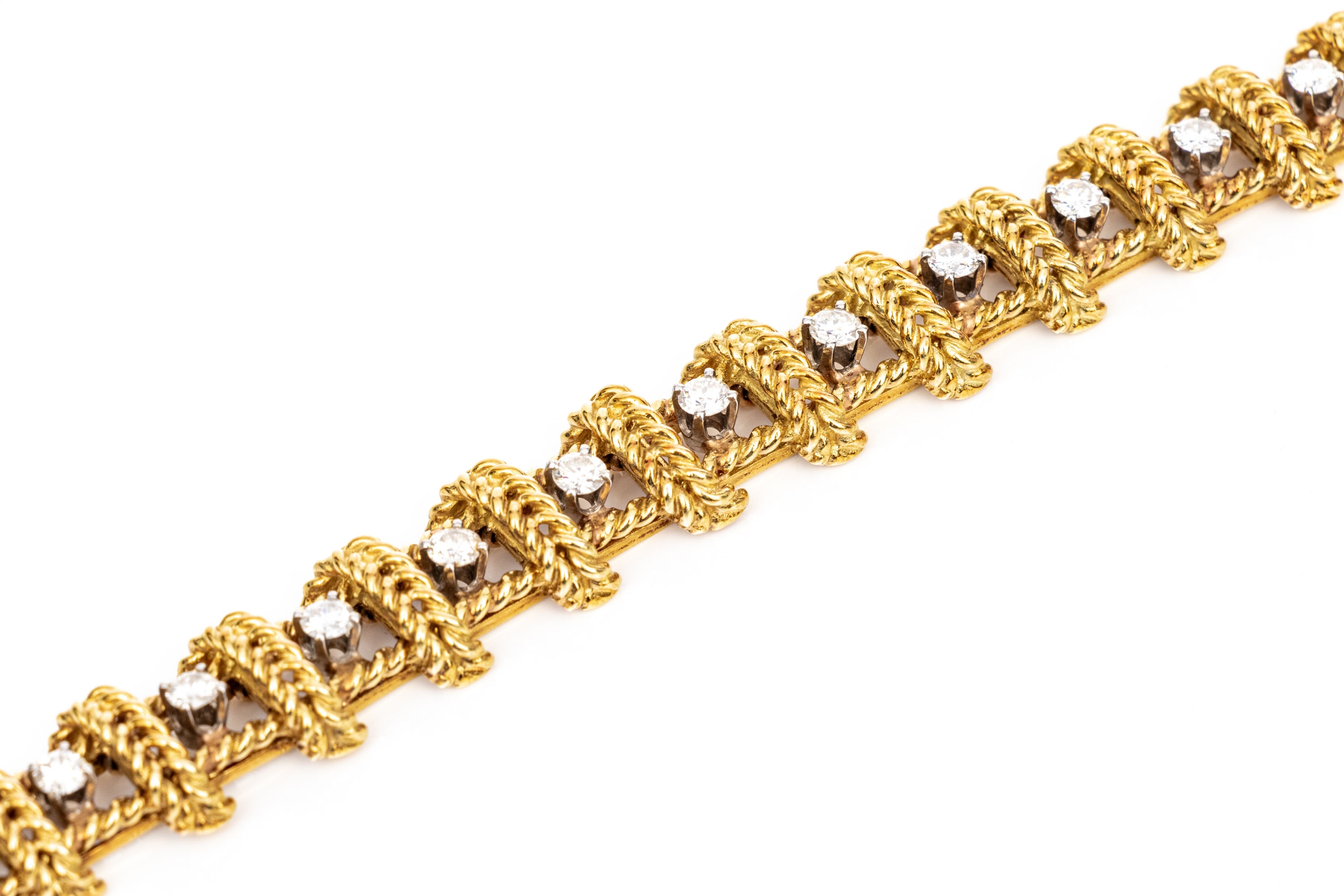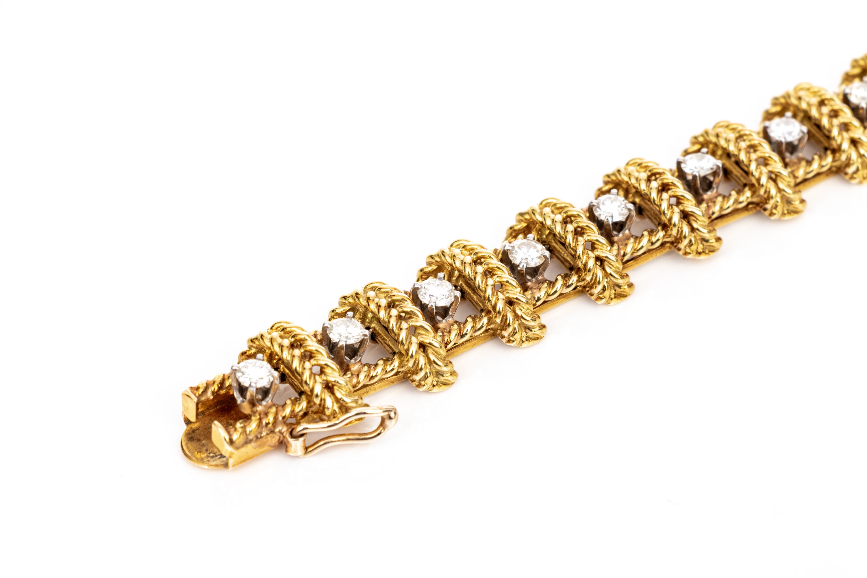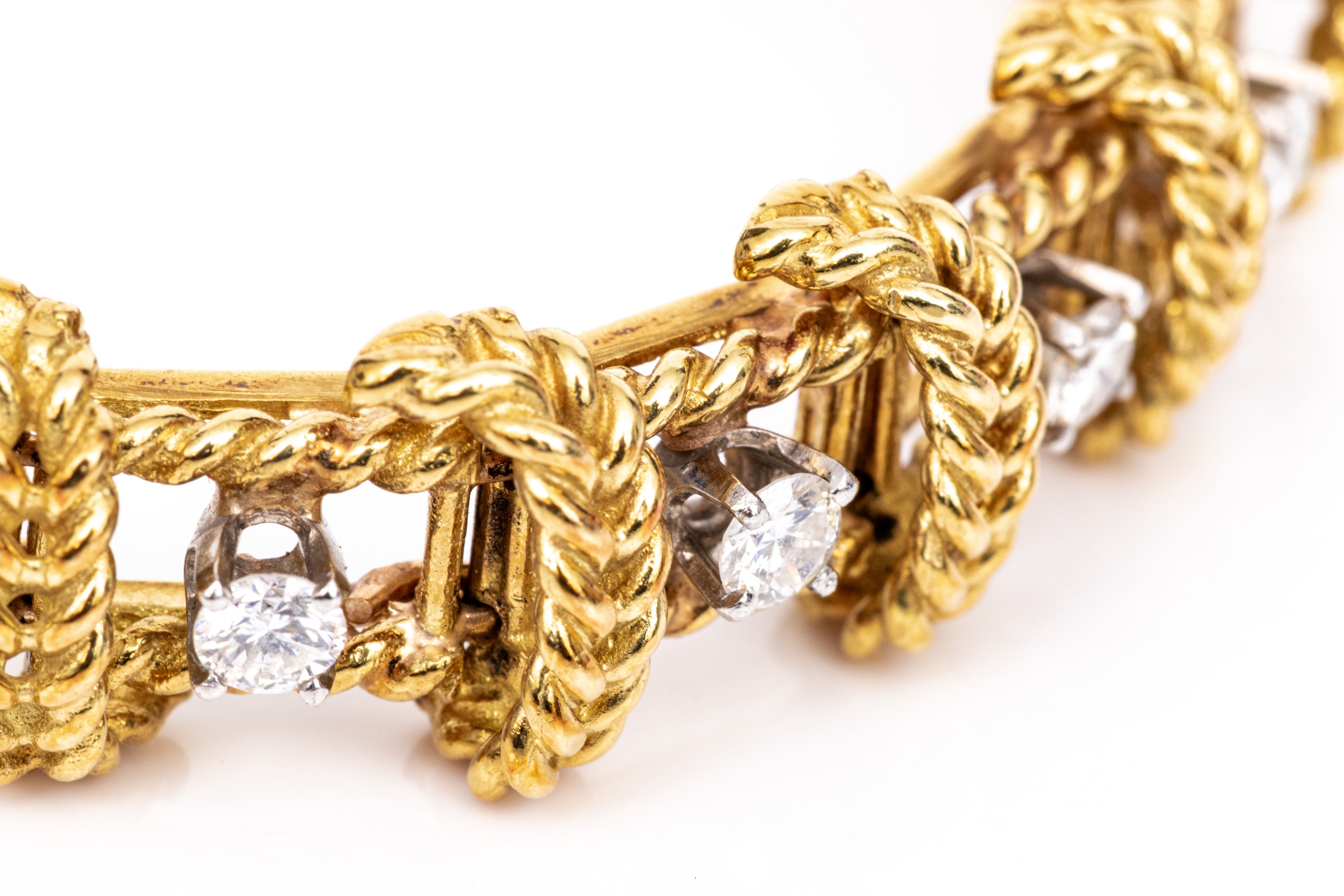18k yellow gold stunning vintage diamond set rope motif bracelet, app. 2.38 TCW, ranging from VS1 to SI1, prong set. Finished with a hidden box style clasp and a figure eight style safety. Please note length, slightly short.