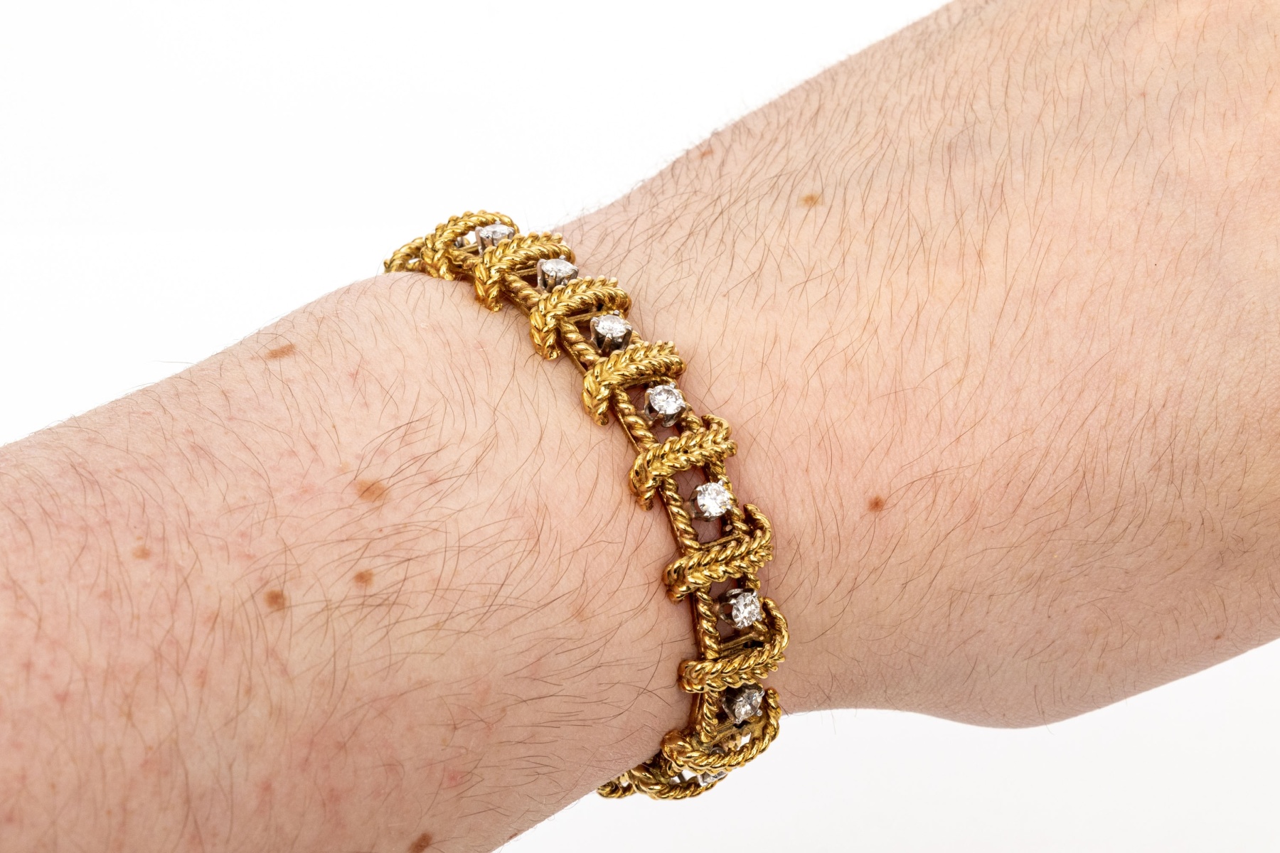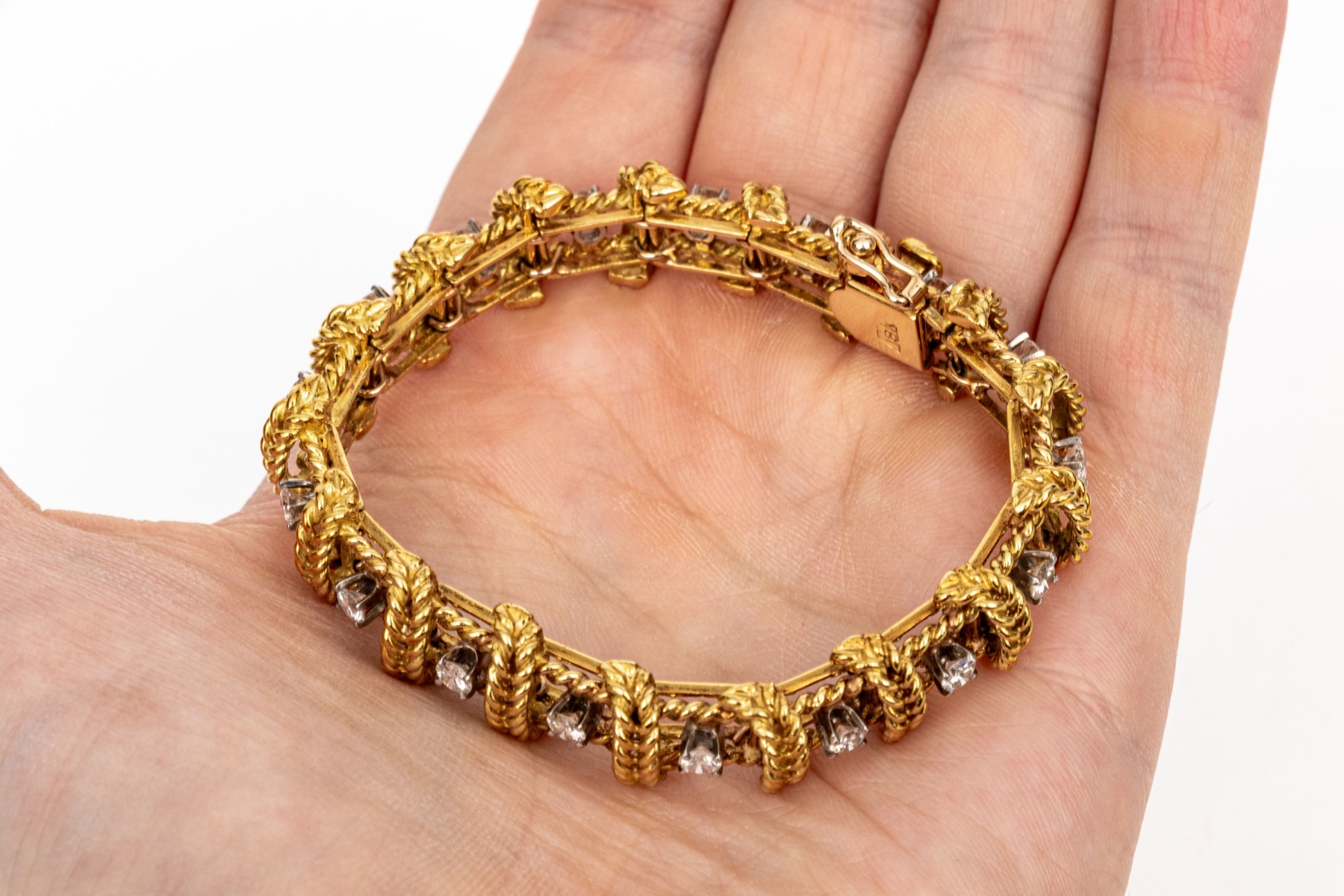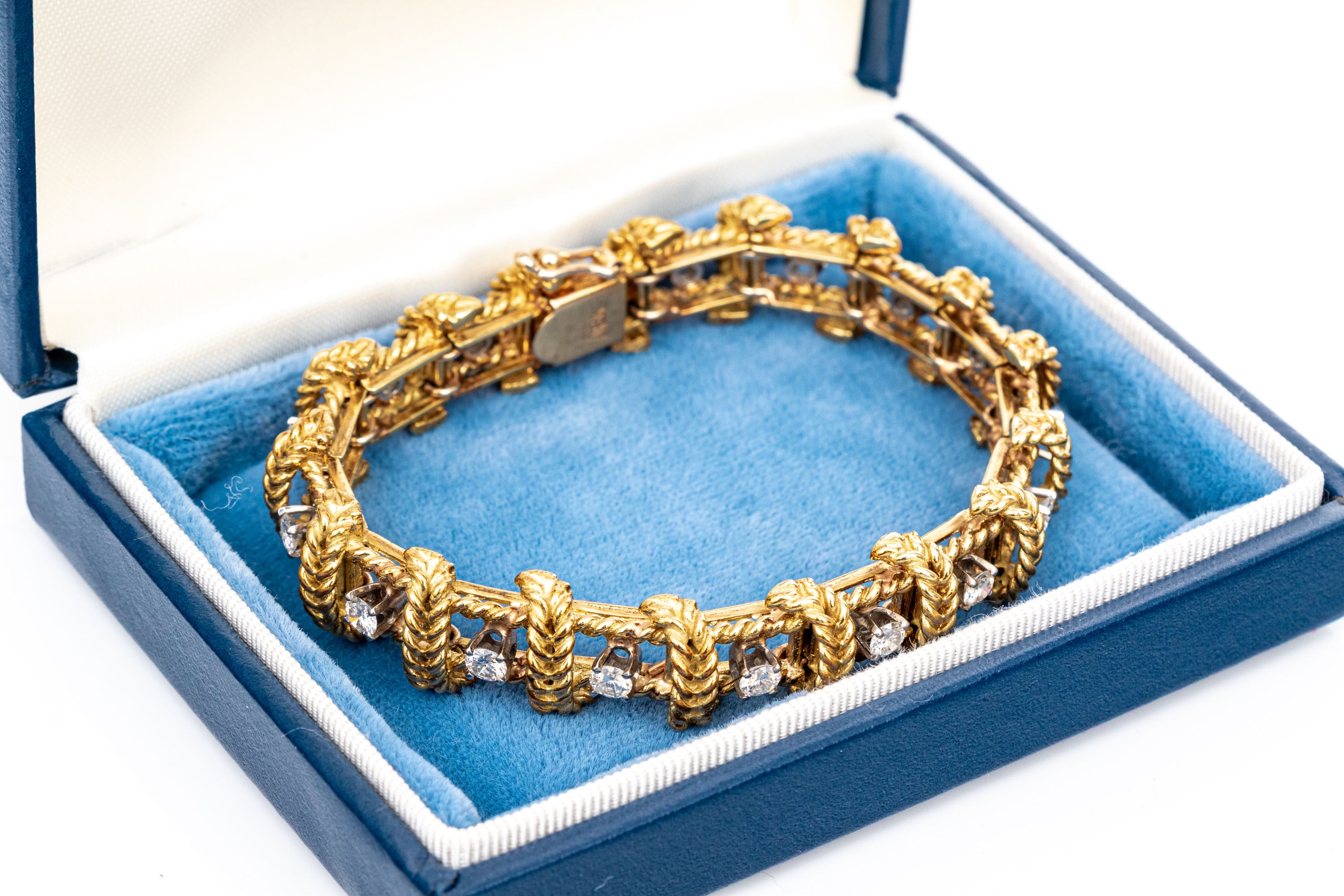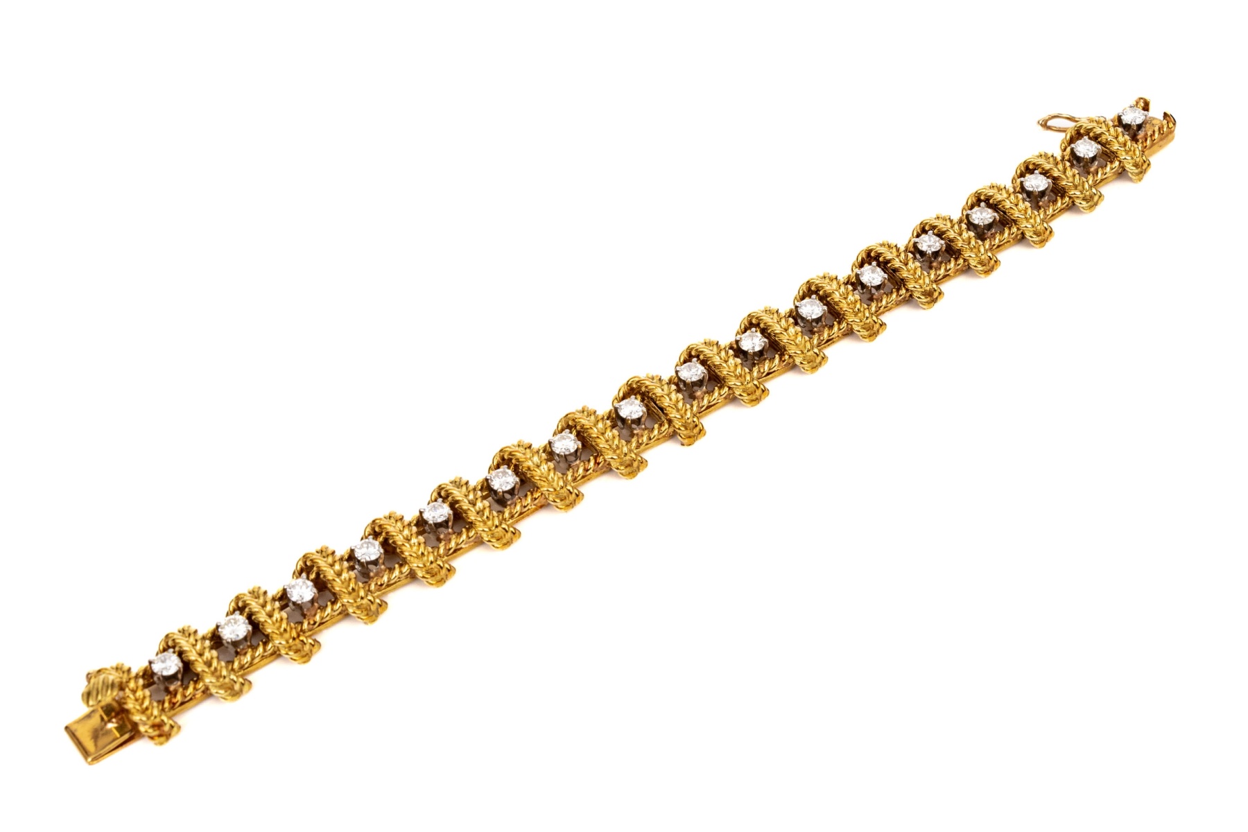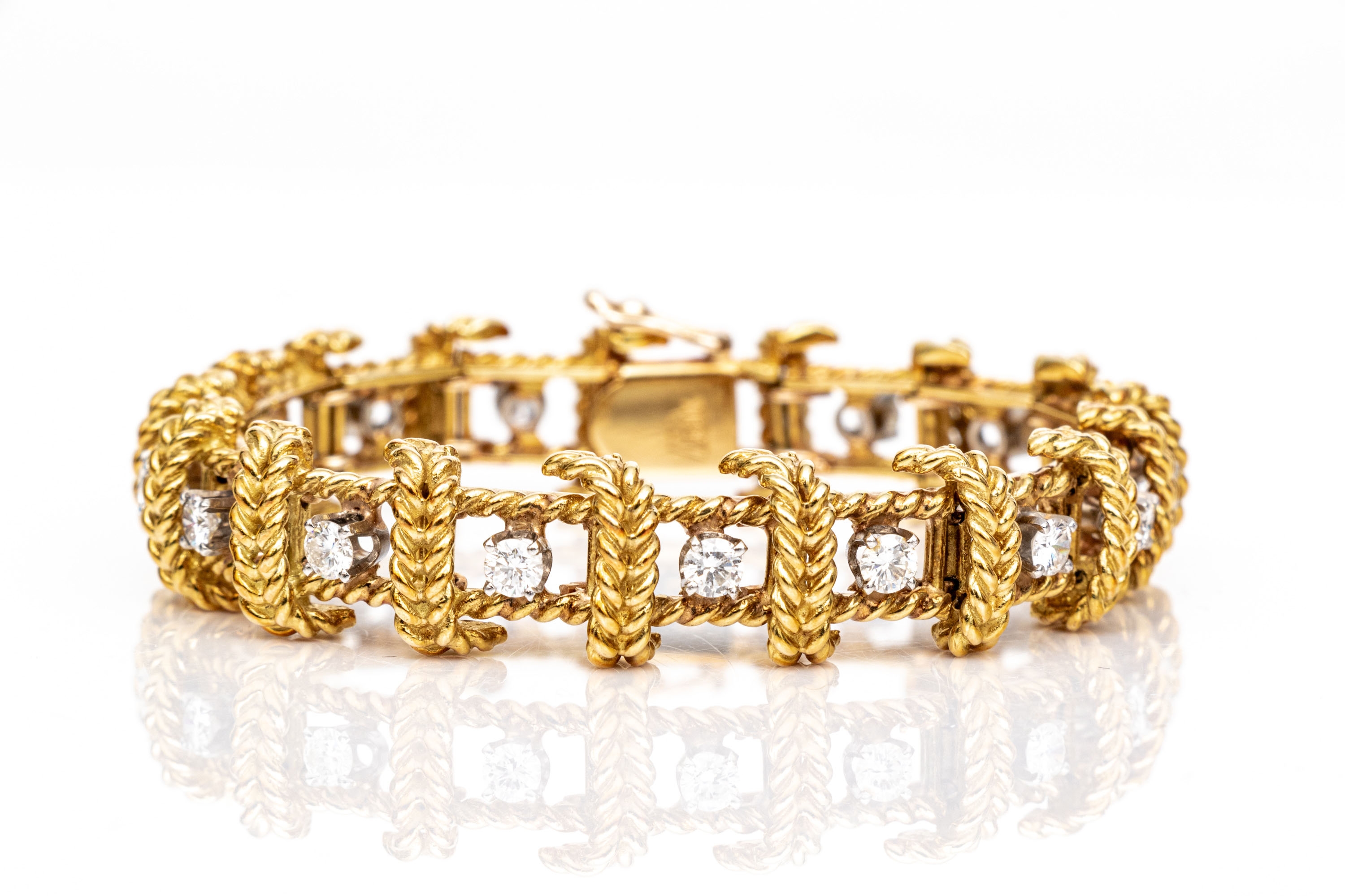 18k yellow gold stunning vintage diamond set rope motif bracelet, app. 2.38 TCW, ranging from VS1 to SI1, prong set. Finished with a hidden box style clasp and a figure eight style safety. Please note length, slightly short.