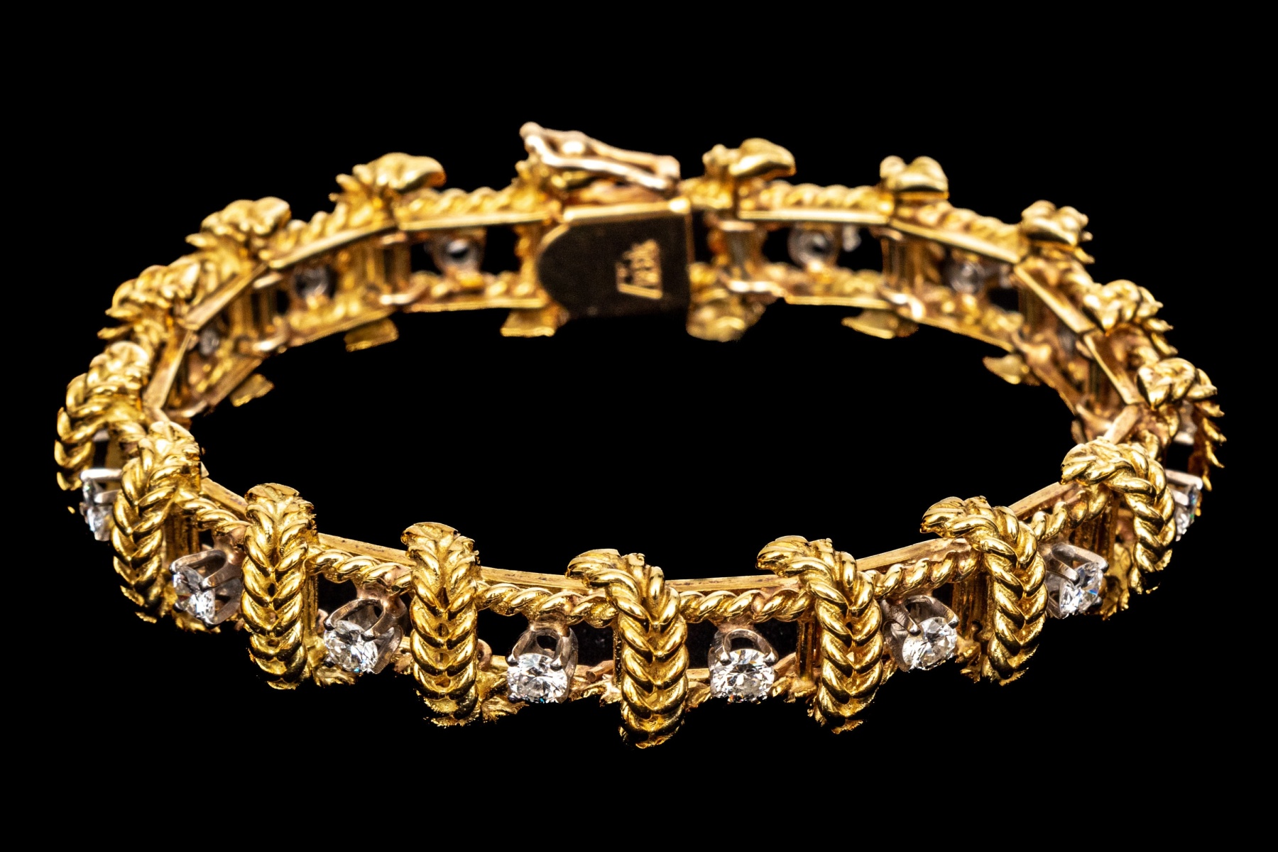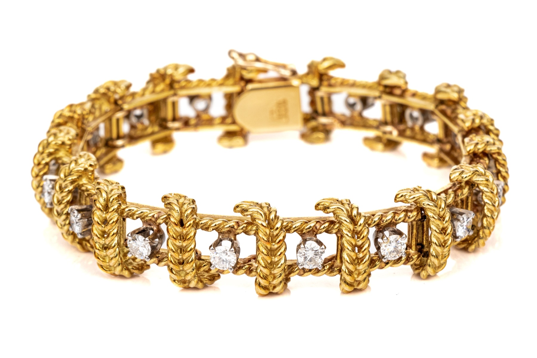 18k yellow gold stunning vintage diamond set rope motif bracelet, app. 2.38 TCW, ranging from VS1 to SI1, prong set. Finished with a hidden box style clasp and a figure eight style safety. Please note length, slightly short.