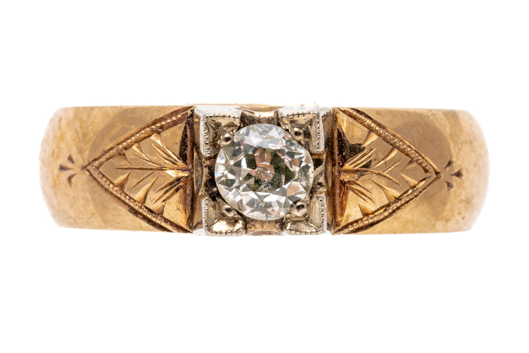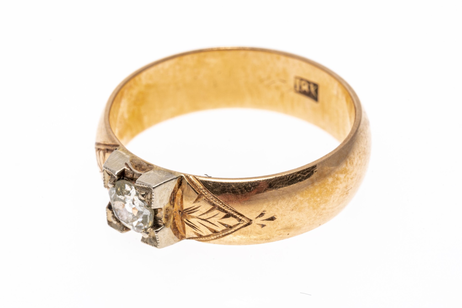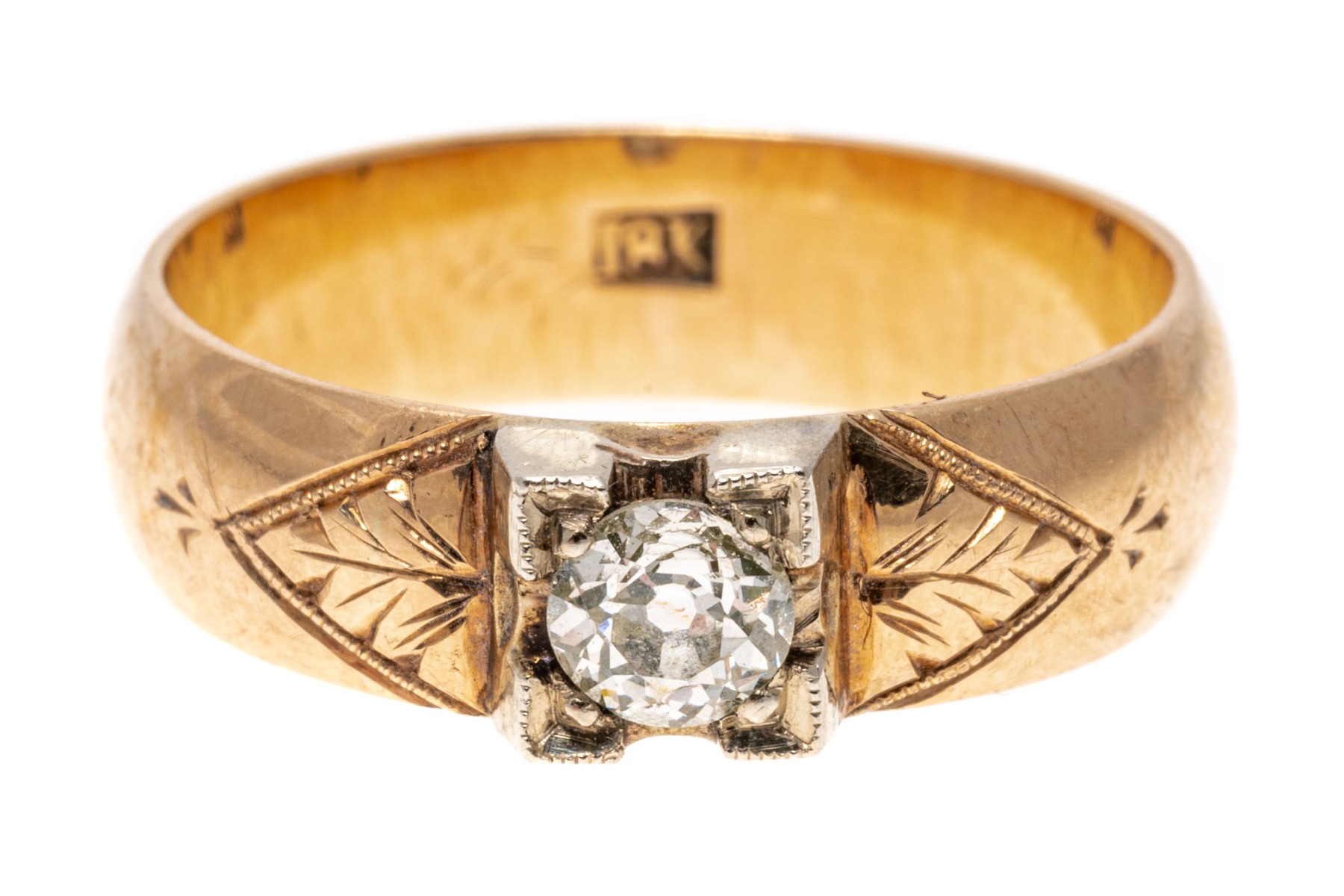 18k yellow gold ring. This pretty vintage yellow gold ring is a band style, decorated on the top with a European cut diamond, approximately 0.31 CTS, in an illusion setting, and flanked by chased foliate decorations.