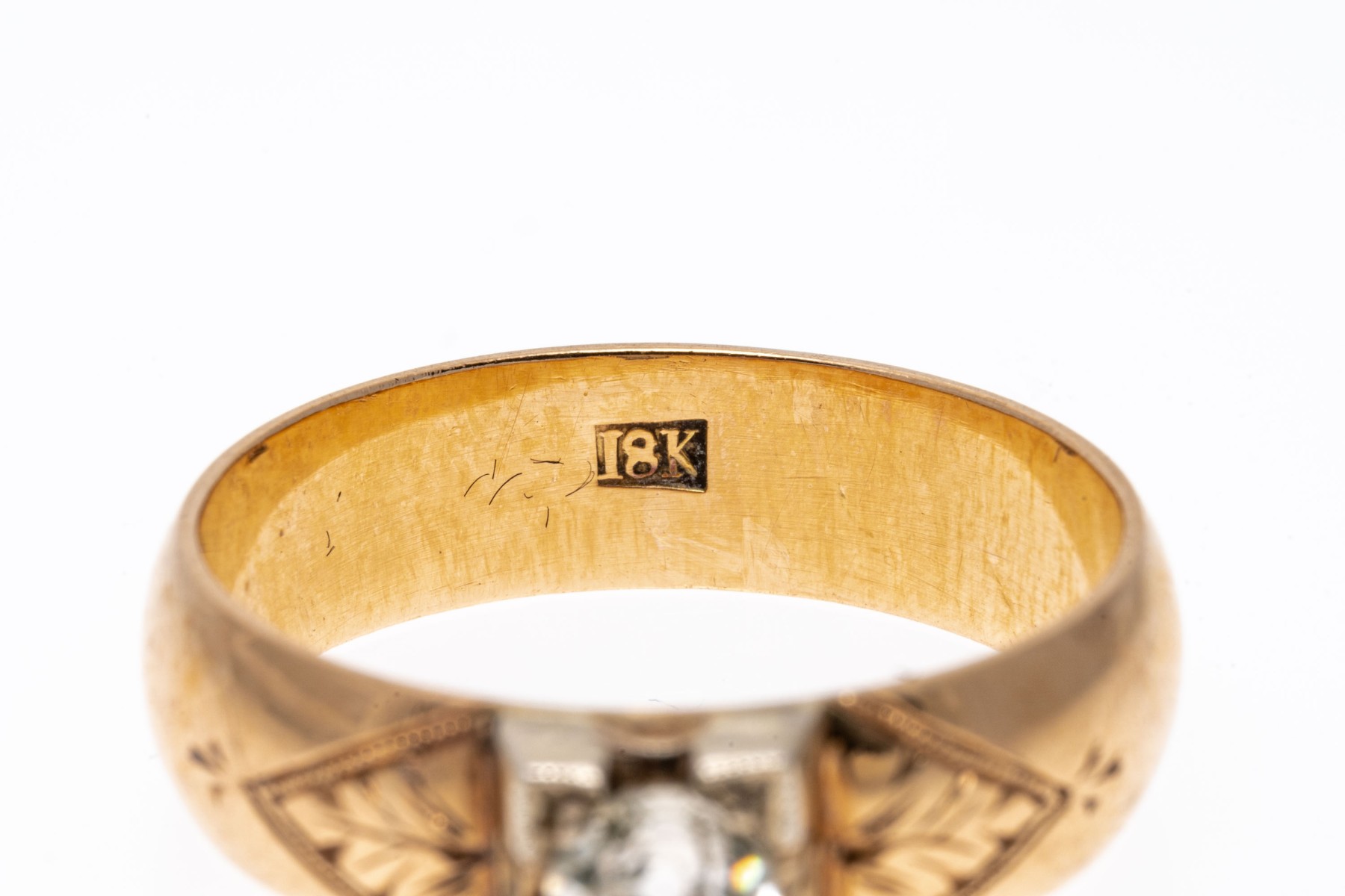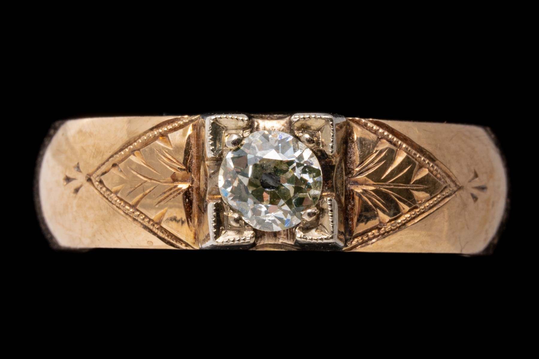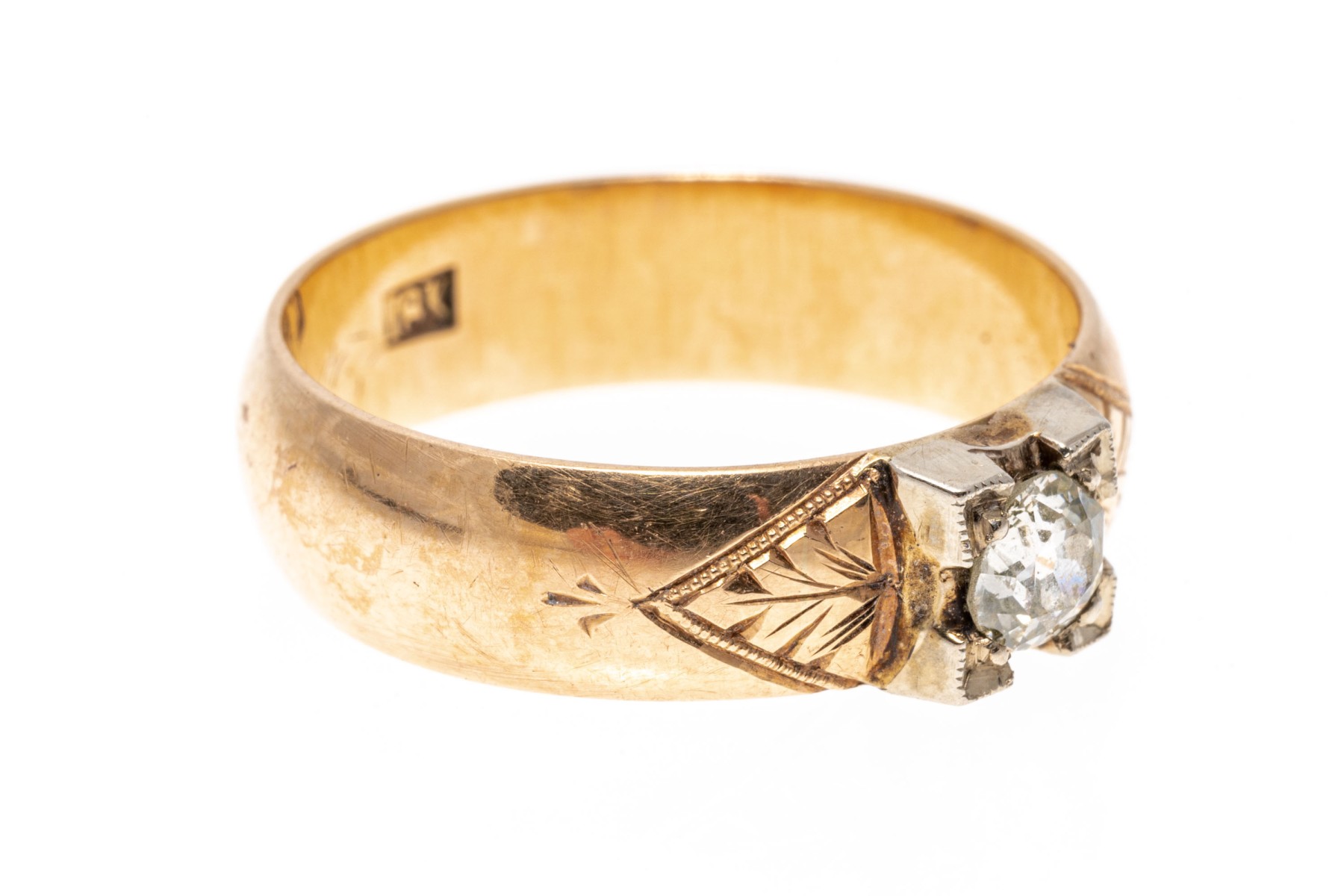 18k yellow gold ring. This pretty vintage yellow gold ring is a band style, decorated on the top with a European cut diamond, approximately 0.31 CTS, in an illusion setting, and flanked by chased foliate decorations.