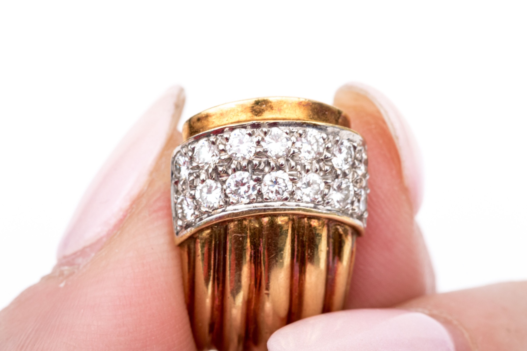18k Yellow Gold Vintage Pave Diamond Topped Ribbed Earrings #466840. Black Rock Galleries provides high end estate liquidation services through online estate auctions and a 50,000 sq ft designer showroom. estate liquidator, estate sale, online auction, antiques, fine art, liquidation, clean outs, auction, consignment, interior design, fine jewelry, collectibles, appraisals, estate appraisals, estate services, decor, furniture, furniture consignment, antique center, consignment shop. We offer appraisal services and specialize in fine art, jewelry, antiques and decorative arts. Sell with us. Black Rock Galleries is the tri-state's largest estate liquidator serving New England and the greater New York City area. We are the trusted source for expert appraisals, auction services, estate sales, and consignments. Black Rock Galleries is the east coast's largest and most trusted estate liquidator, with locations in Connecticut, greater Boston, MA and Raleigh, NC, Fairfield, Southport, Apex, TX. We are the best source for expert appraisals, auction services, estate sales and consignments. We have served thousands of families and estates with compassion, professionalism and expertise. BRG works with attorneys, executors, realtors and families to bring the greatest return on personal and estate property in the current market. Our unique combination of services make us the easy choice to get the job done in a timely and stress-free manner. We are with you from the initial consultation to the final clean out. Our house-built online auction software platform offers clients a dynamic approach to liquidating their personal property. This venue is most successful in bringing the best return with the least amount of disruption for our clients. See our services page for a complete description of this offering. 18k Yellow Gold Vintage Pave Diamond Topped Ribbed Earrings #466840