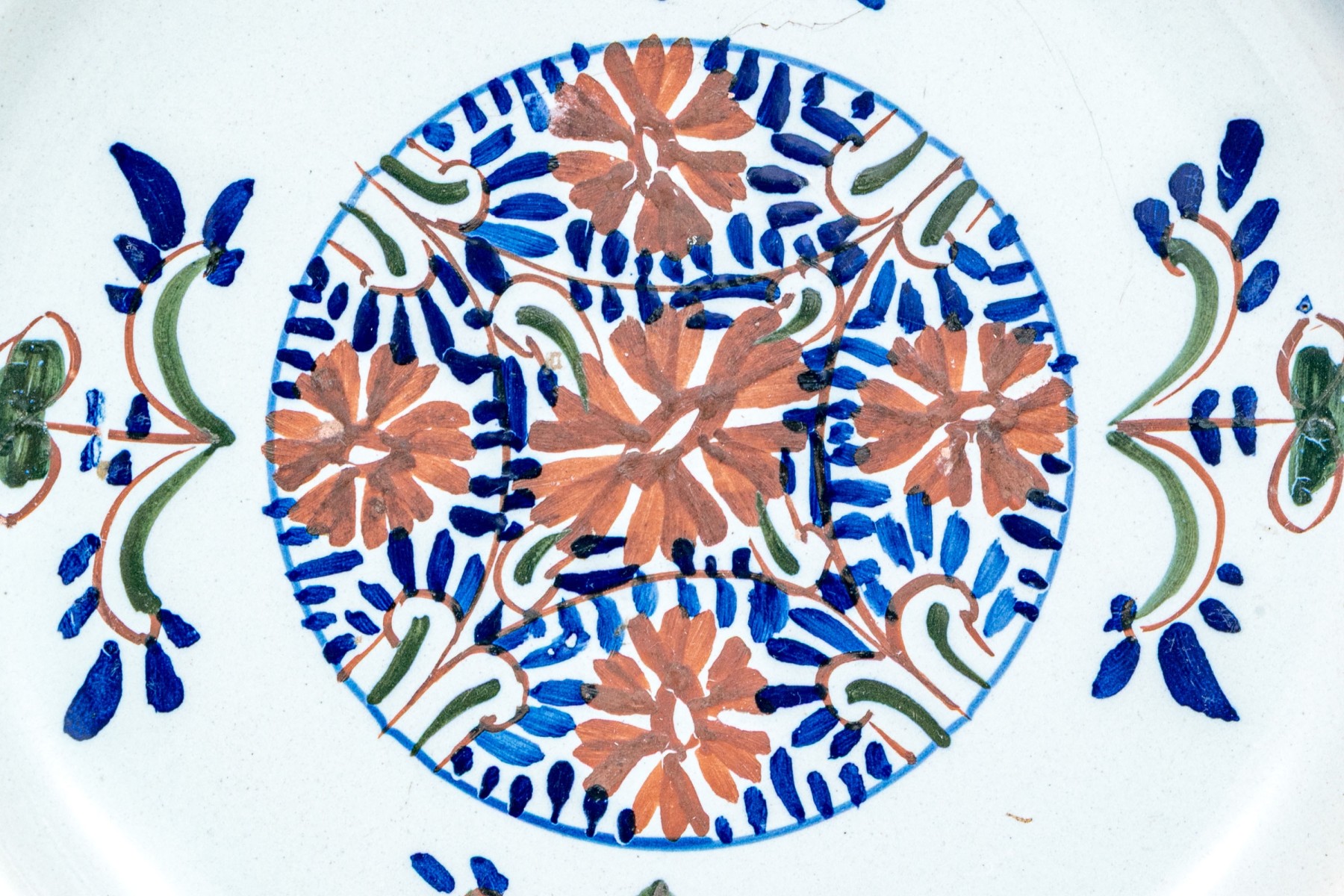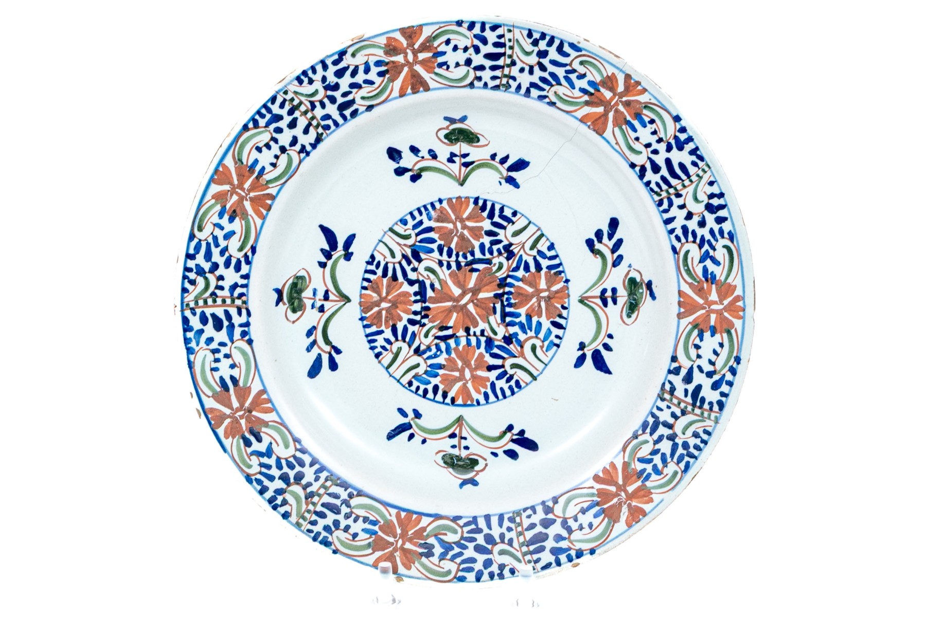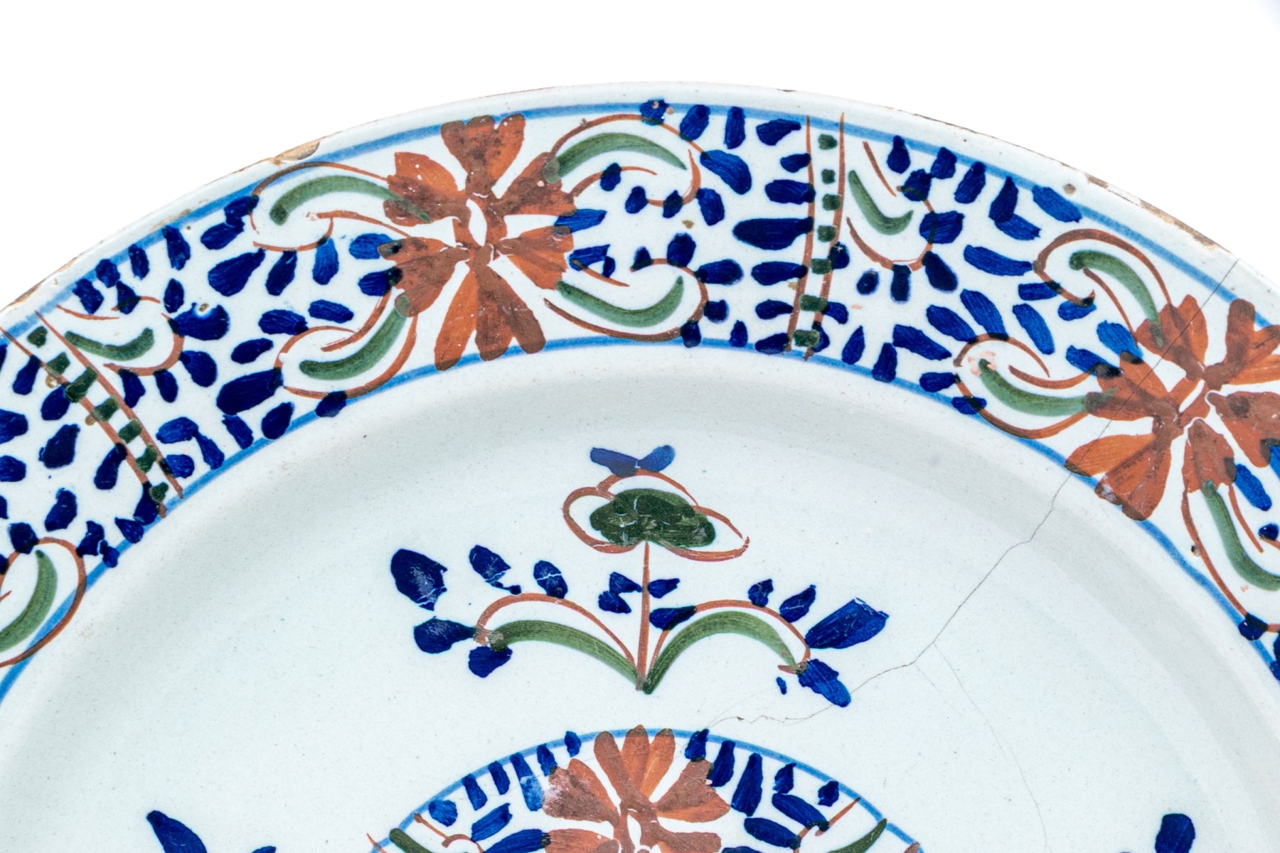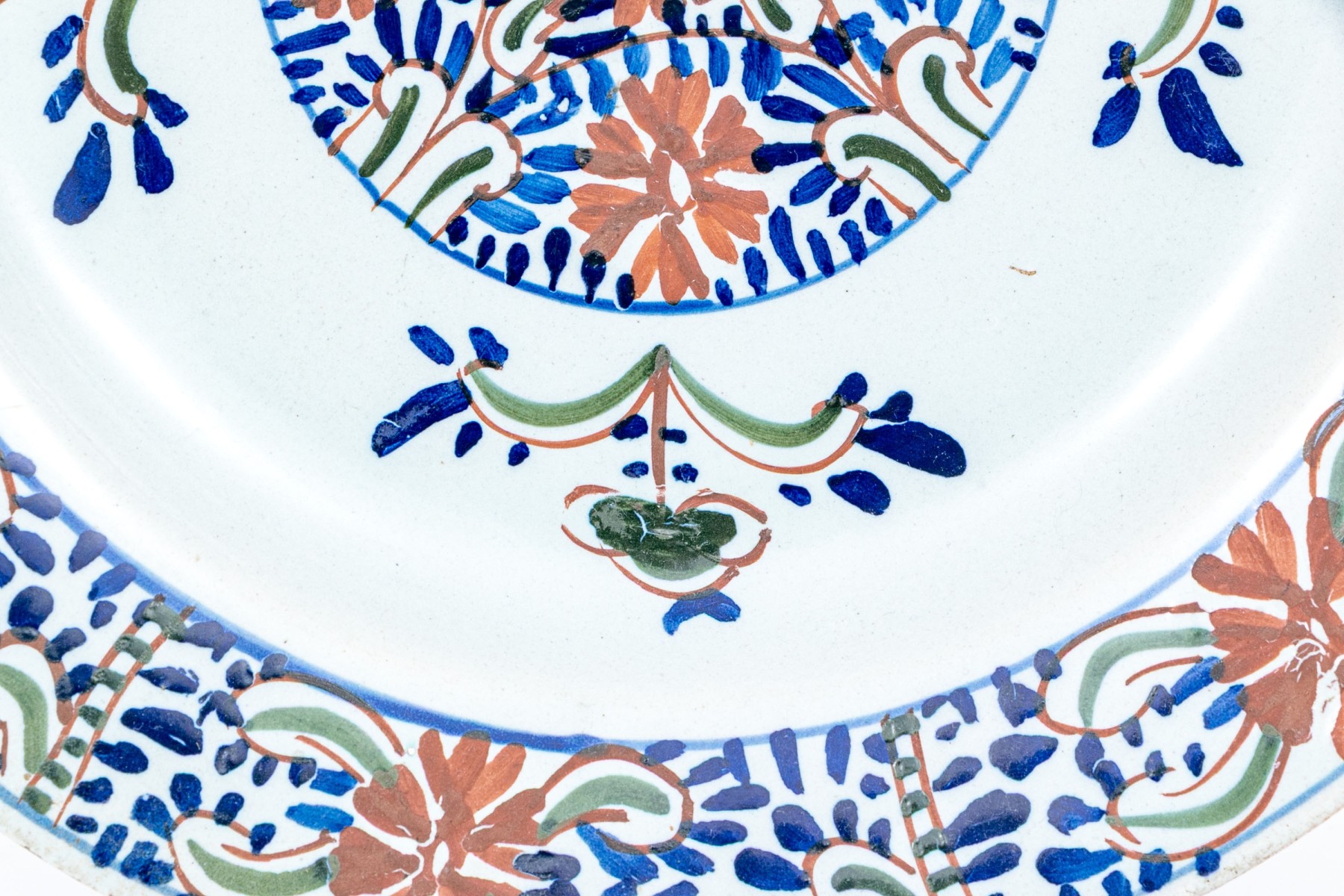 A beautiful antique Delft ceramic plate hand-detailed with a floral medallion center and energetic floral sprays leading to a wonderful rim with orange flowers and green leaves against dappled blue backgrounds.