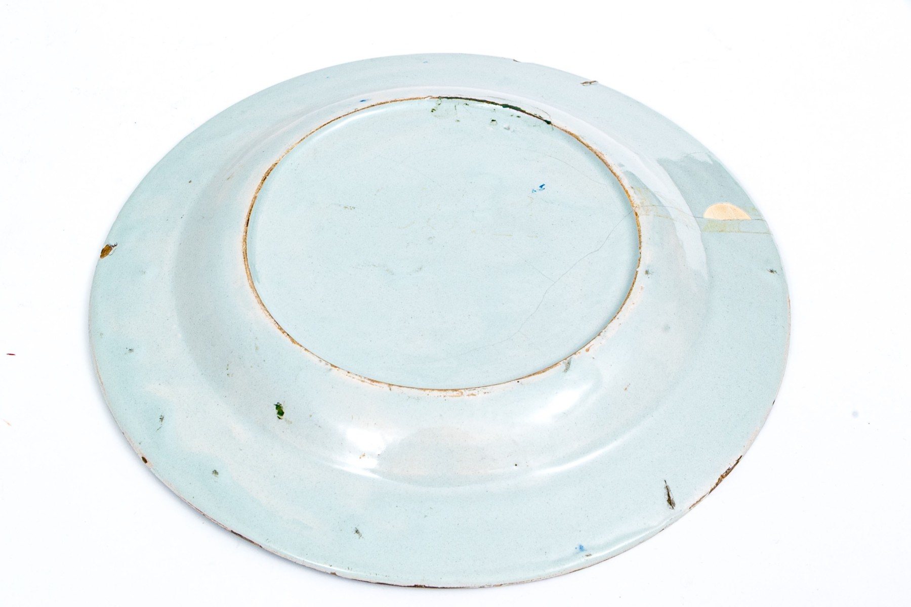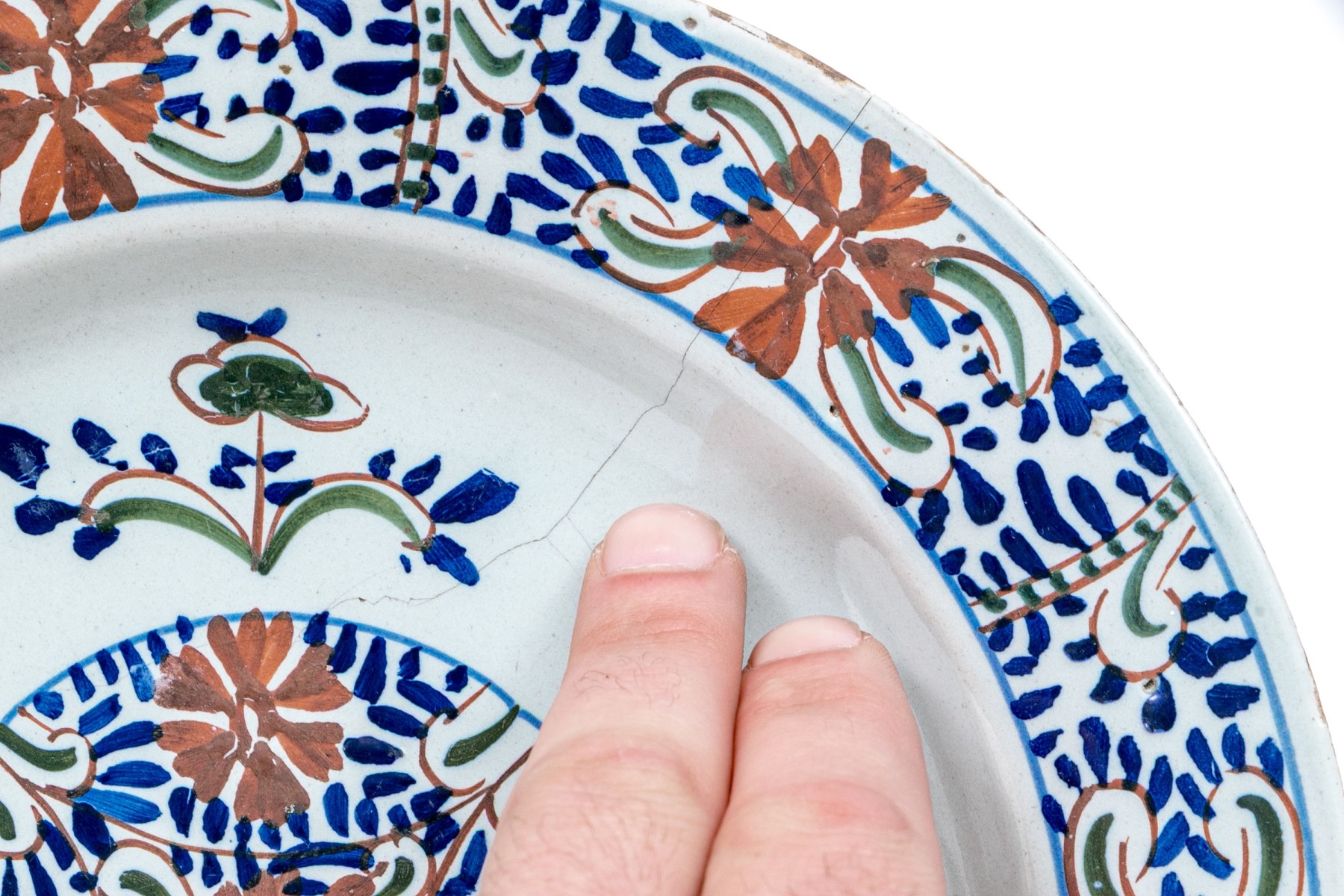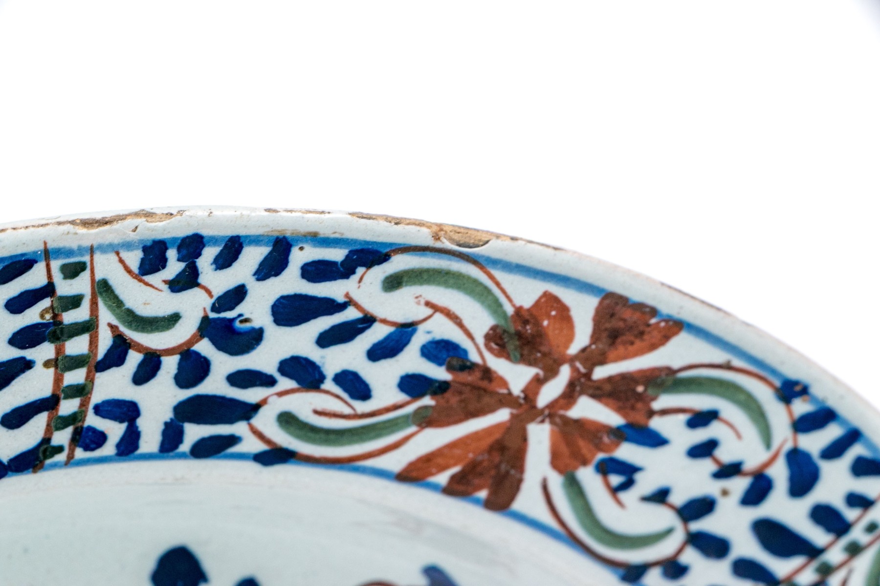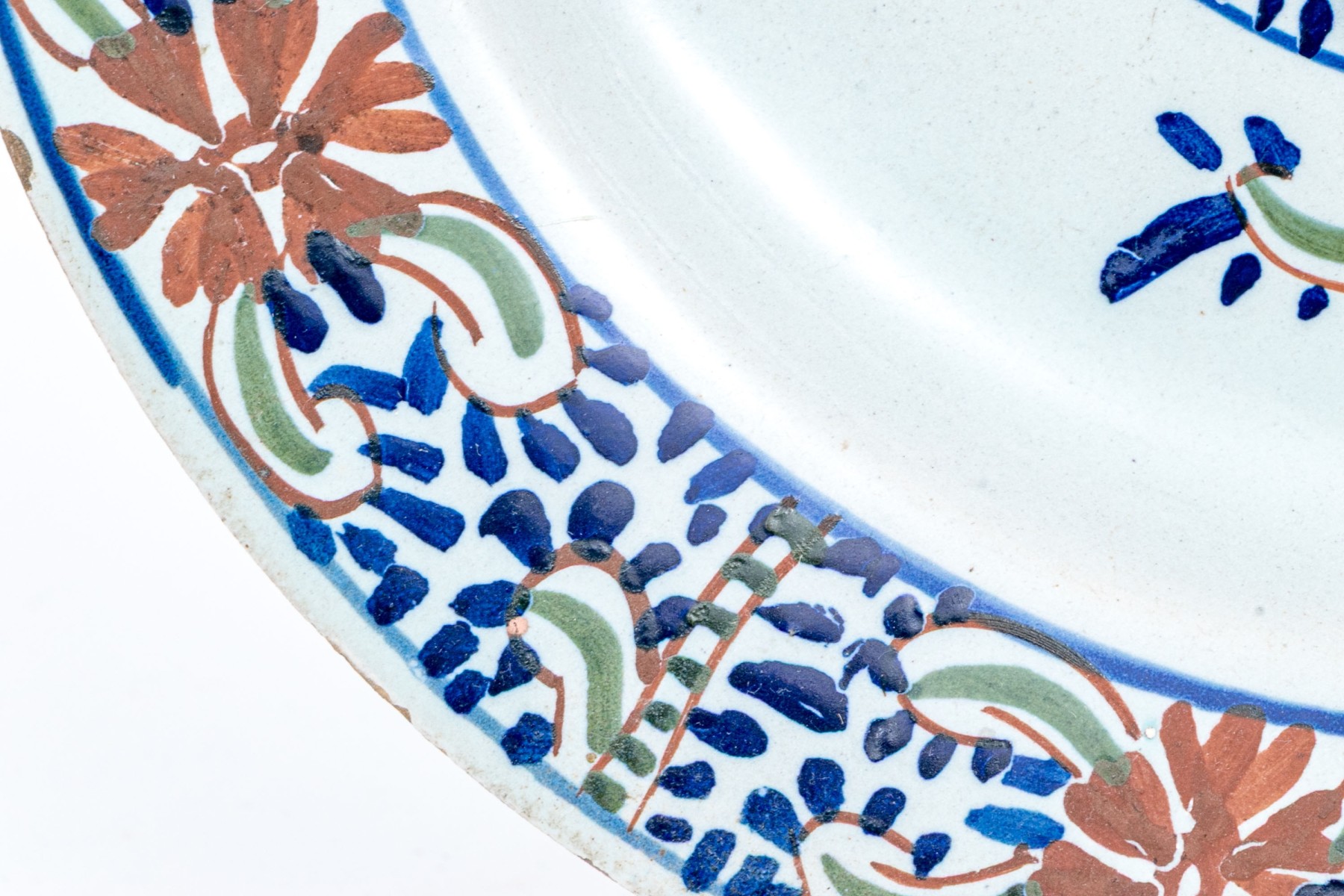 A beautiful antique Delft ceramic plate hand-detailed with a floral medallion center and energetic floral sprays leading to a wonderful rim with orange flowers and green leaves against dappled blue backgrounds.