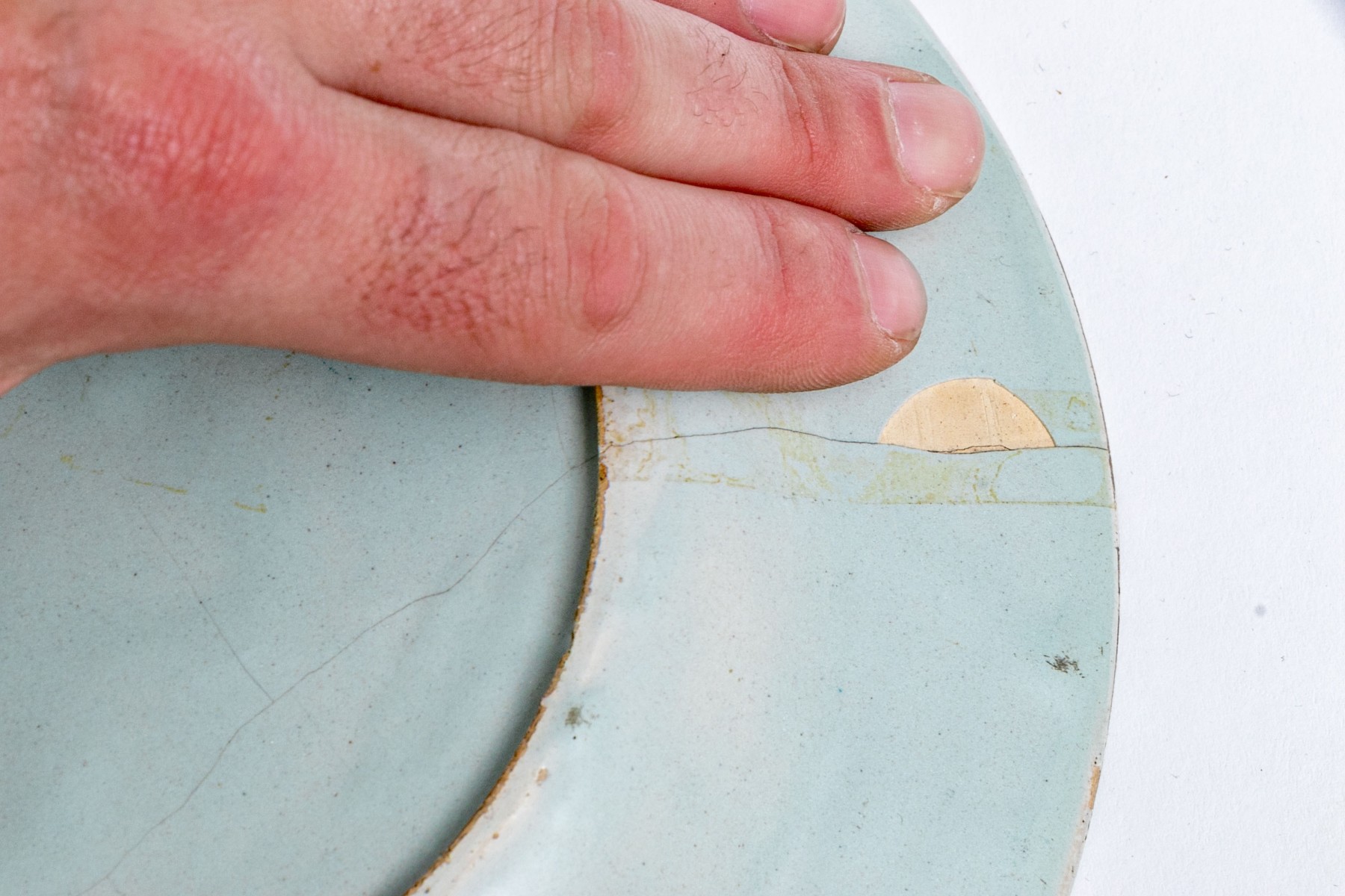 A hairline from the rim to the center and a 3/4" glaze chip to the underside but overall presents well.