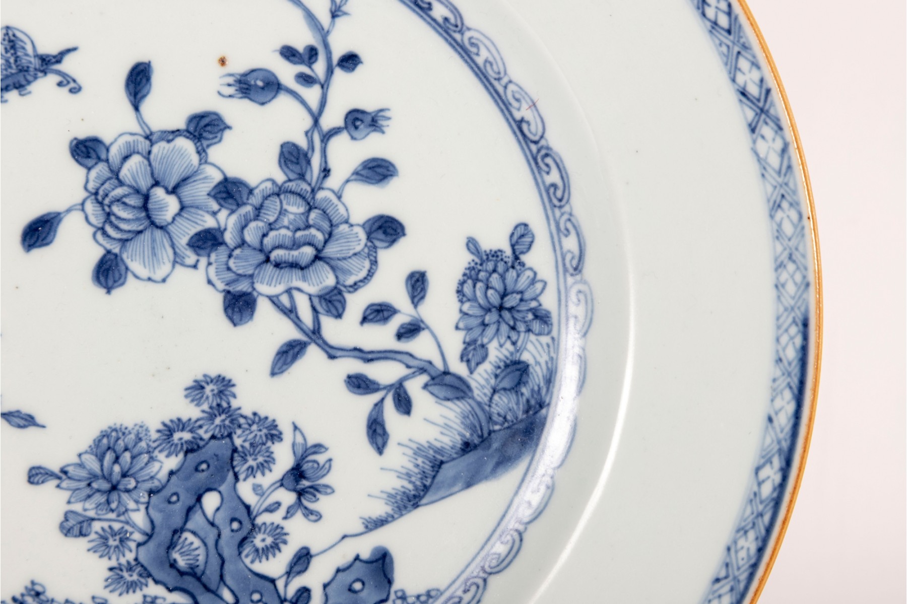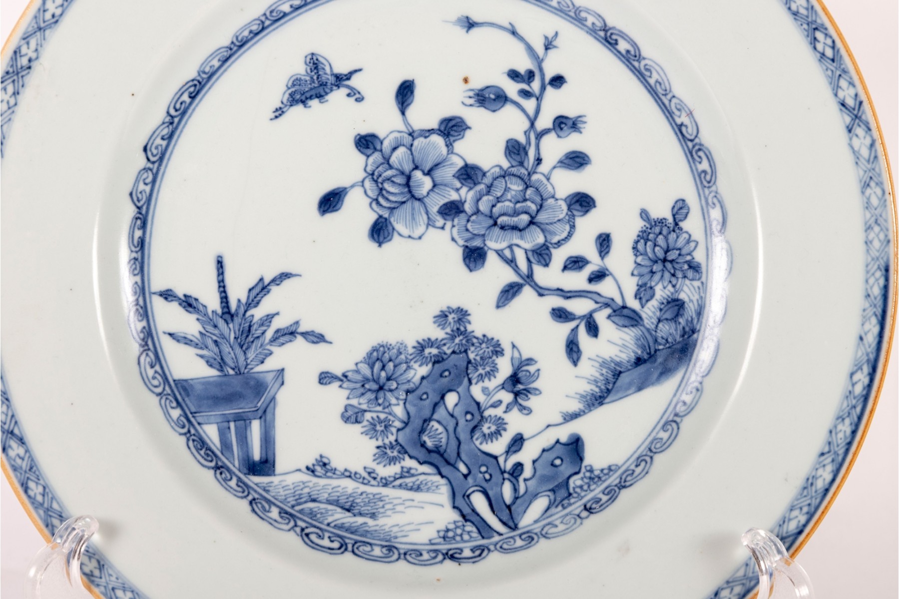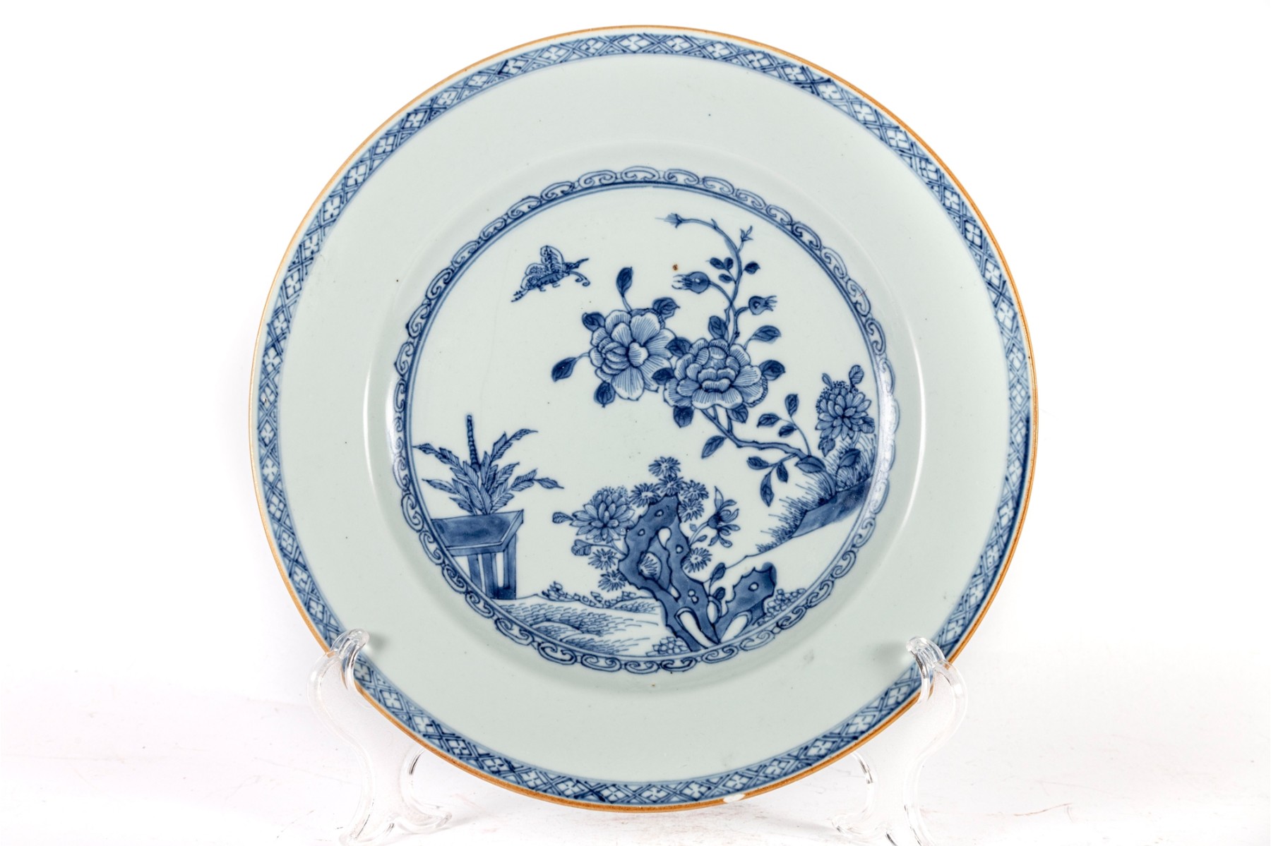 An 18th century 10" Chinese blue and white porcelain plate, finely decorated with flowering branches, a butterfly, and a minimalist landscape scene within a patterned border.