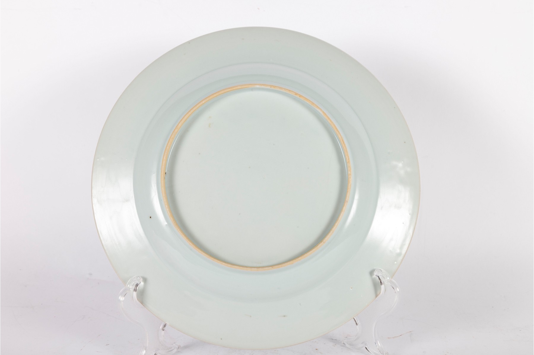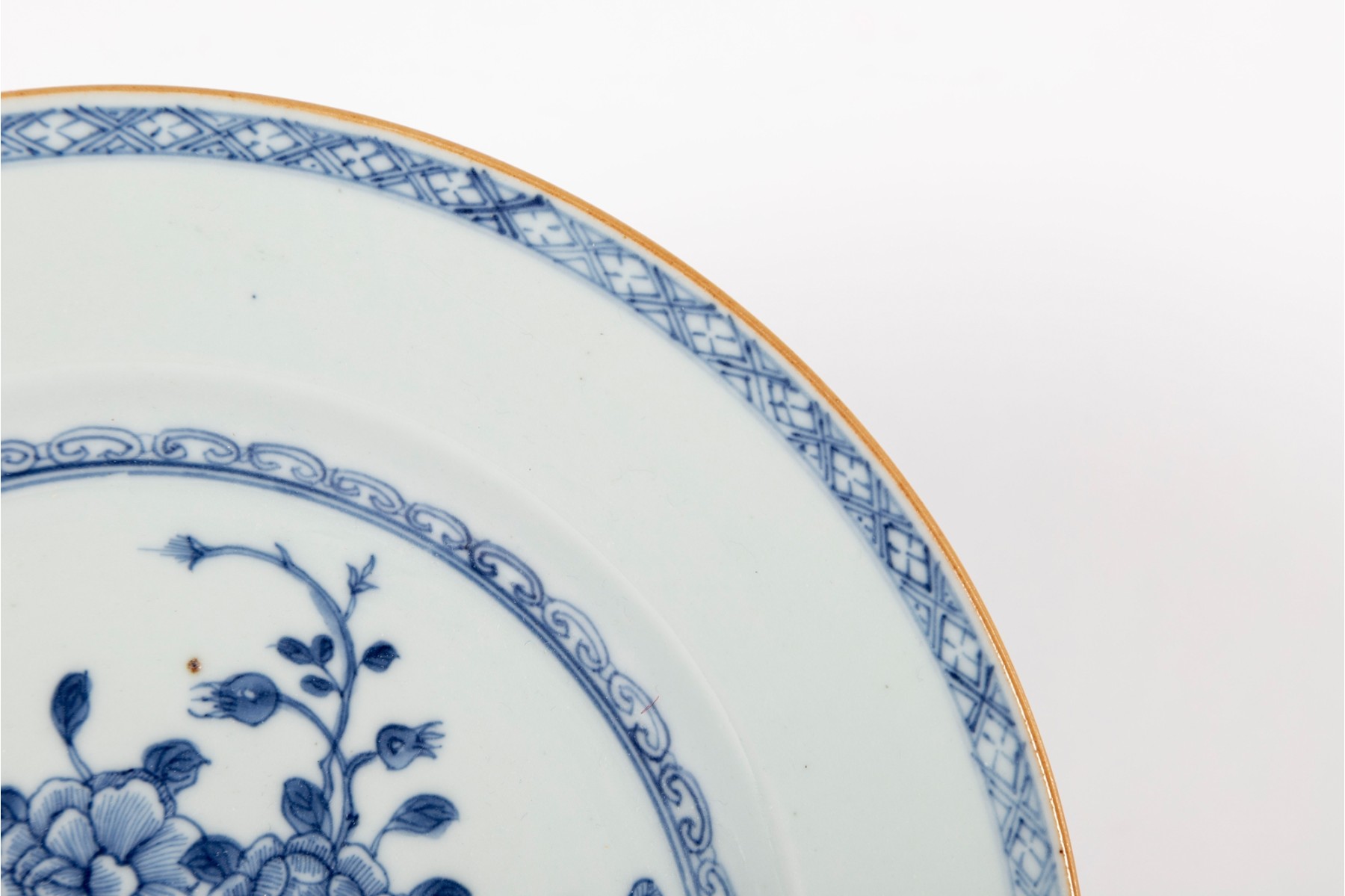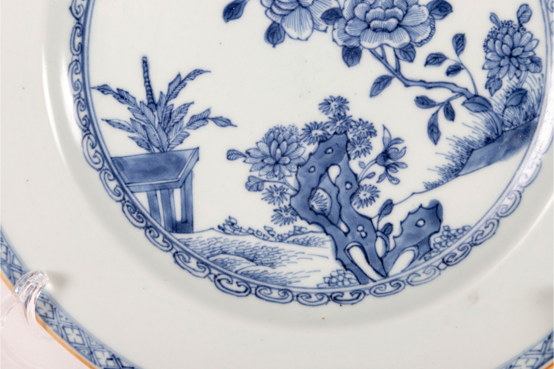 An 18th century 10" Chinese blue and white porcelain plate, finely decorated with flowering branches, a butterfly, and a minimalist landscape scene within a patterned border.