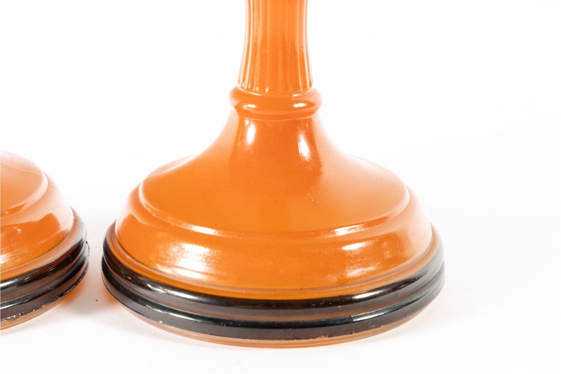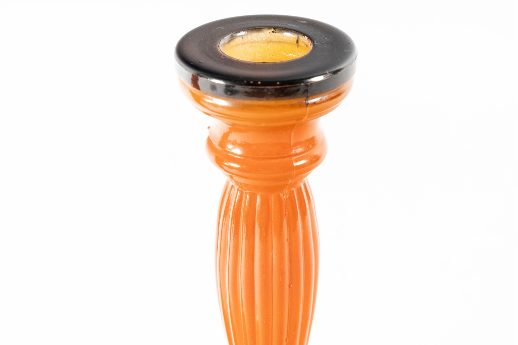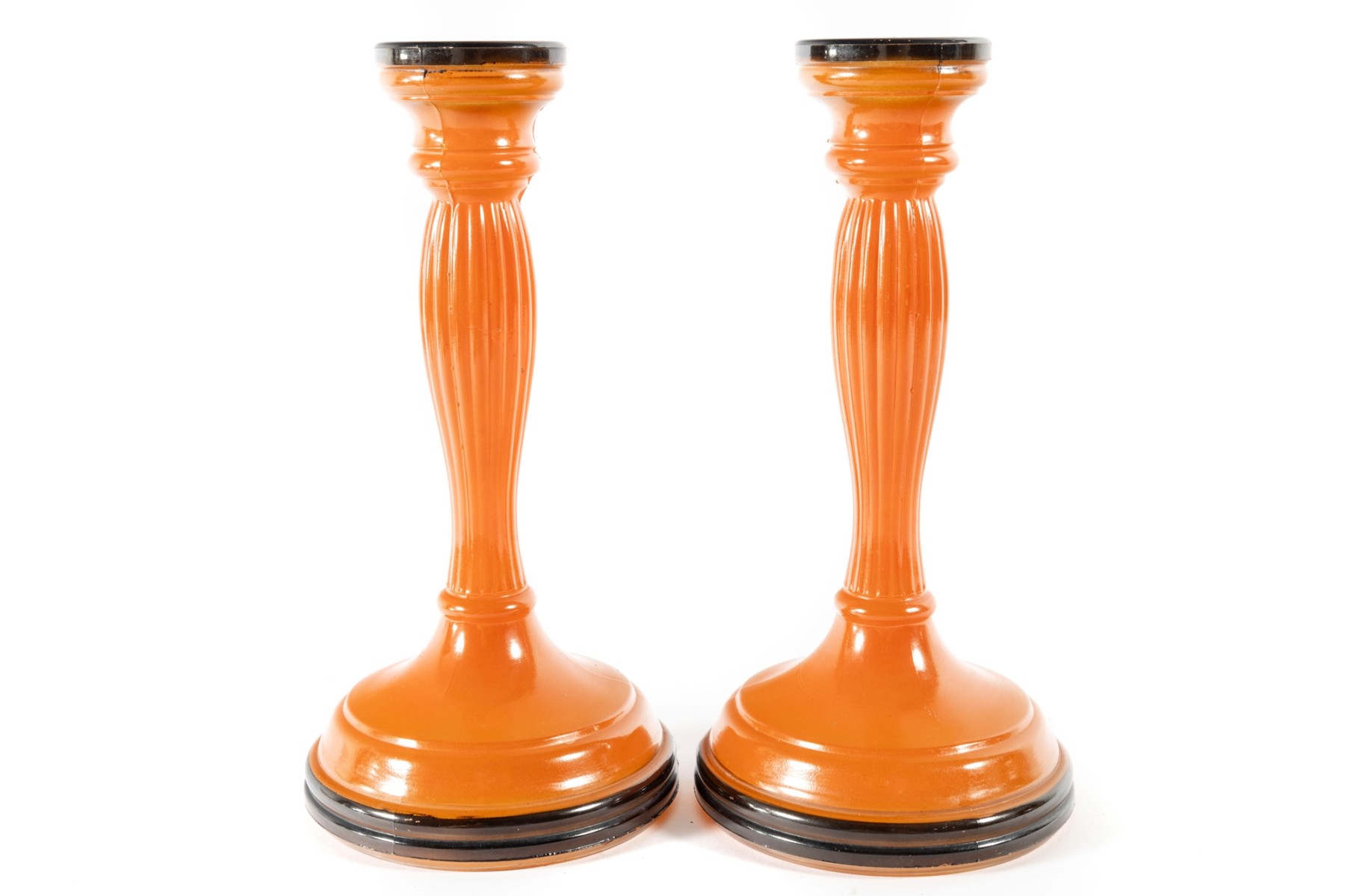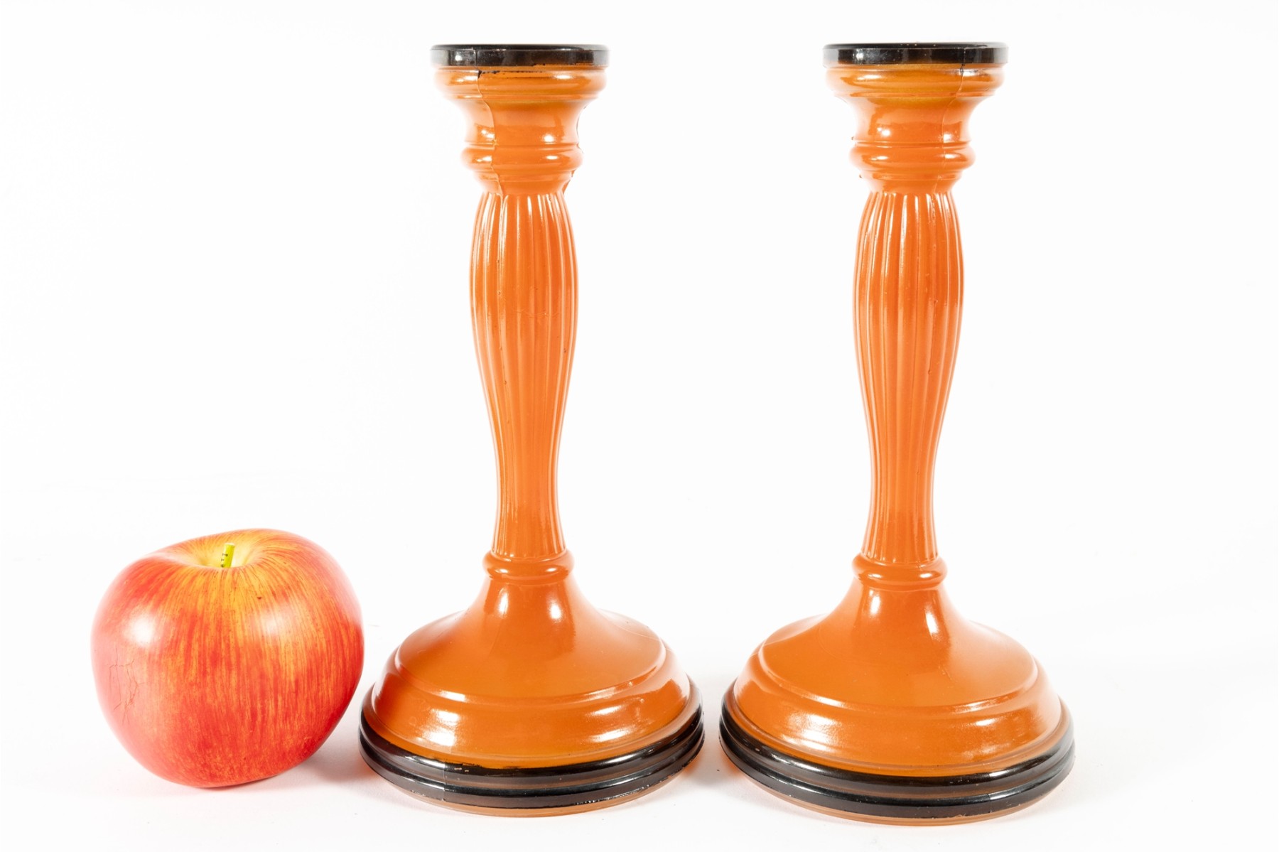 A pair of 1920's Czechoslovakian sandwich glass candlesticks tinted orange with black trim.