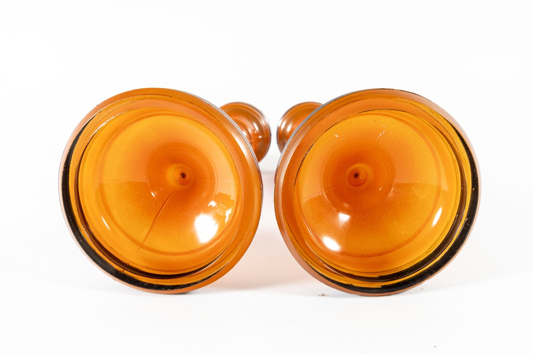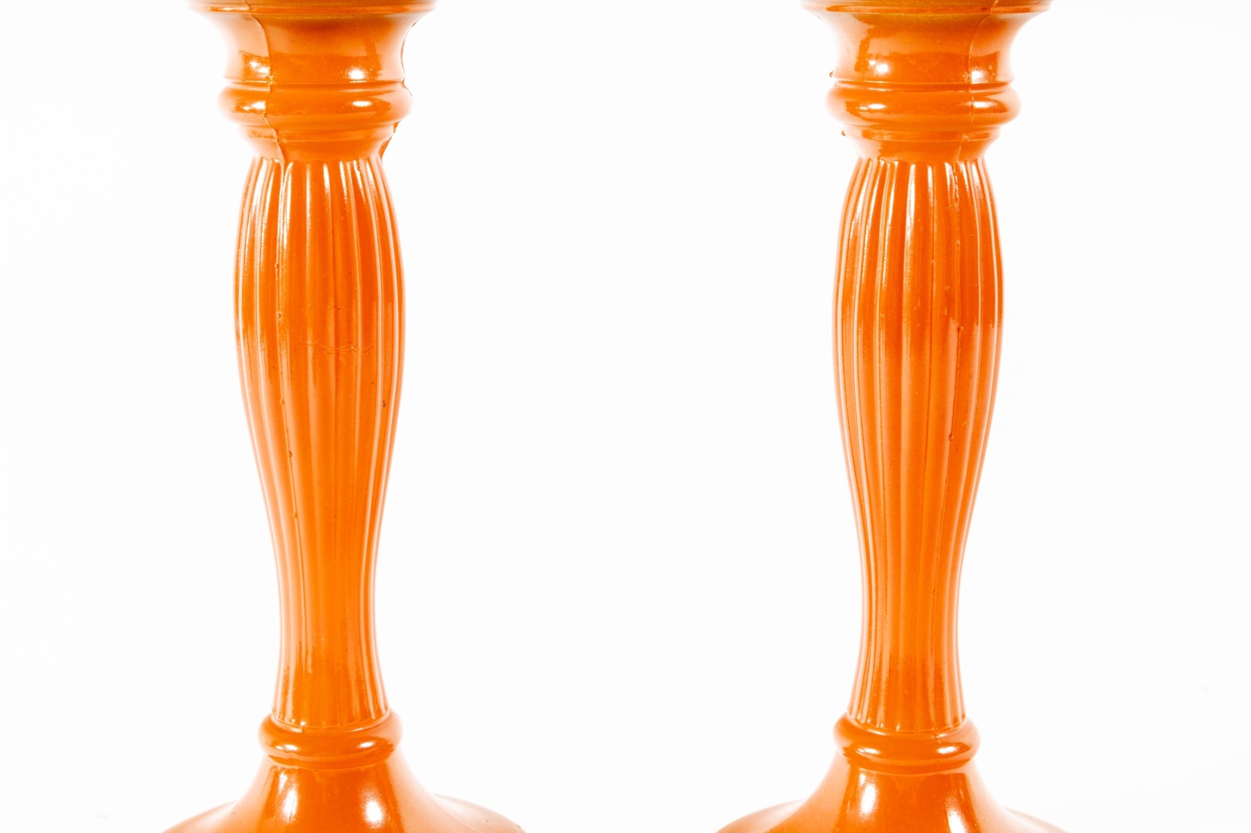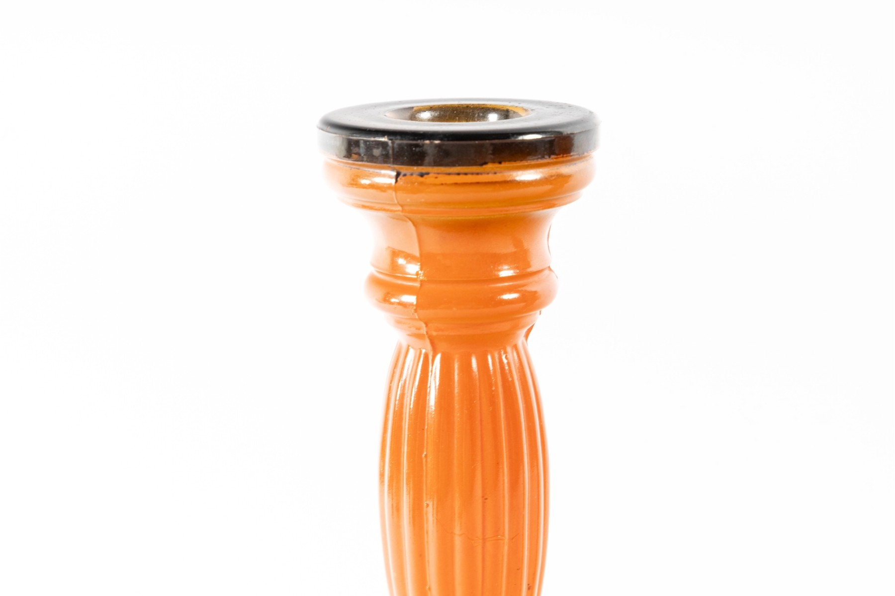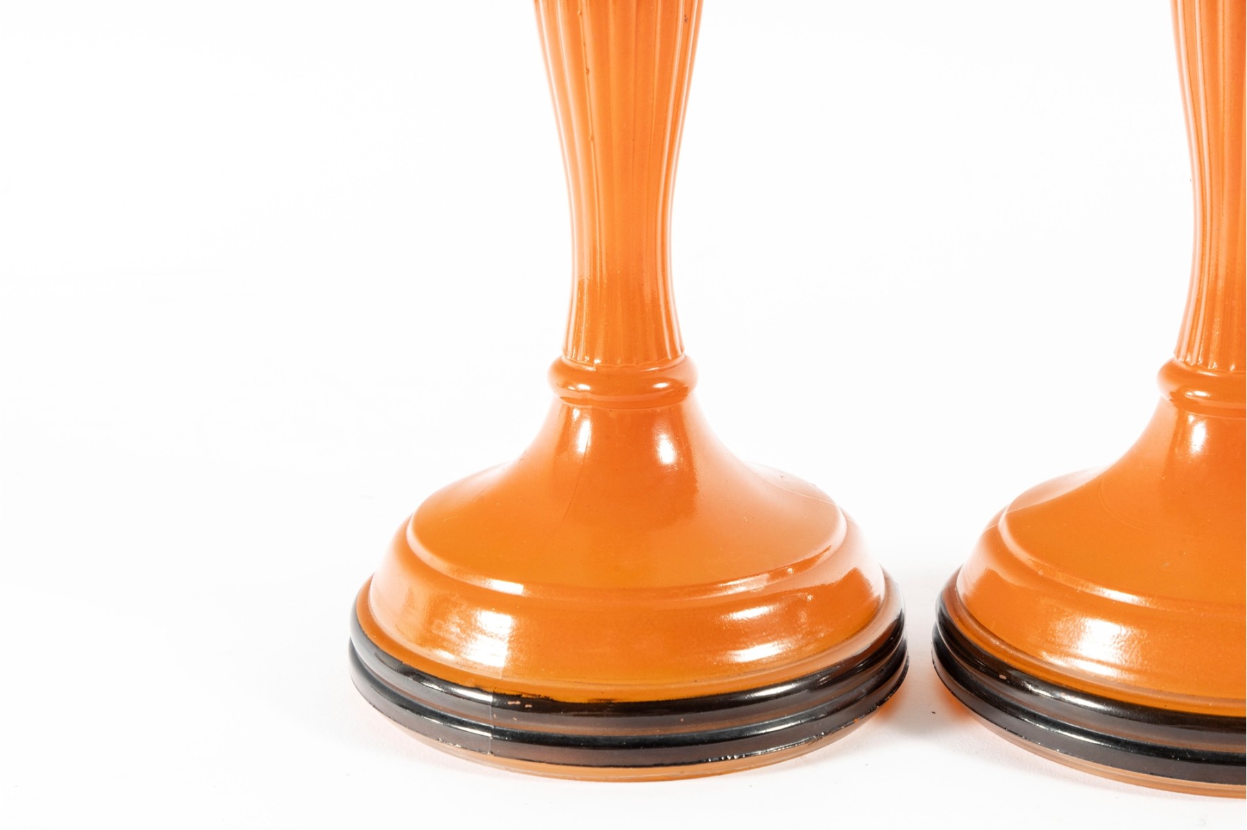 A pair of 1920's Czechoslovakian sandwich glass candlesticks tinted orange with black trim.