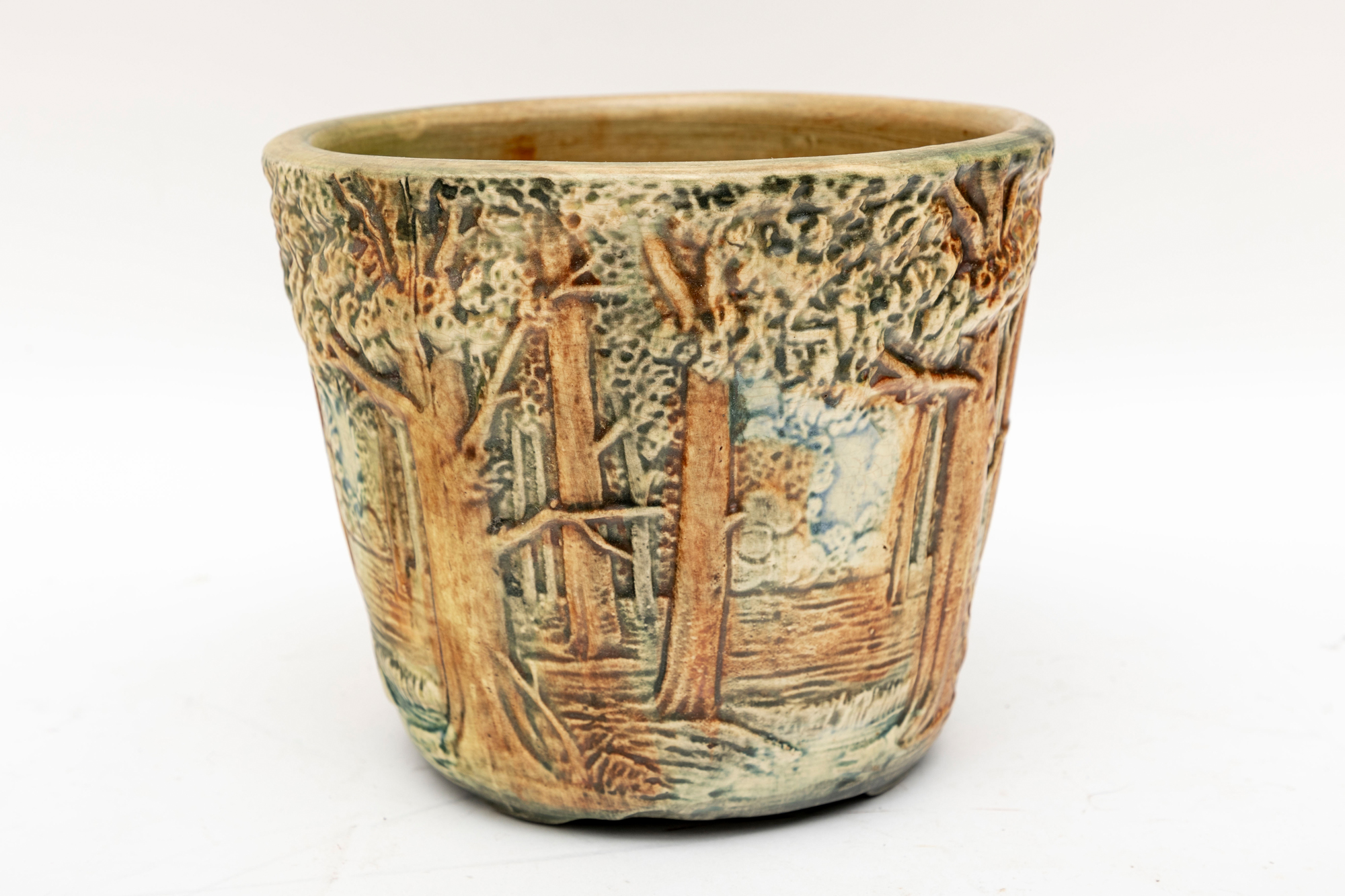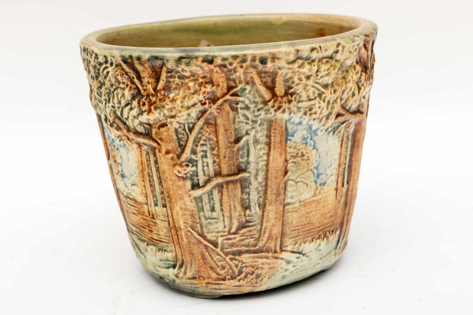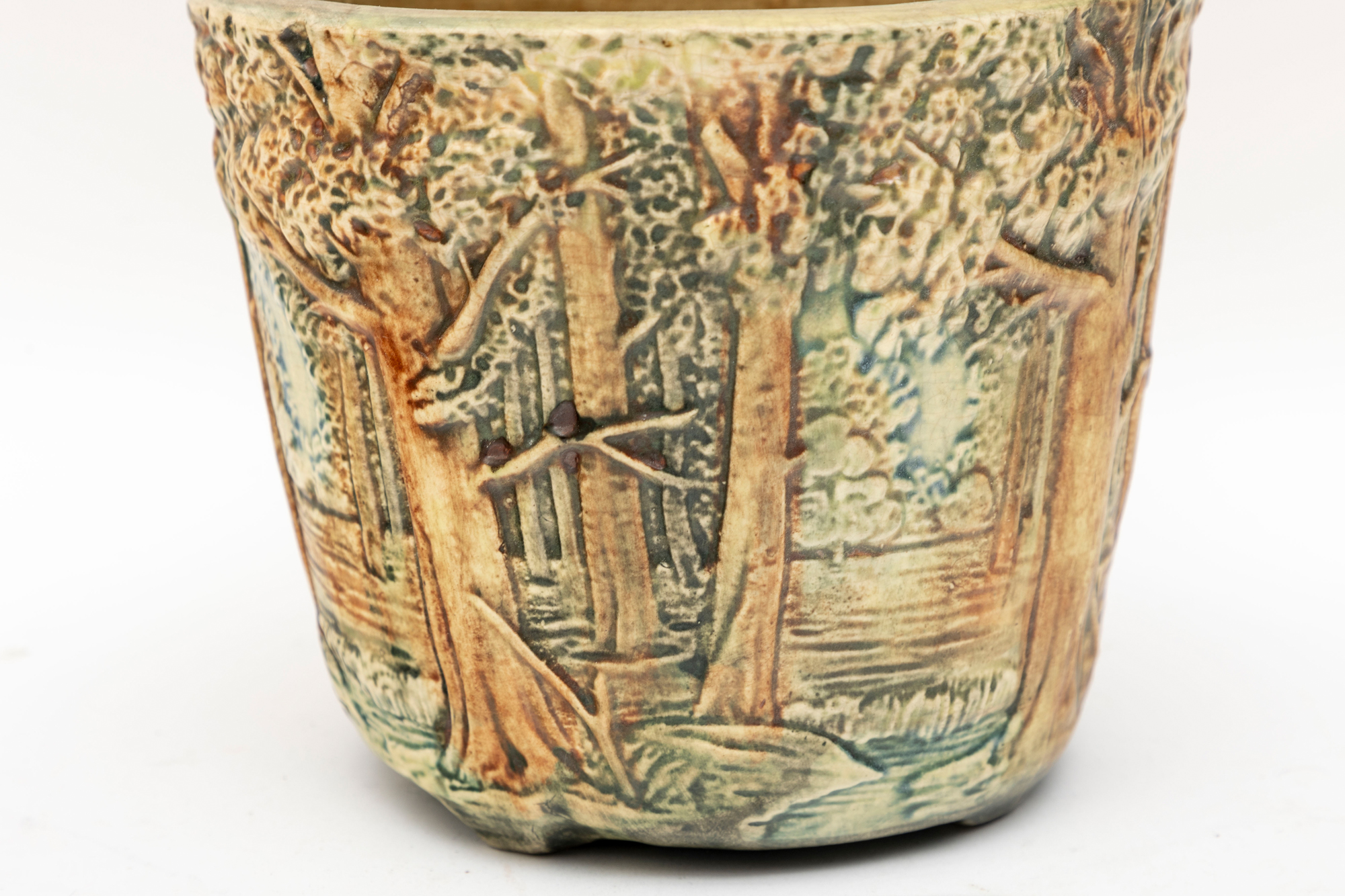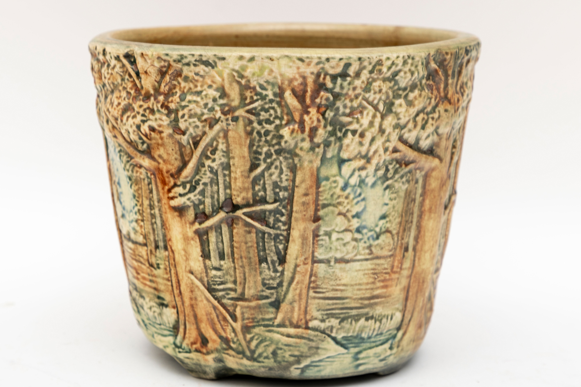 An exceptionally detailed piece of art pottery attributed to the Weller Pottery Company of Zanesville, Ohio. The pattern is entitled "Forest", showcasing a hand-painted landscape set in relief over a jardiniere pot form.