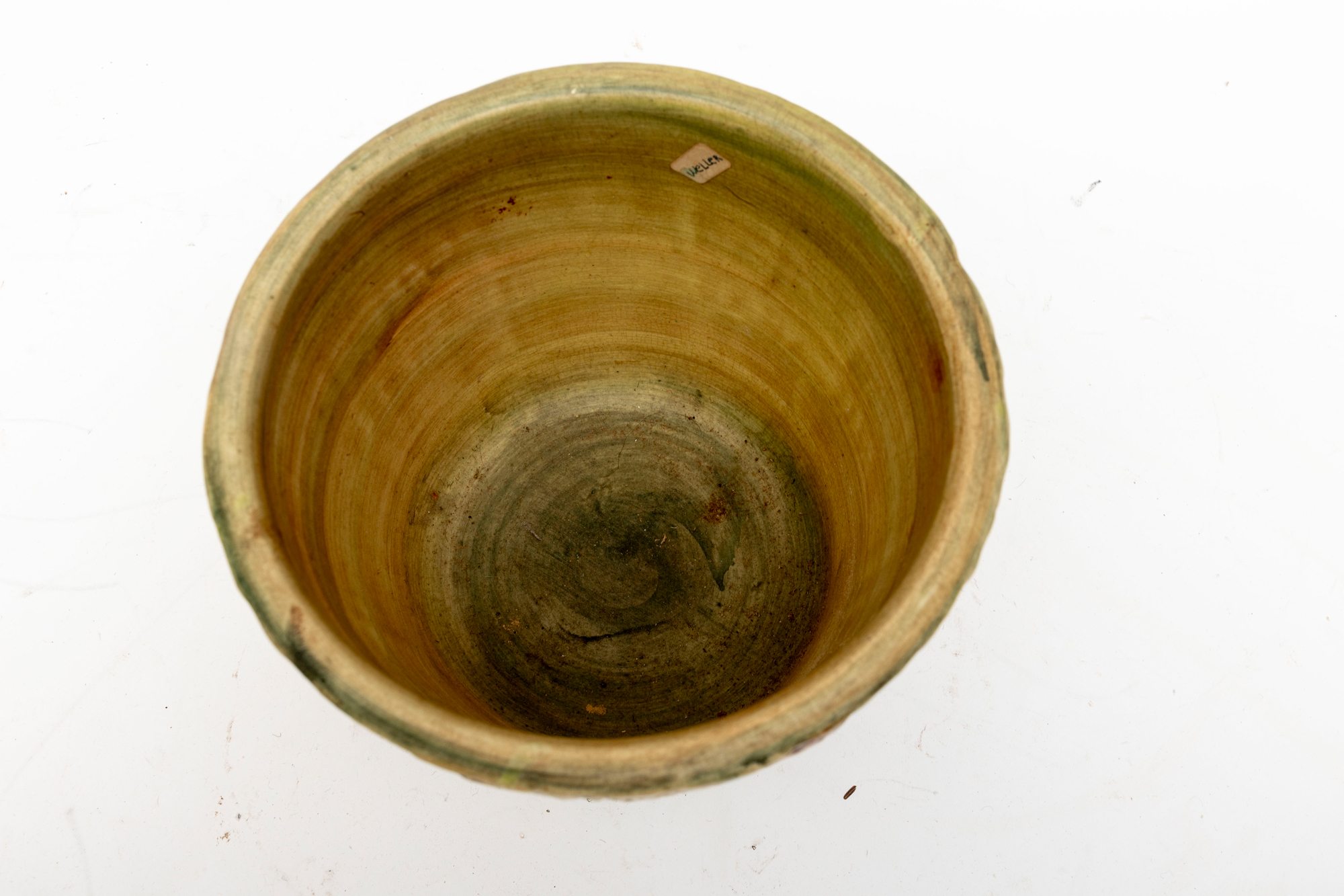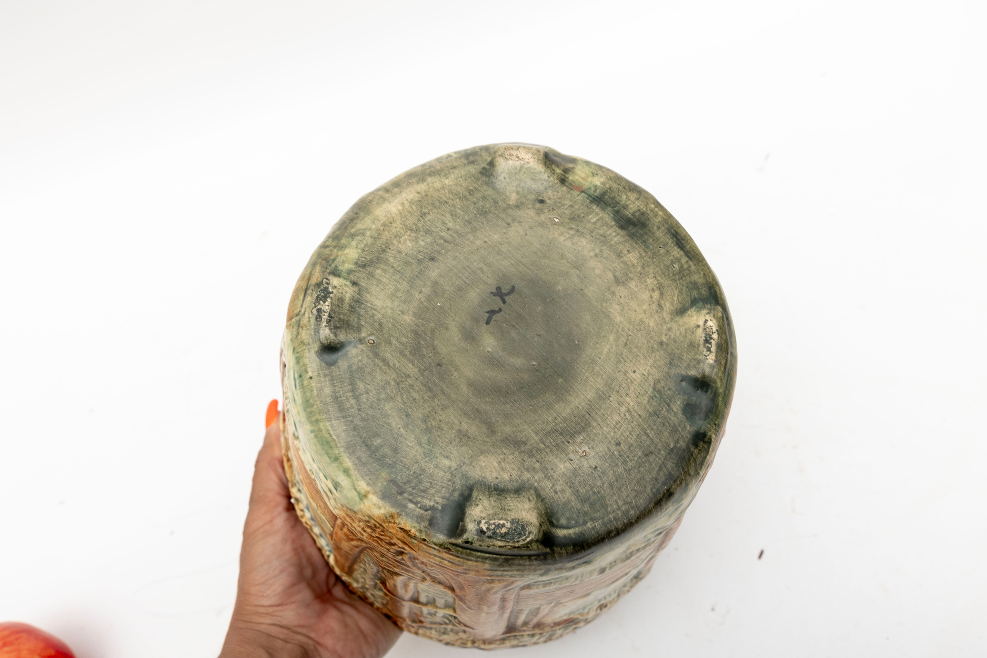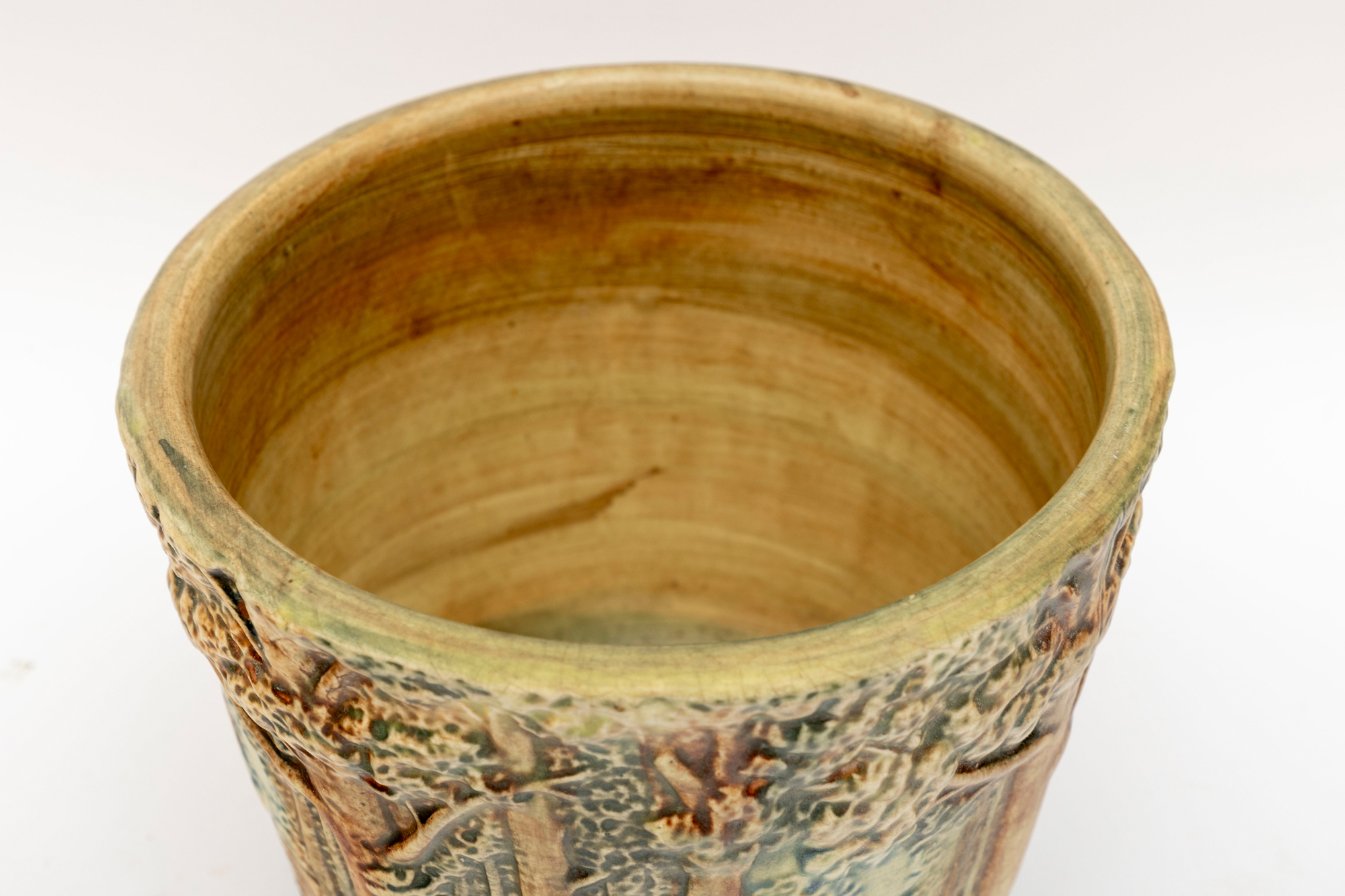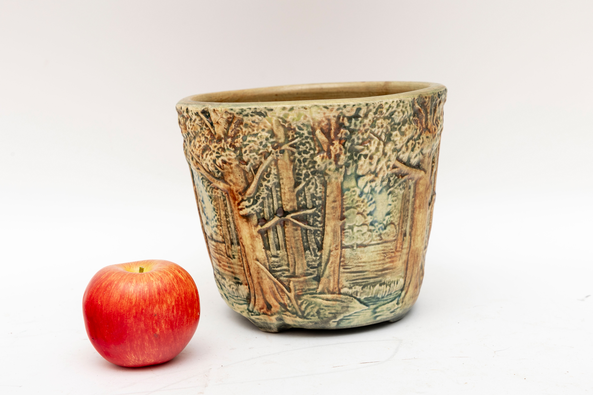 An exceptionally detailed piece of art pottery attributed to the Weller Pottery Company of Zanesville, Ohio. The pattern is entitled "Forest", showcasing a hand-painted landscape set in relief over a jardiniere pot form.