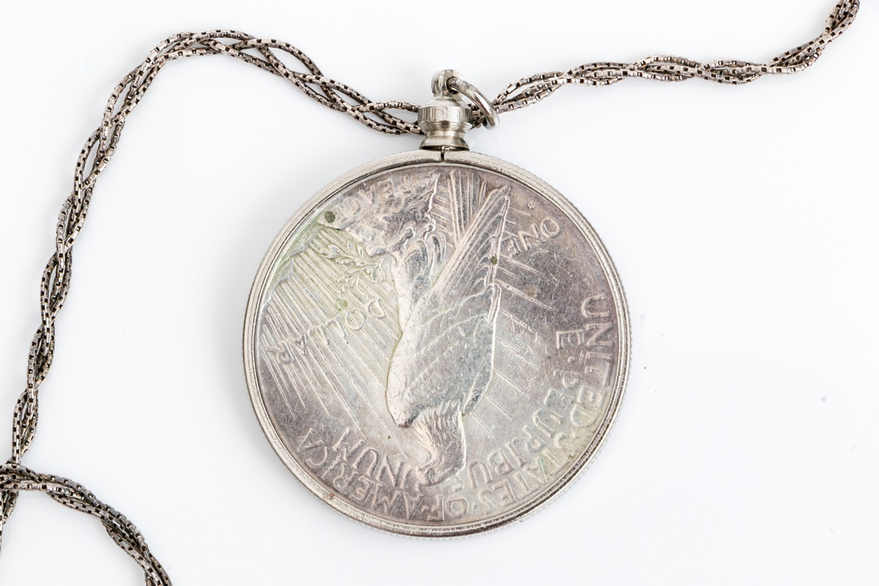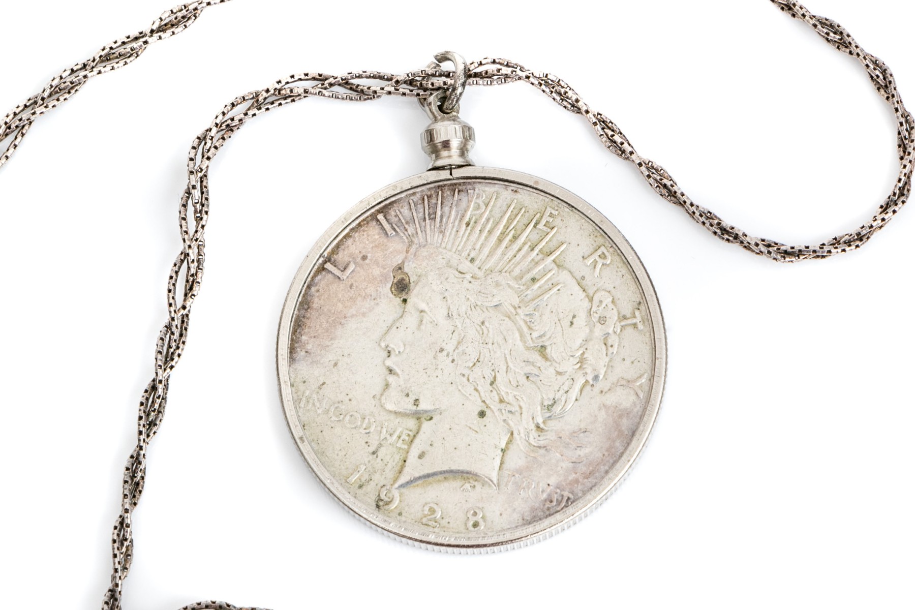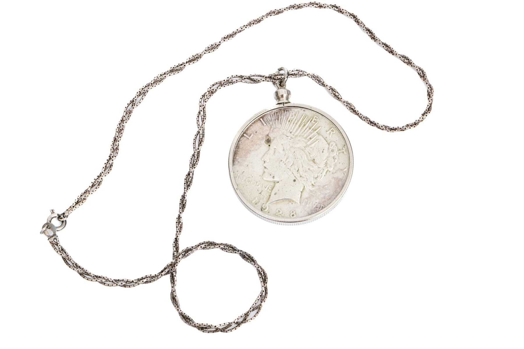 1928-S Peace Dollar pendant displayed on a sterling silver braided chain, Spring ring clasp.