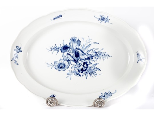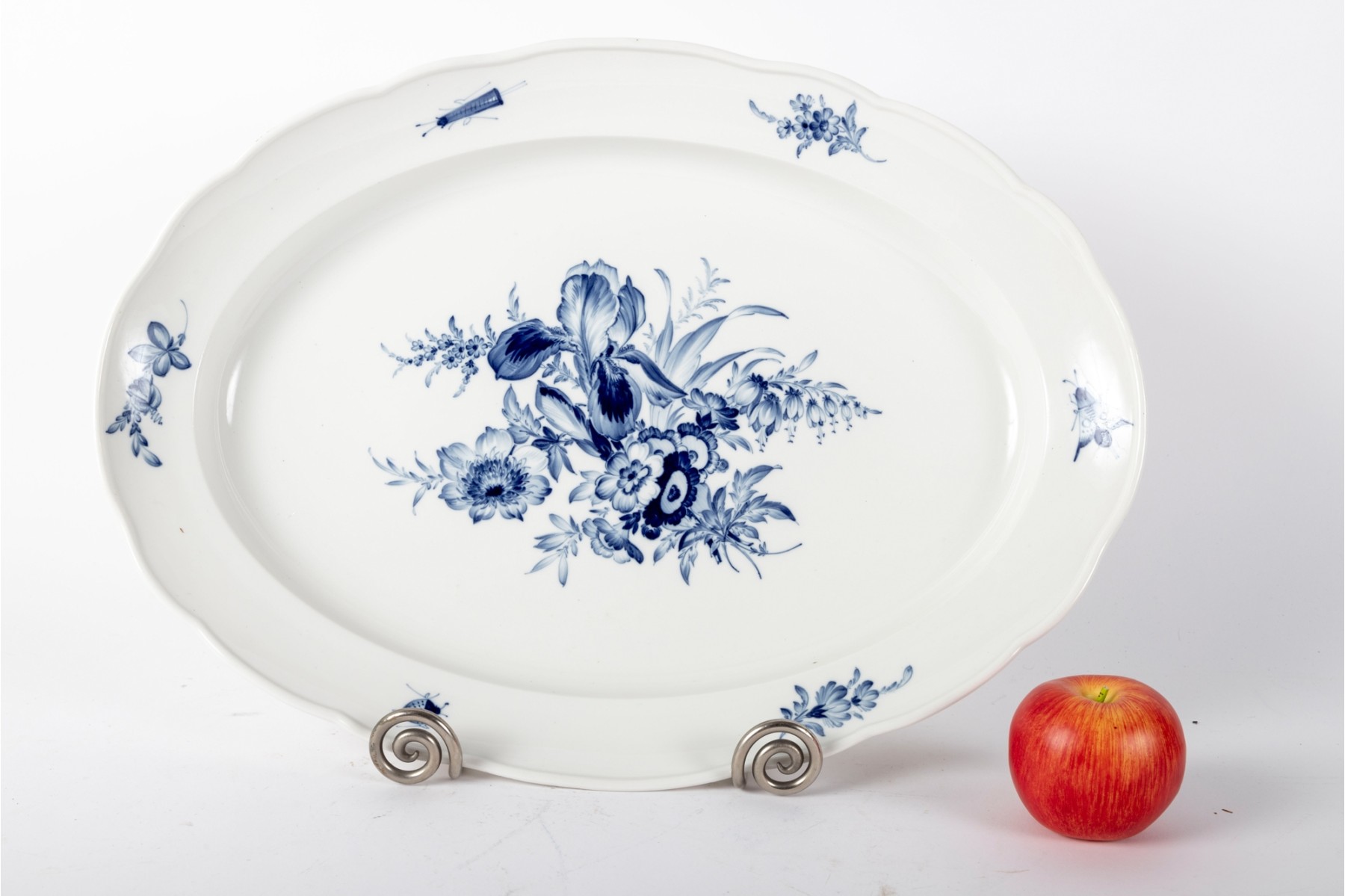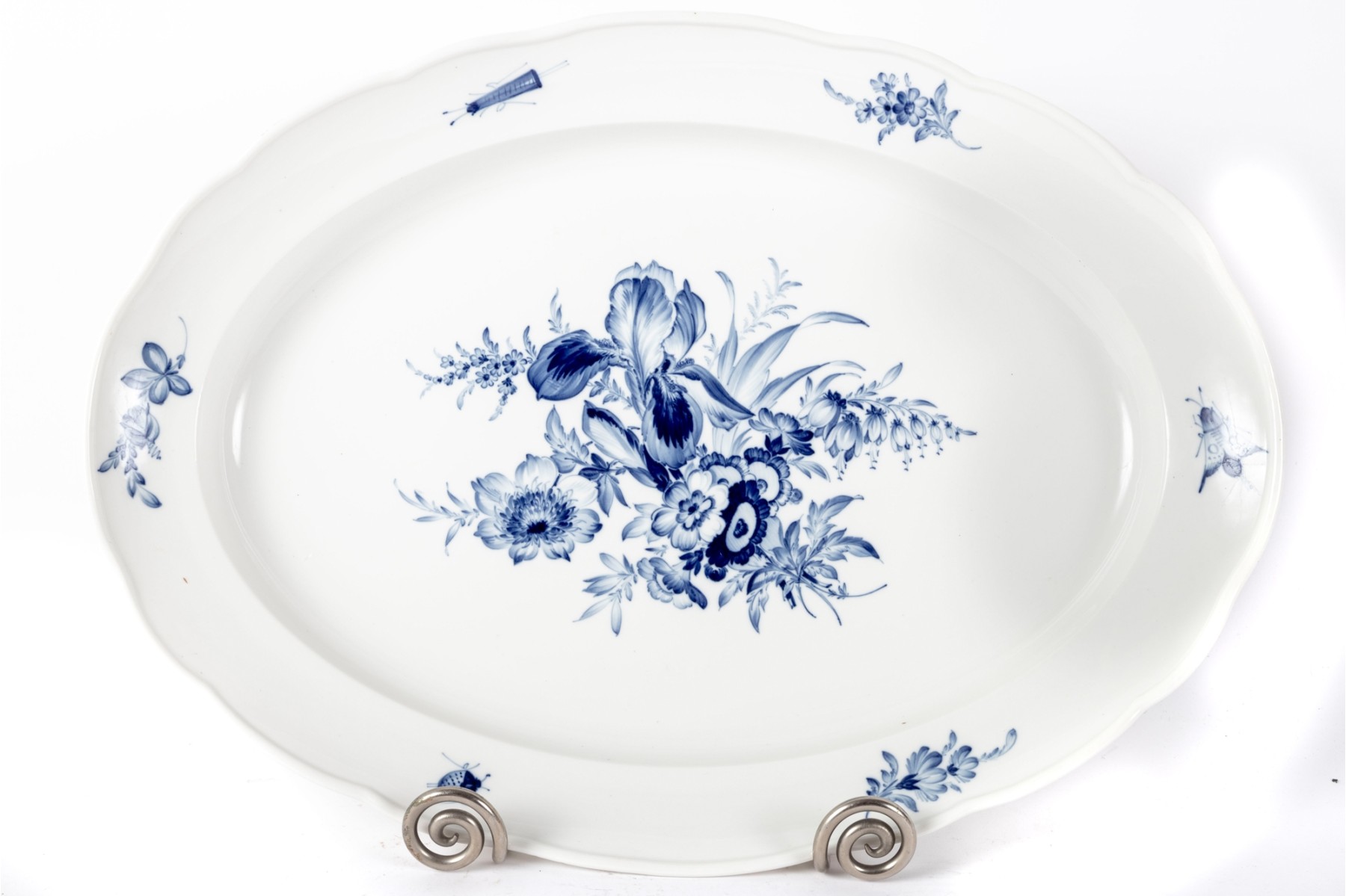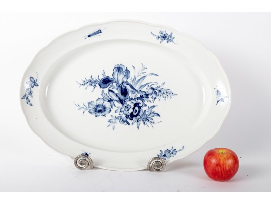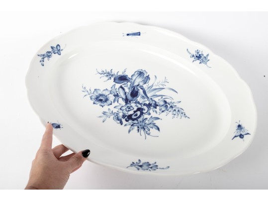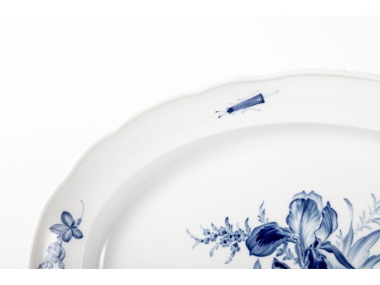 A stunning Meissen 20.5" porcelain oval platter, circa 1930's, featuring the iconic Twin Swords mark. This blue and white piece showcases hand-painted floral motifs at its center, complemented by delicately illustrated insects along a scalloped rim.