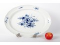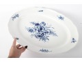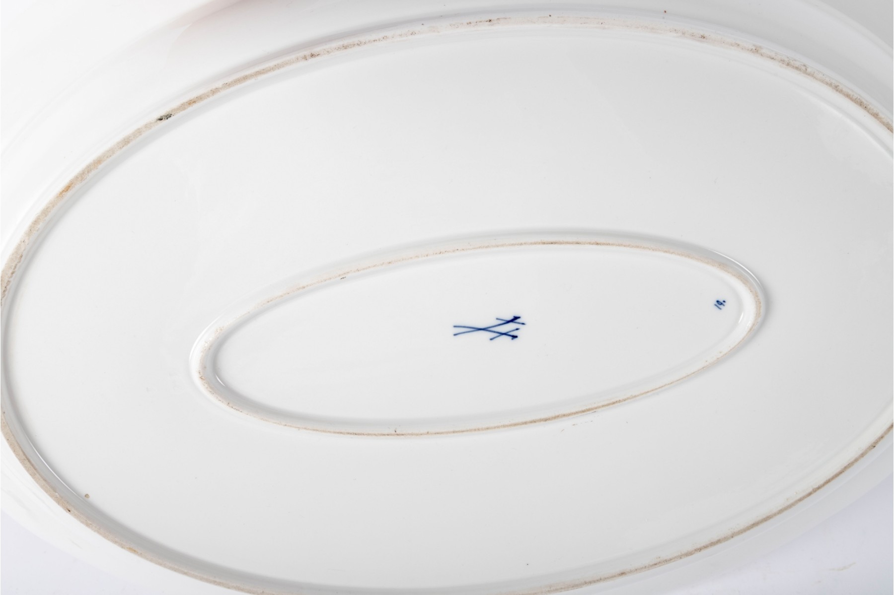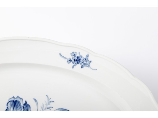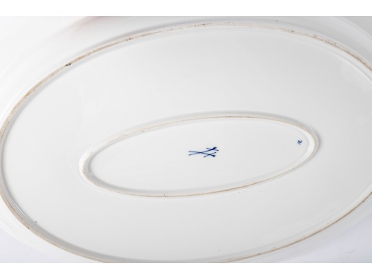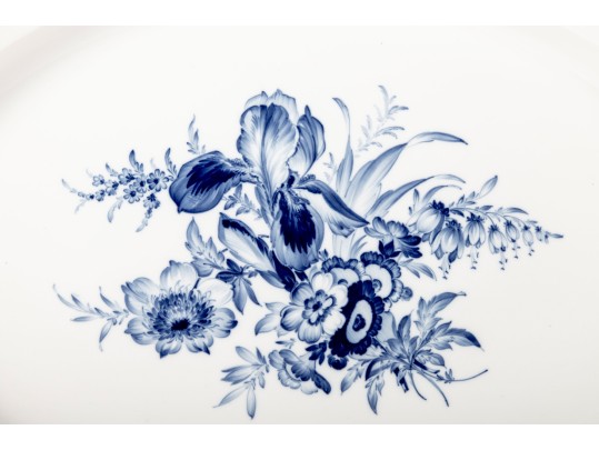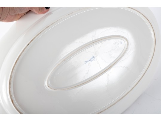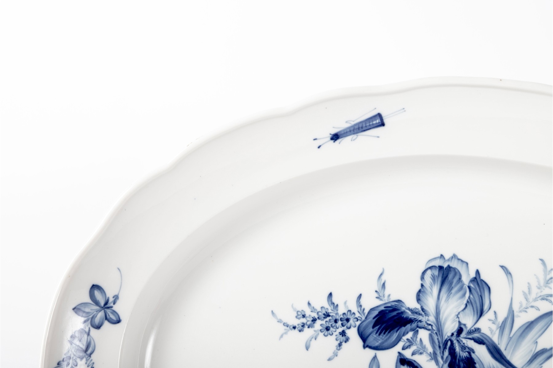 A stunning Meissen 20.5" porcelain oval platter, circa 1930's, featuring the iconic Twin Swords mark. This blue and white piece showcases hand-painted floral motifs at its center, complemented by delicately illustrated insects along a scalloped rim.