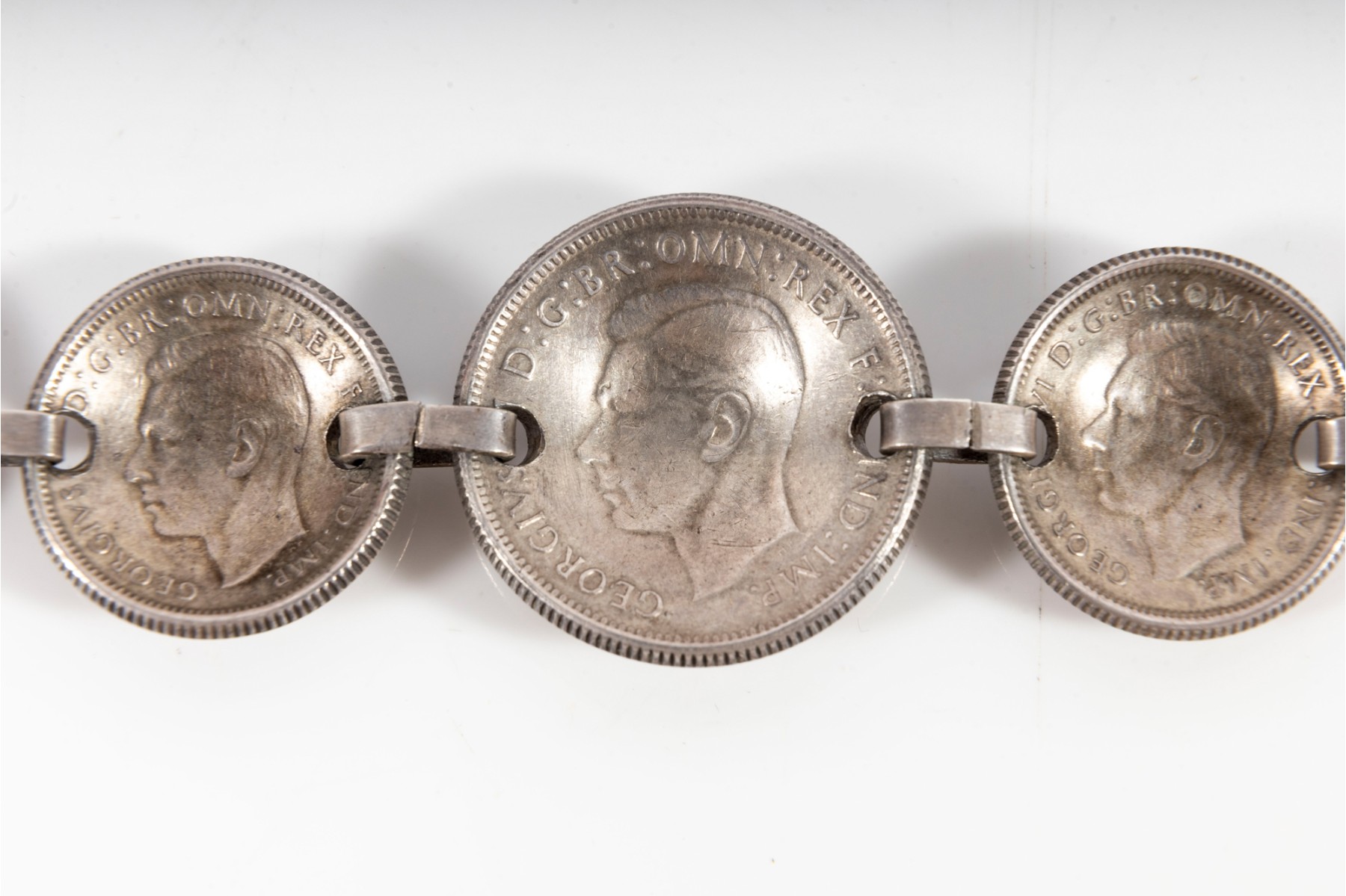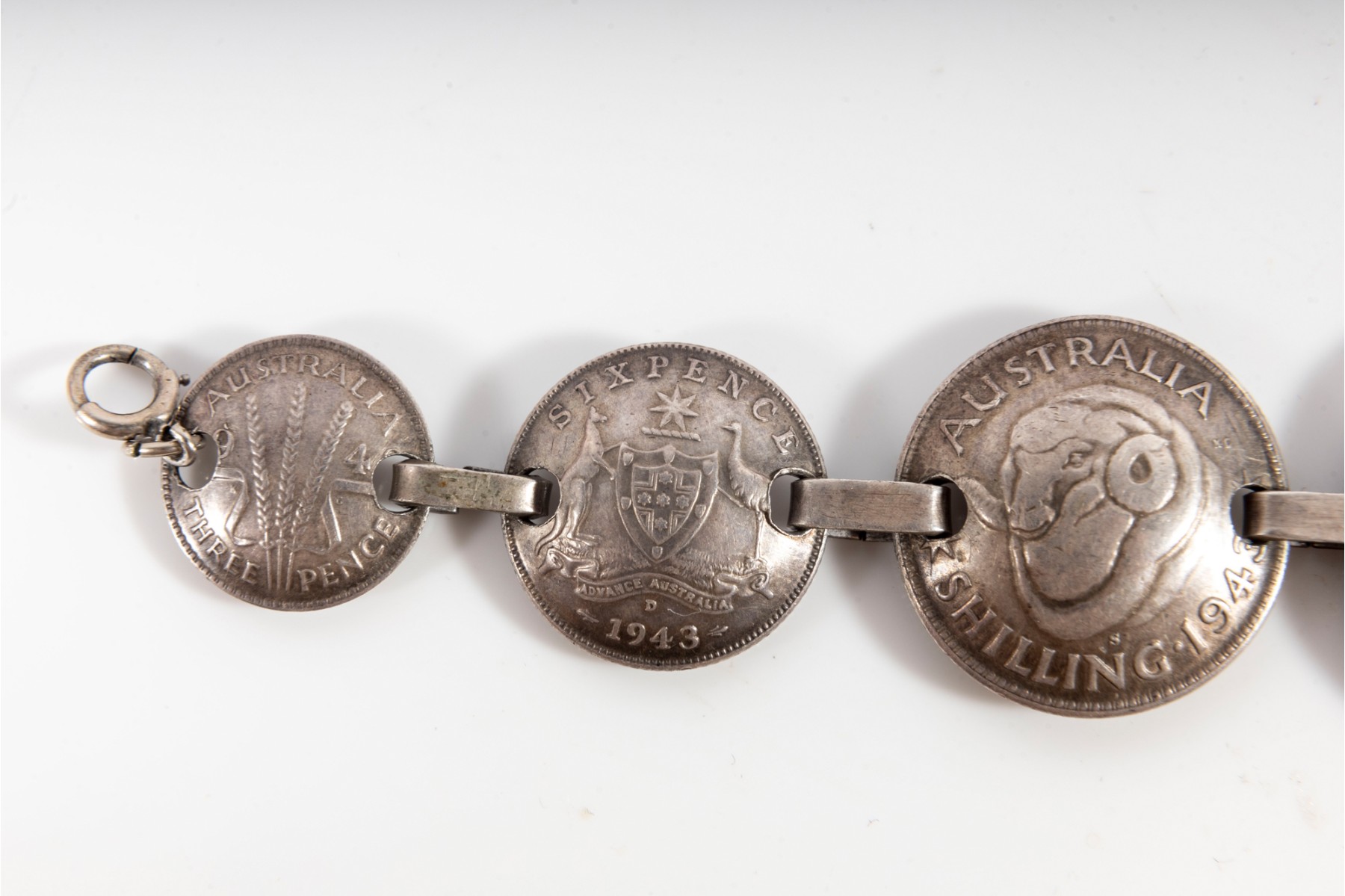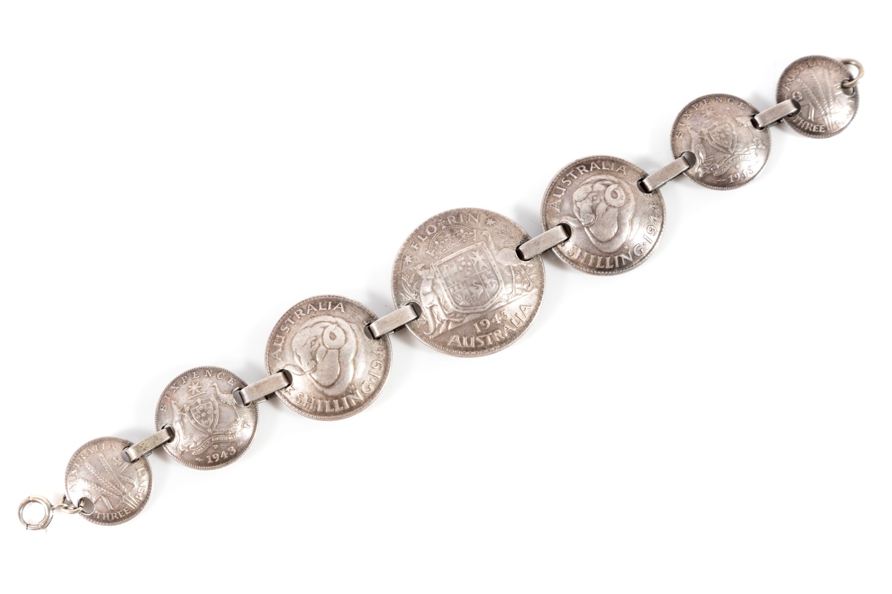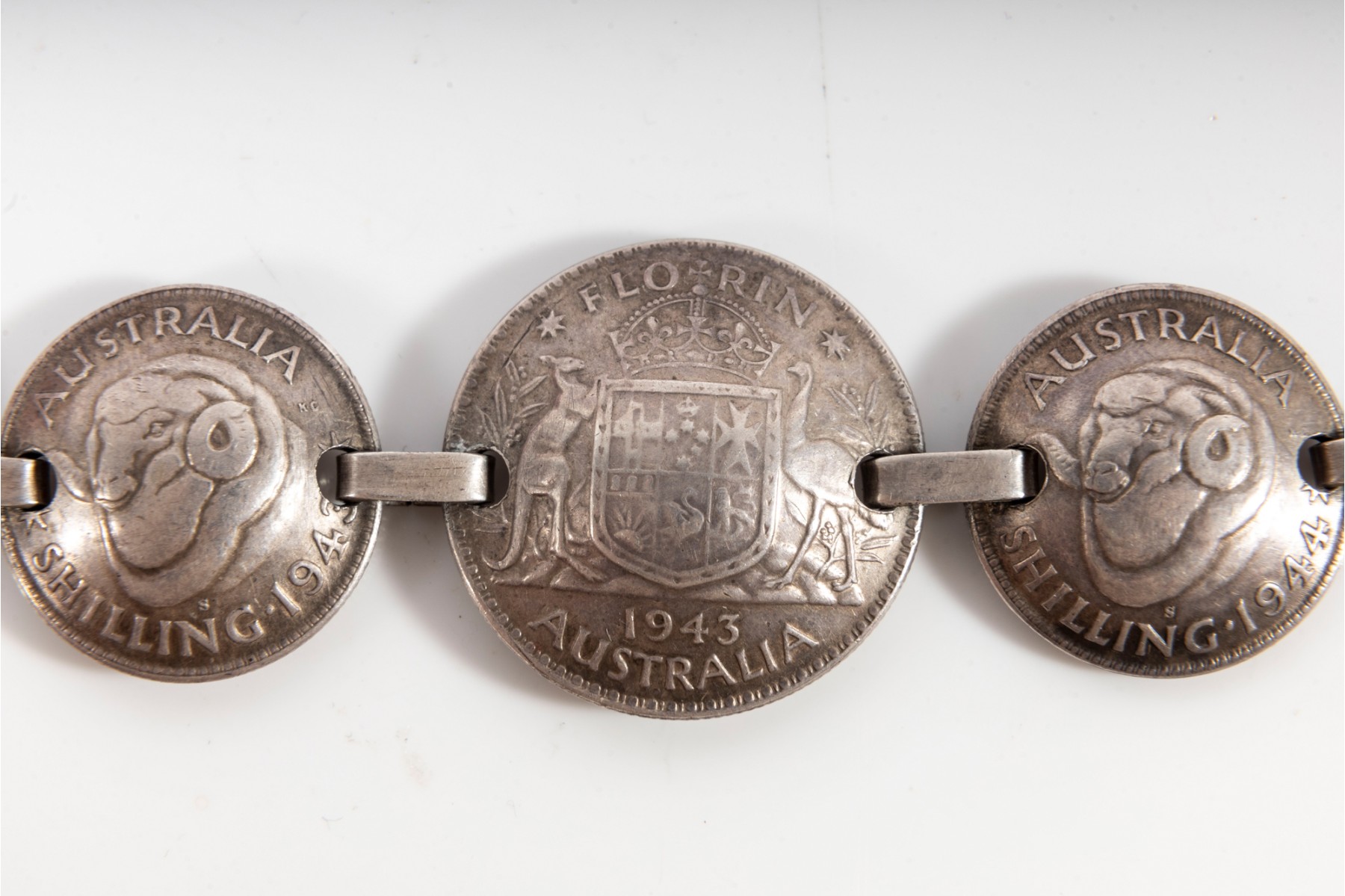 American soldiers were displaced in WW2, with many personnel being stationed in major Australian cities. Being well received in places like Melbourne and Sydney, 12,000 Australian women became war brides -- with many receiving various gifts in the form of trench art. This is one such a example; a bracelet composed of multiple Australian silver coins, with all of the coins matching years of service between 1941 - 1945. The first US units arrived in Australia in early 1942.