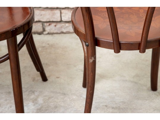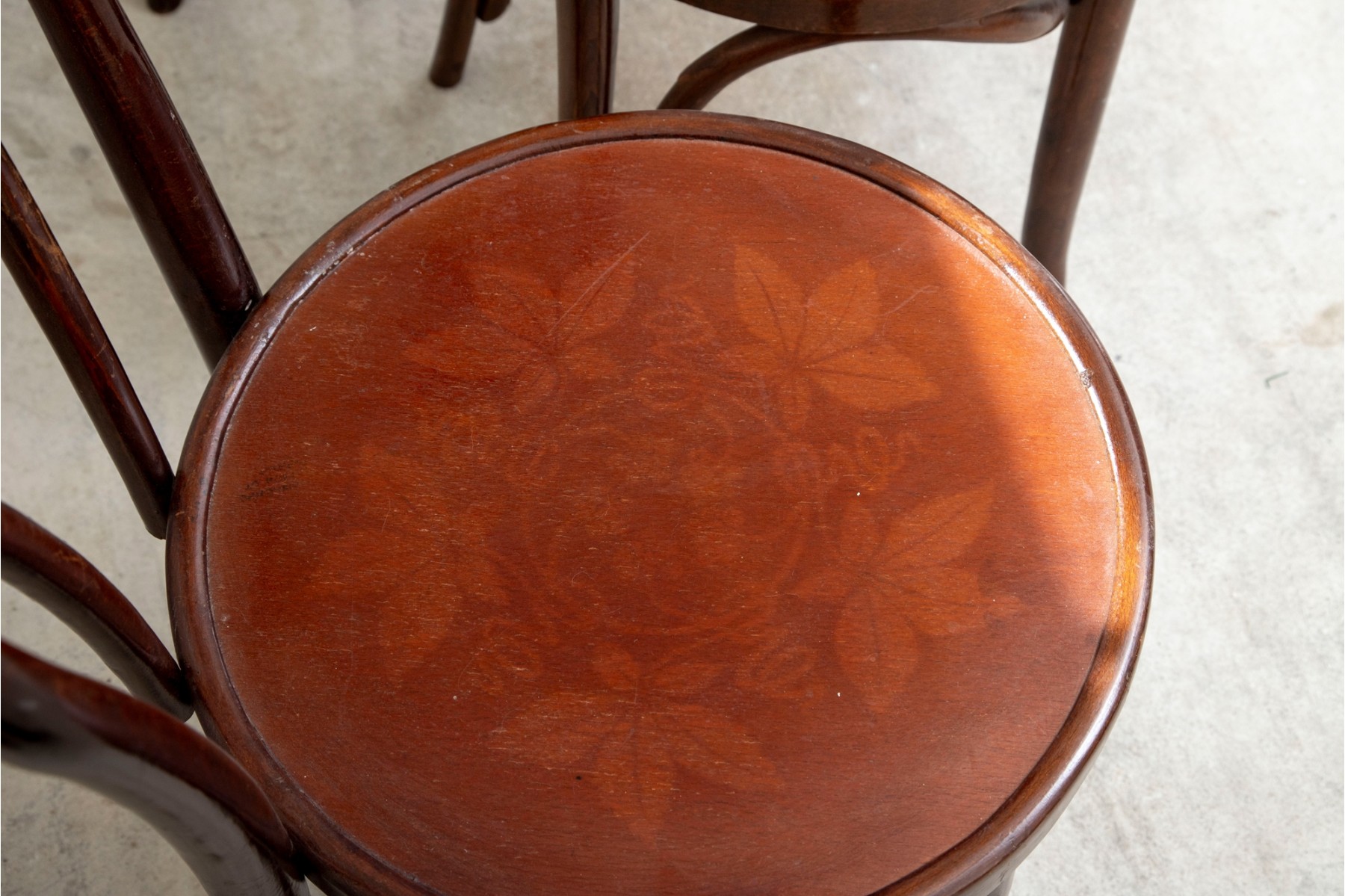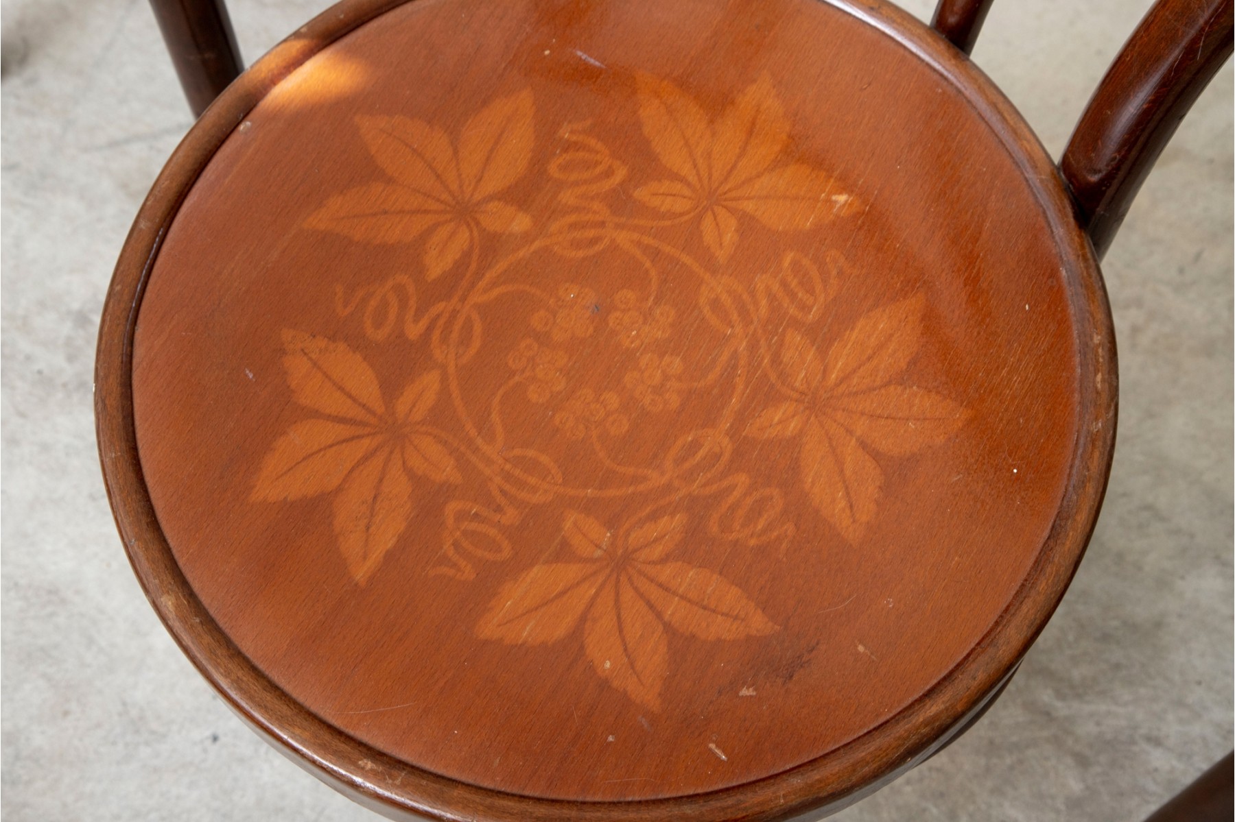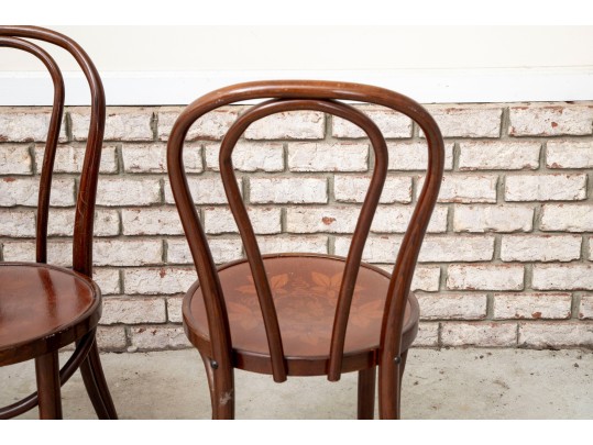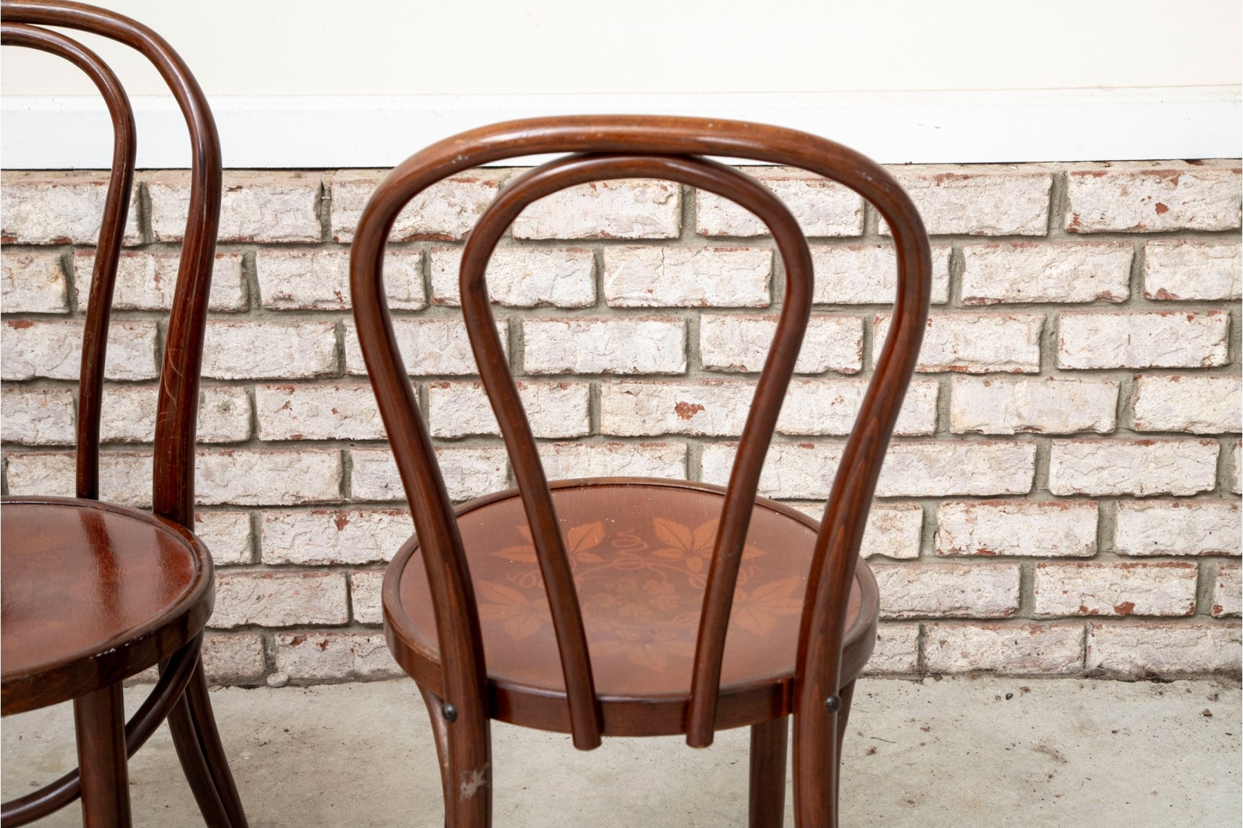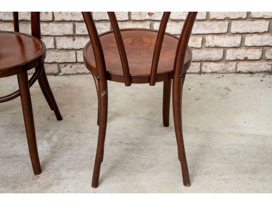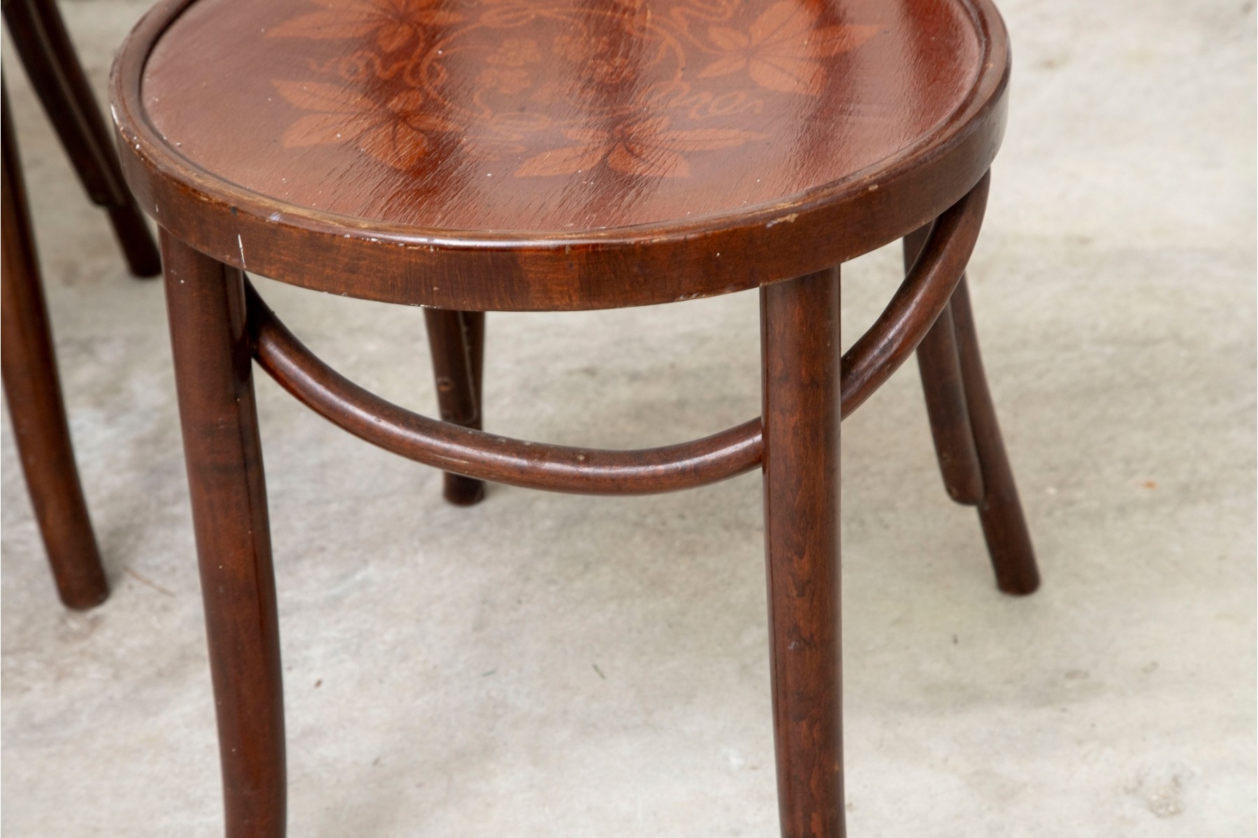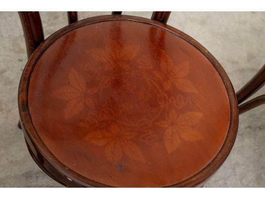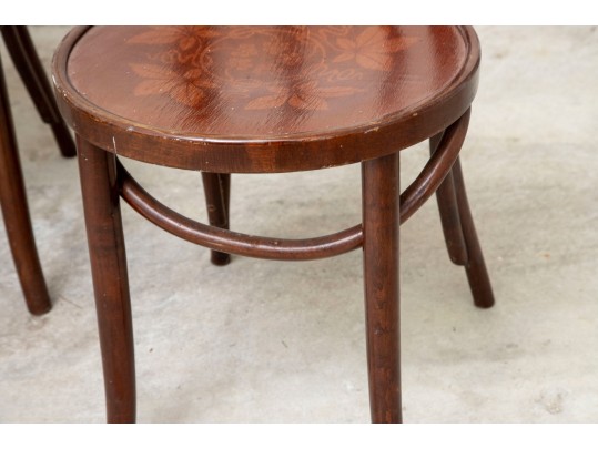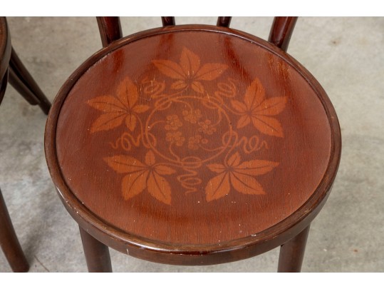 A set of four classic 1940's Bentwood chairs featuring faint floral stencils applied to the seats. The design closely resembles examples produced by the Great Northern Chair Company -- likely faithful reproductions with curved frames with vintage detailing.