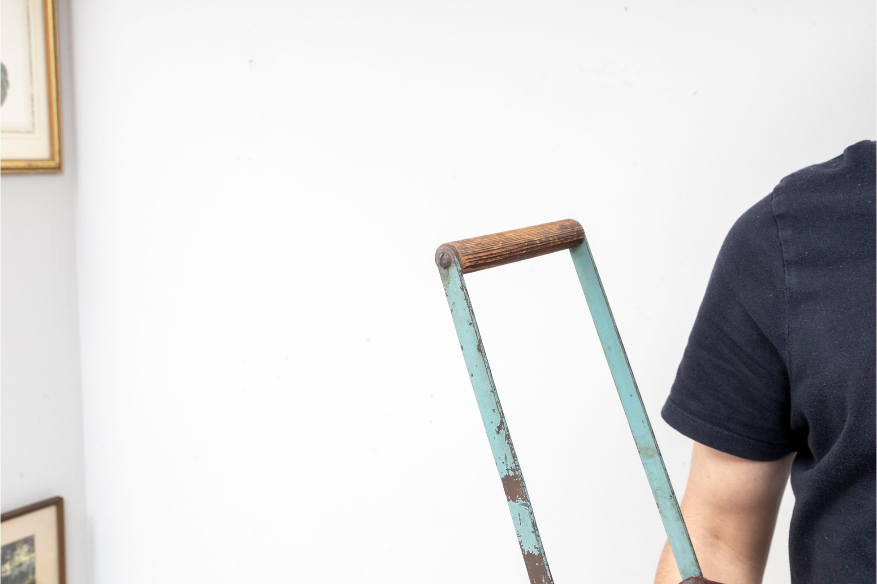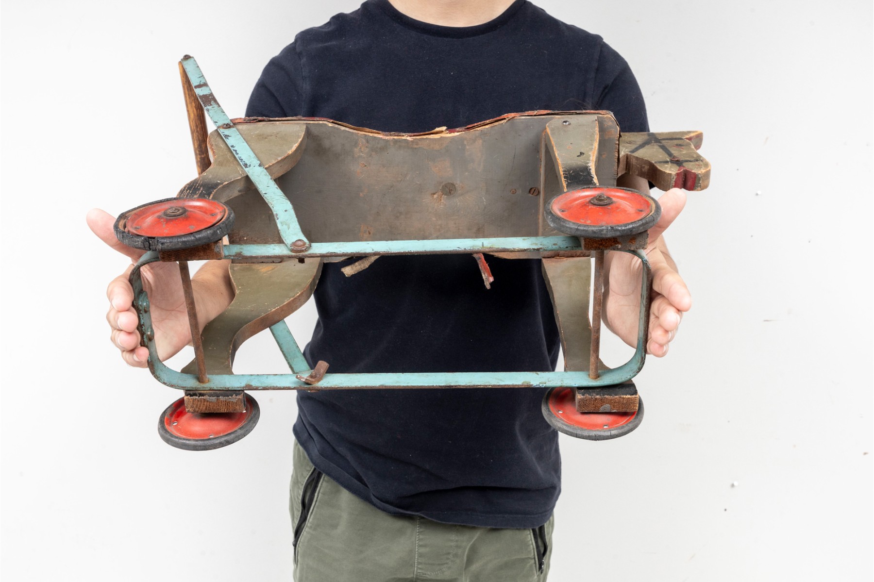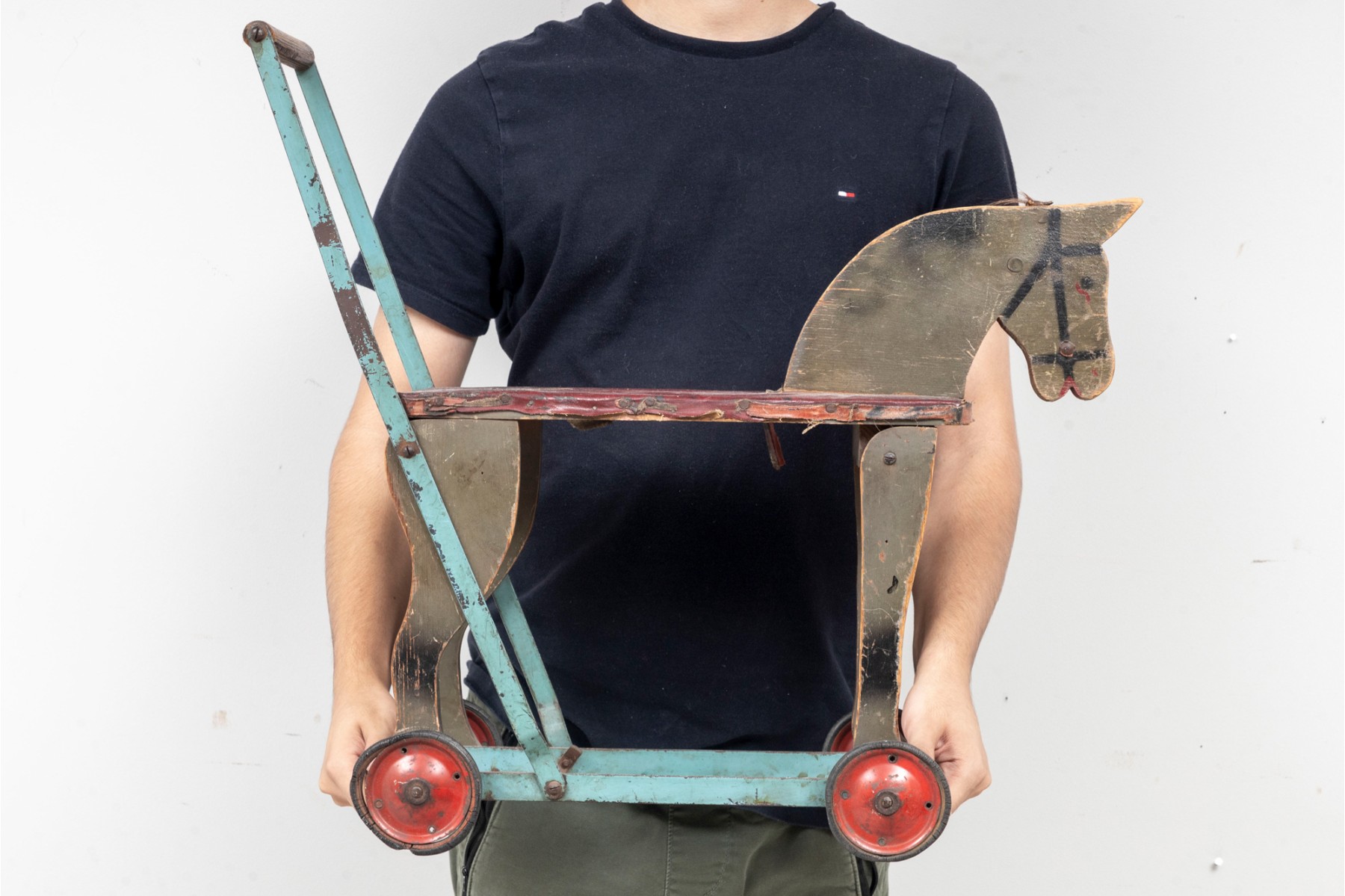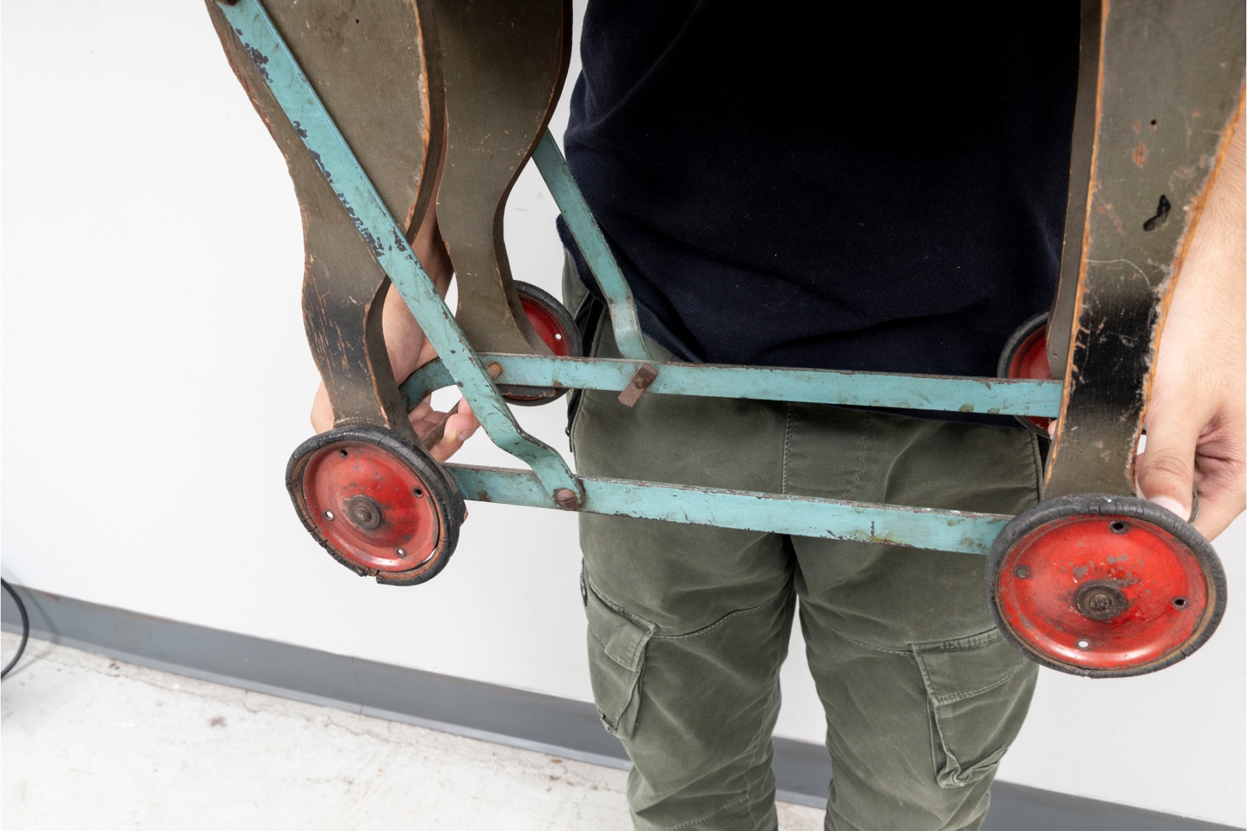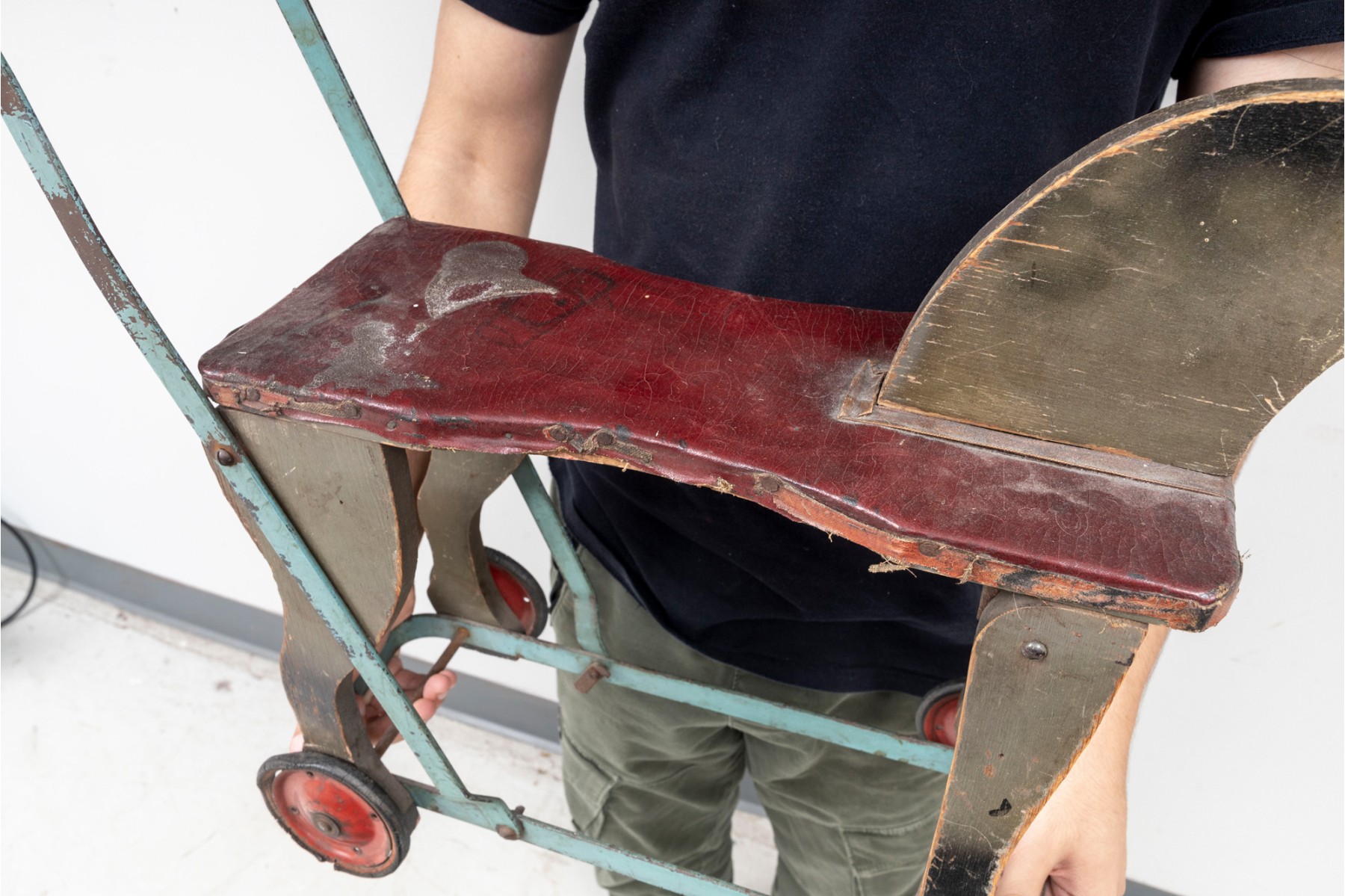 1940's ride-along toy made from leather, timber and iron. There are four wheels complete with original rubber tread.