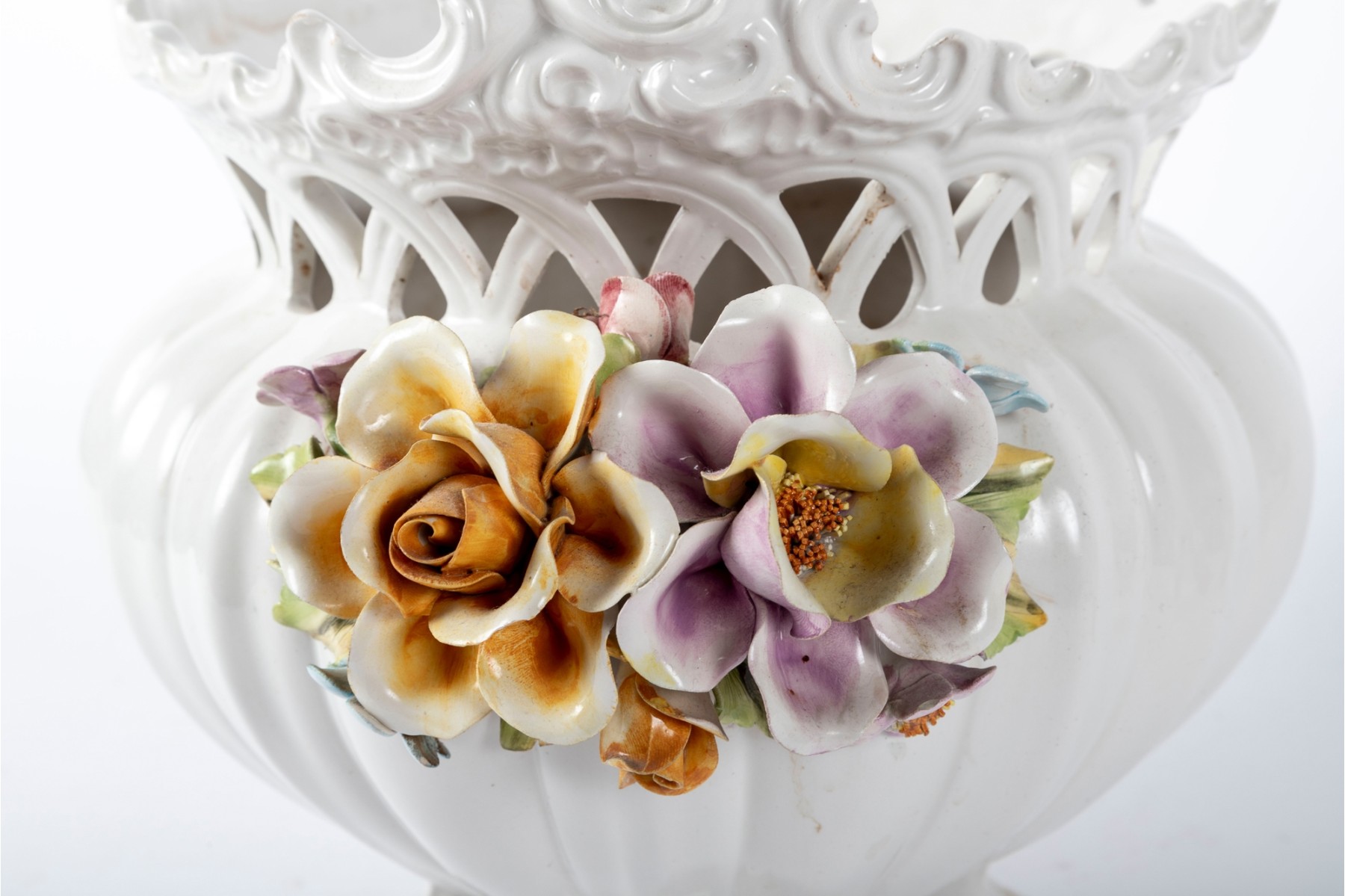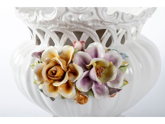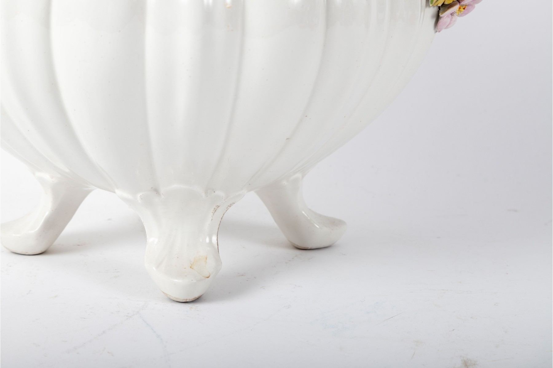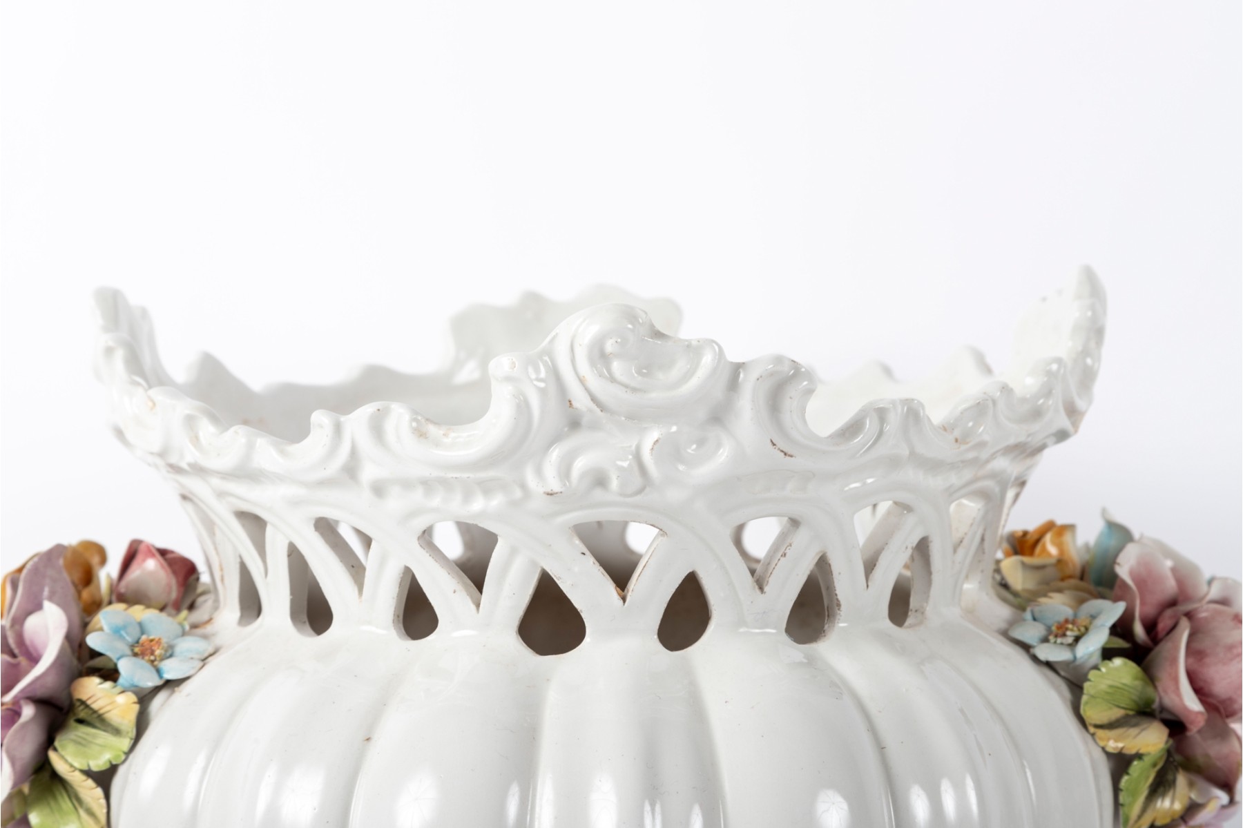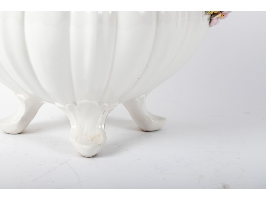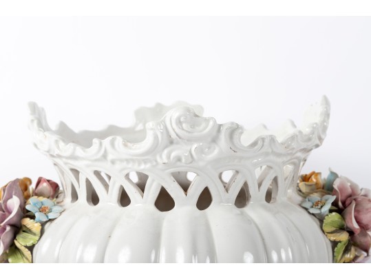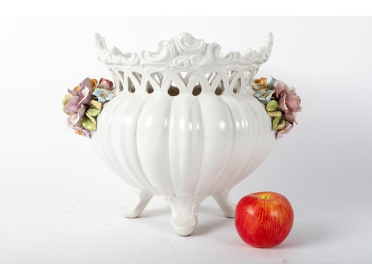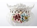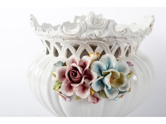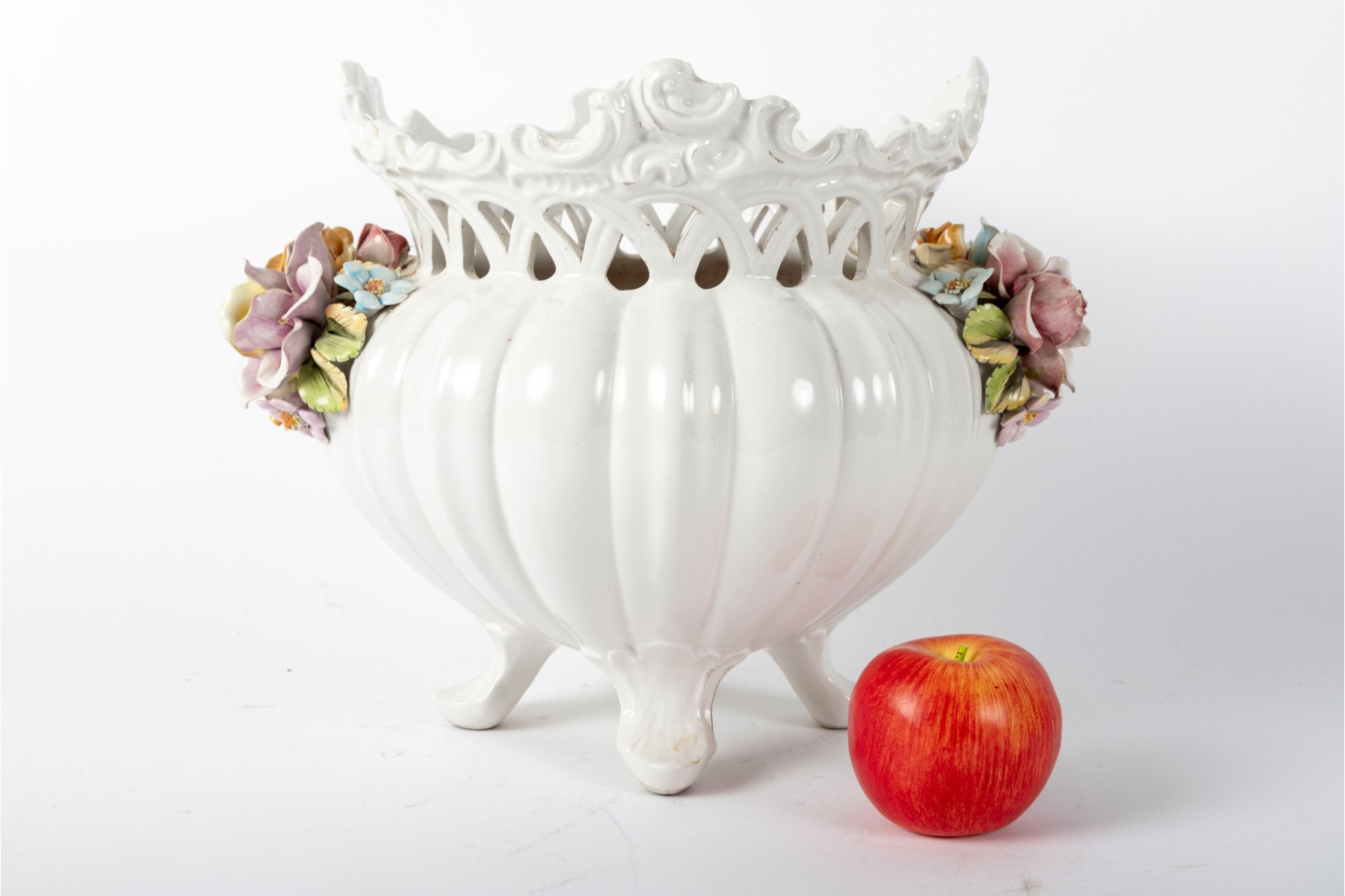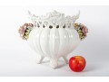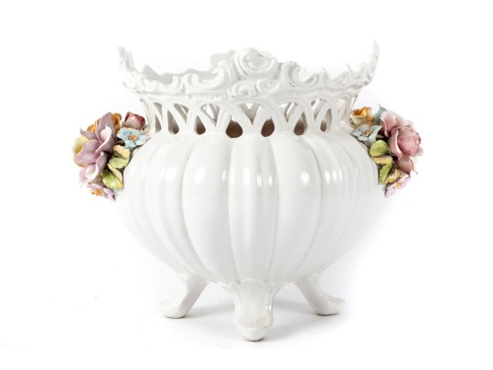 A vintage 1950's footed ceramic planter in off-white, featuring sculpted ceramic flowers colored in glaze washes. Made in Italy.