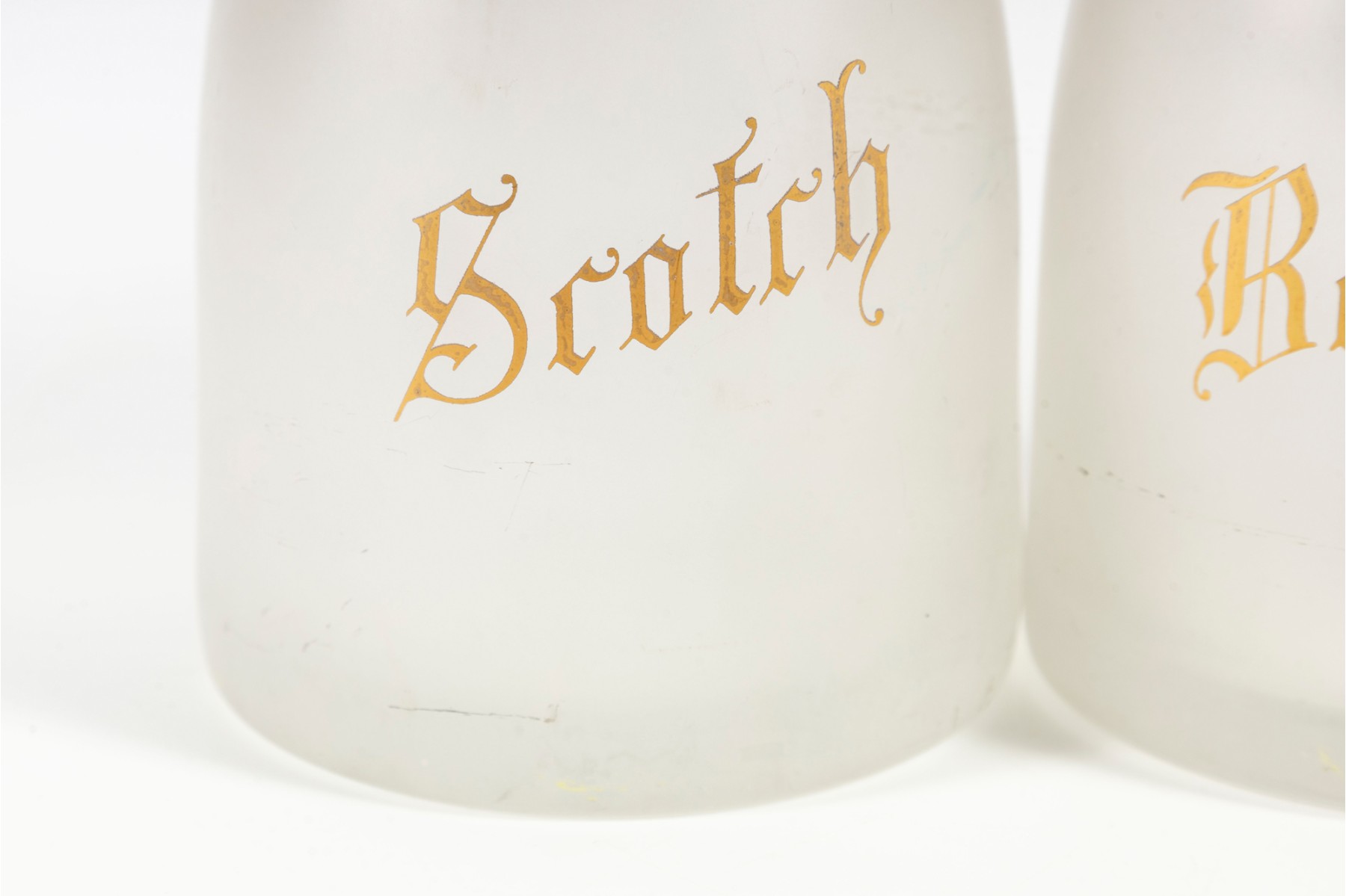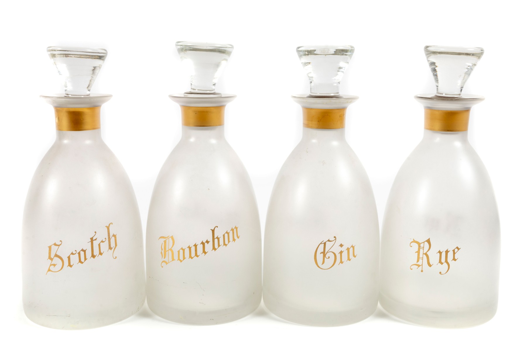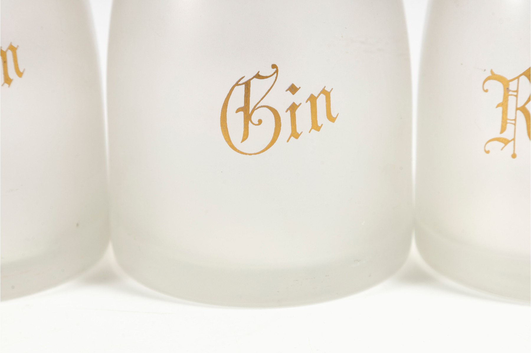 A set of mid-century frosted glass decanters labeled for Bourbon, Scotch, Rye and Gin.