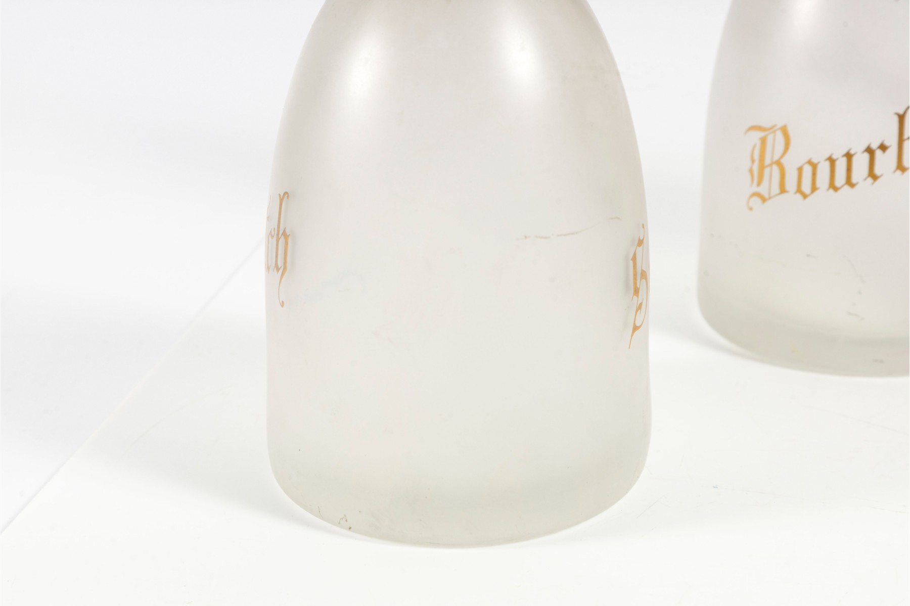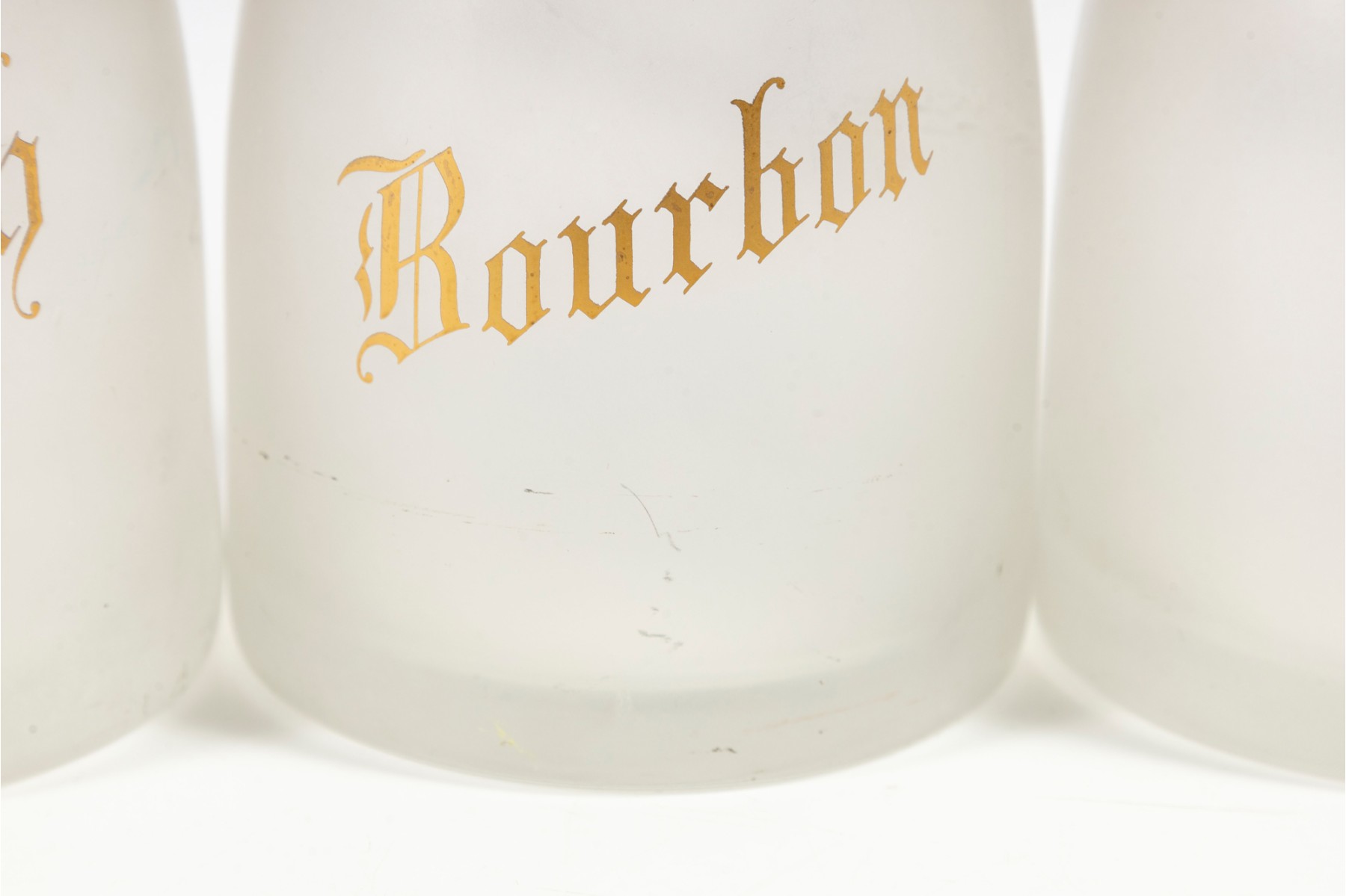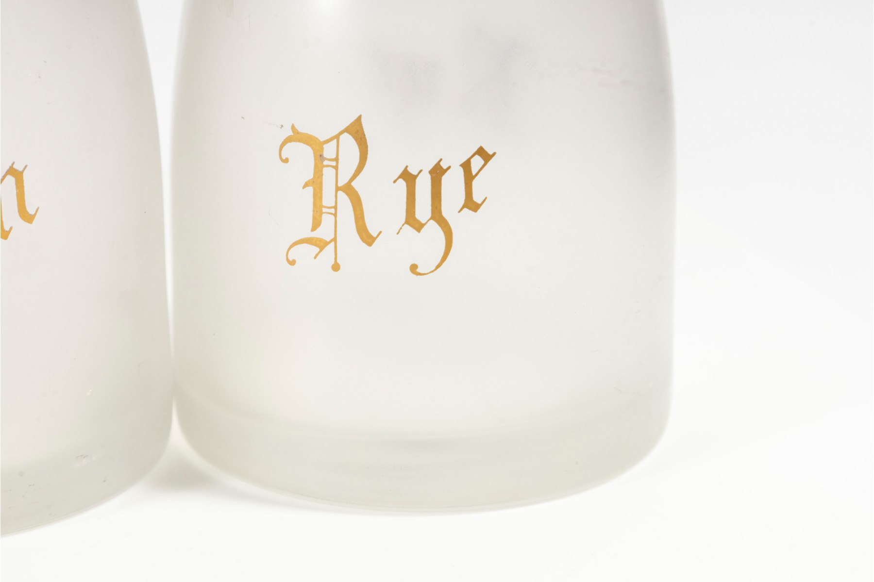 A set of mid-century frosted glass decanters labeled for Bourbon, Scotch, Rye and Gin.