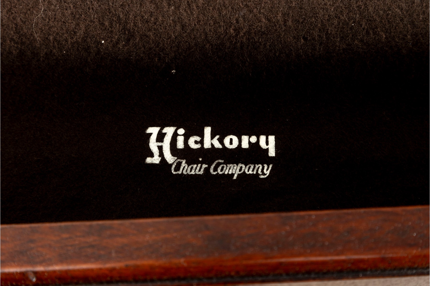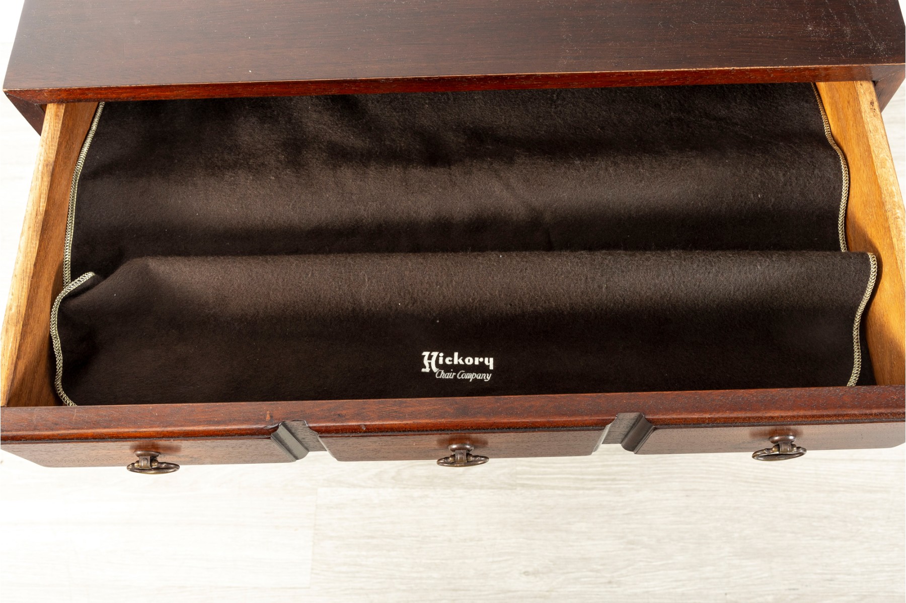 A stunning vintage 1960's solid mohogany wood silver chest produced by the Hickory Chair Company of North Carolina. The piece features three dovetailed drawers outfitted with cloth/felt flatware holder inserts, and is supported on cabriole legs terminating on pad feet.