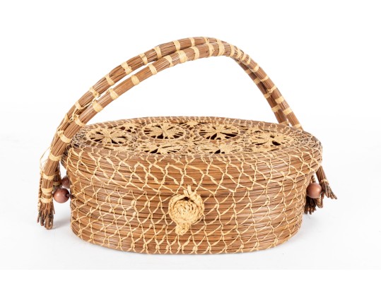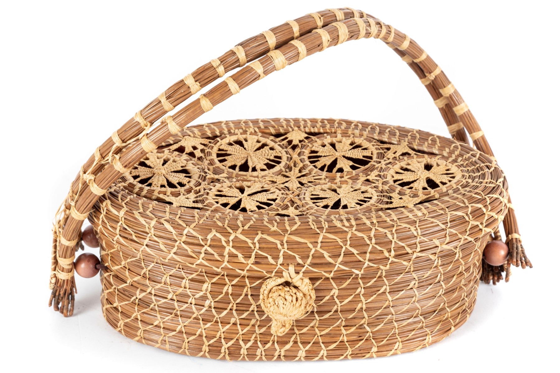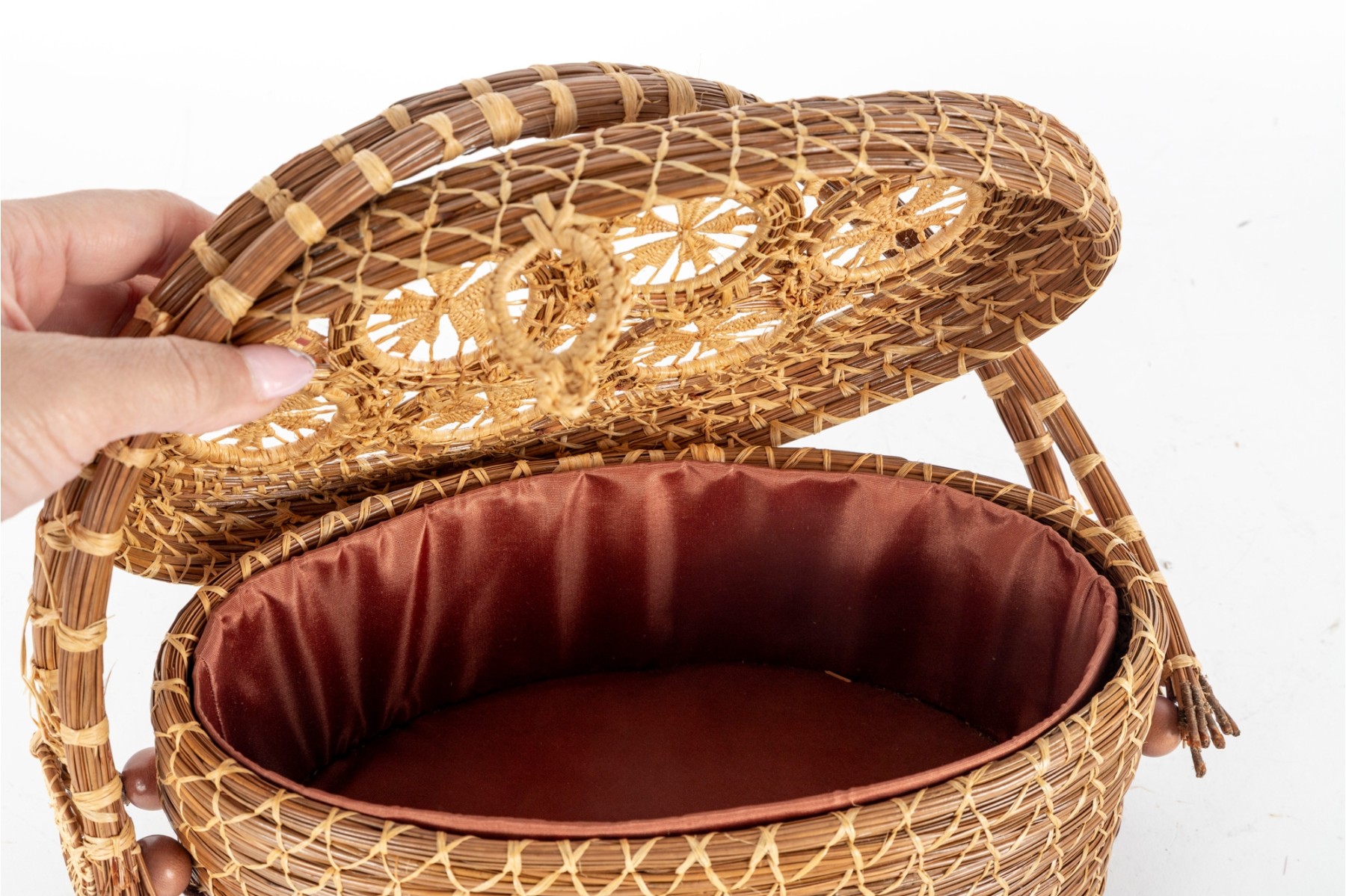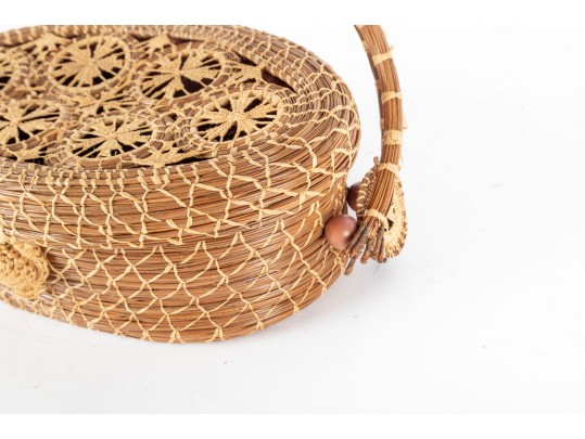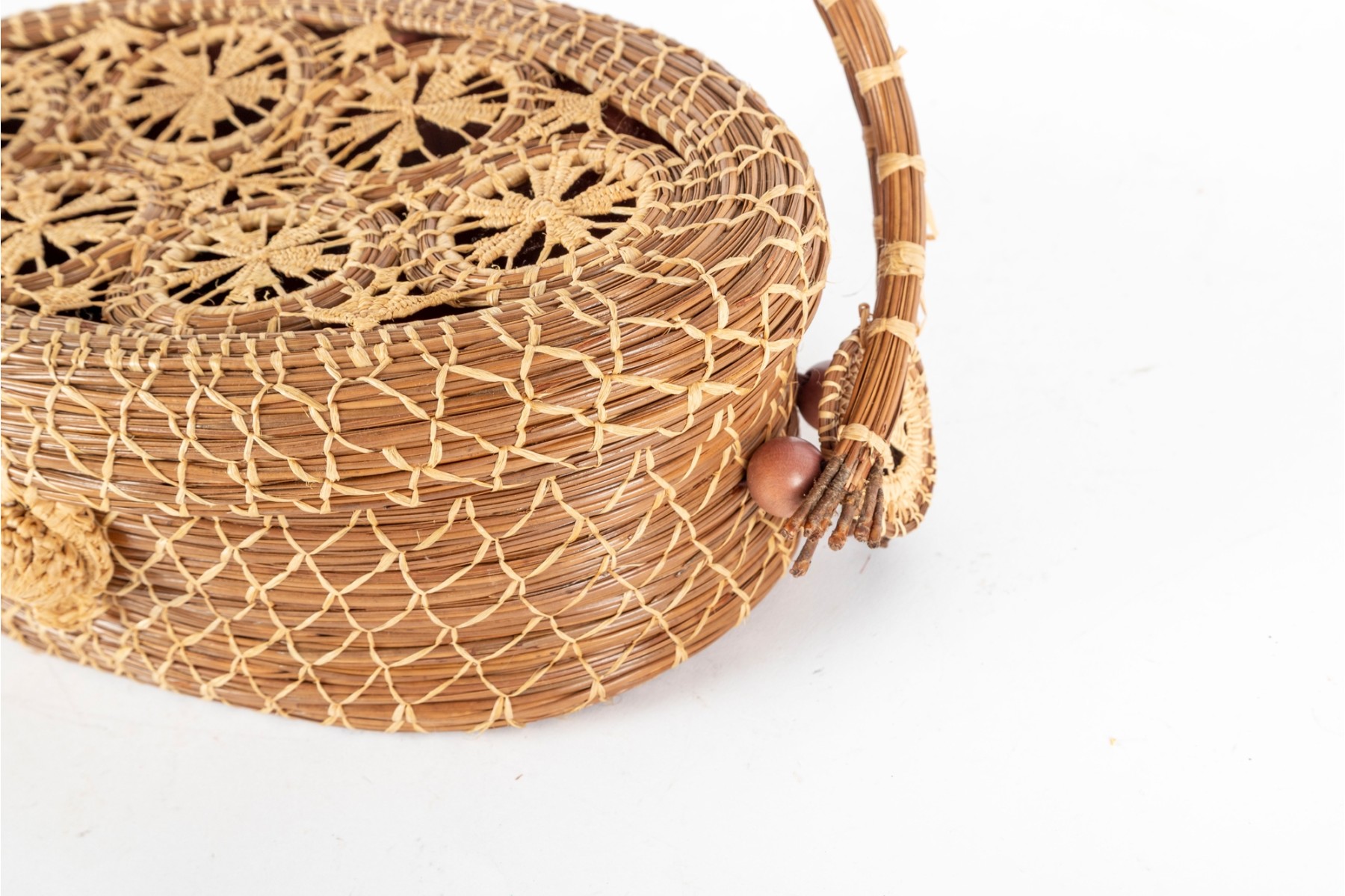 A beautifully handcrafted mid-century woven straw basket featuring intricate netted detailing and a delicate floral lace top. This oval-shaped piece has a sturdy, arched handle with woven accents and wooden bead embellishments.