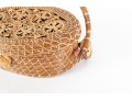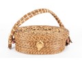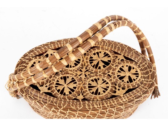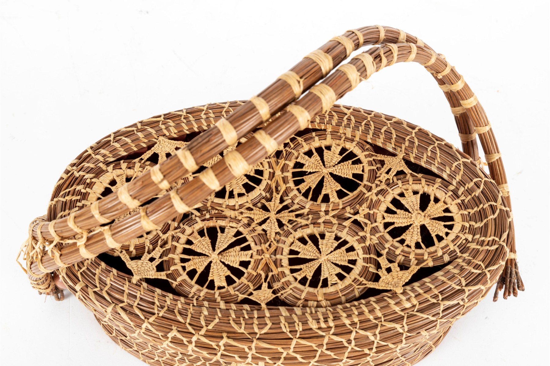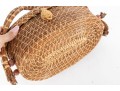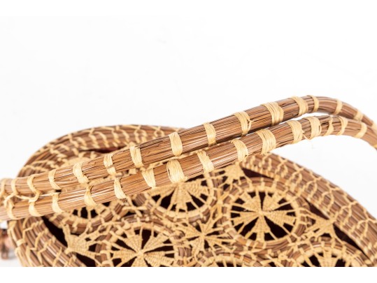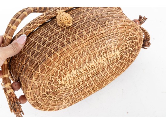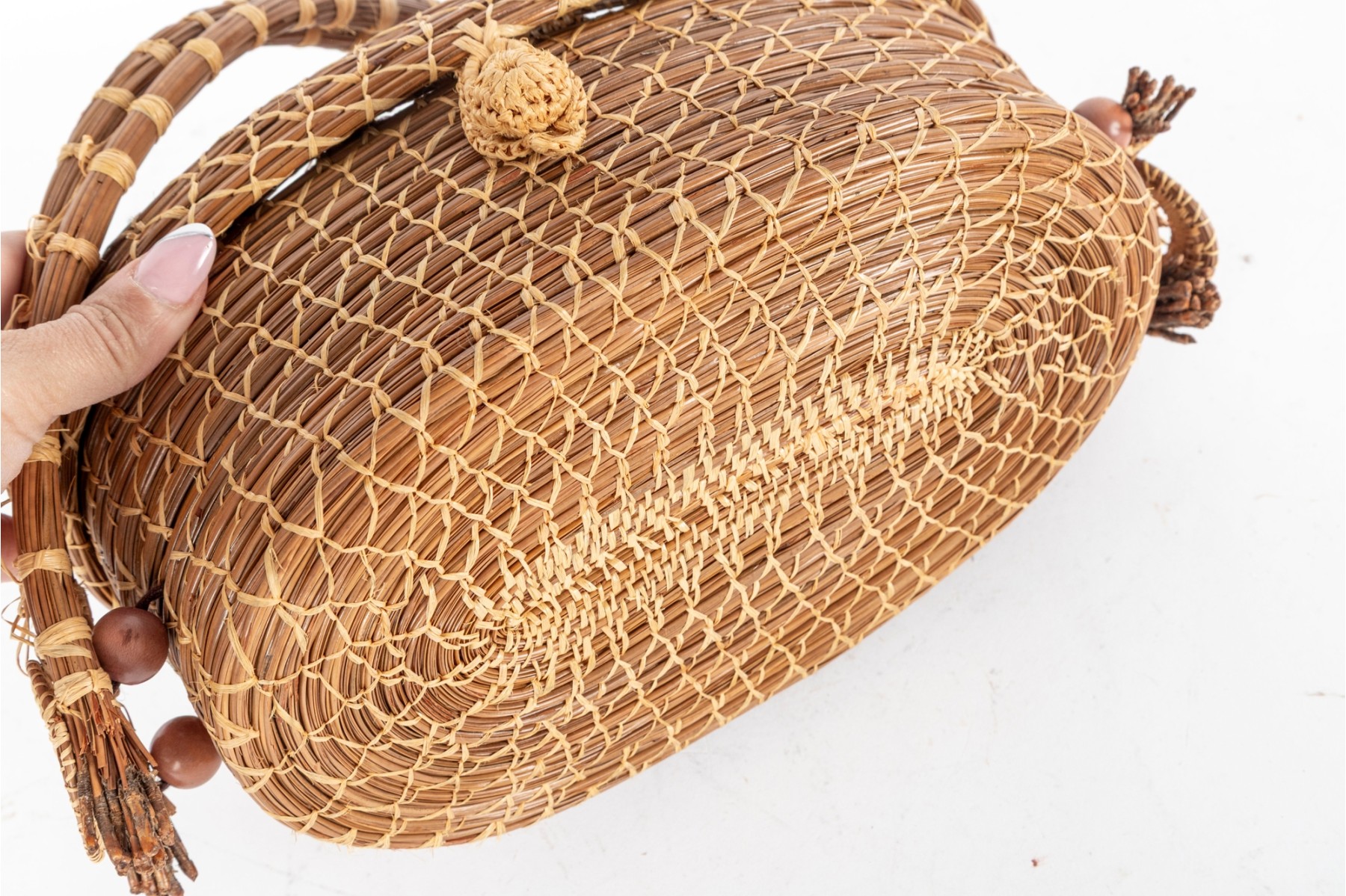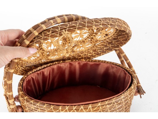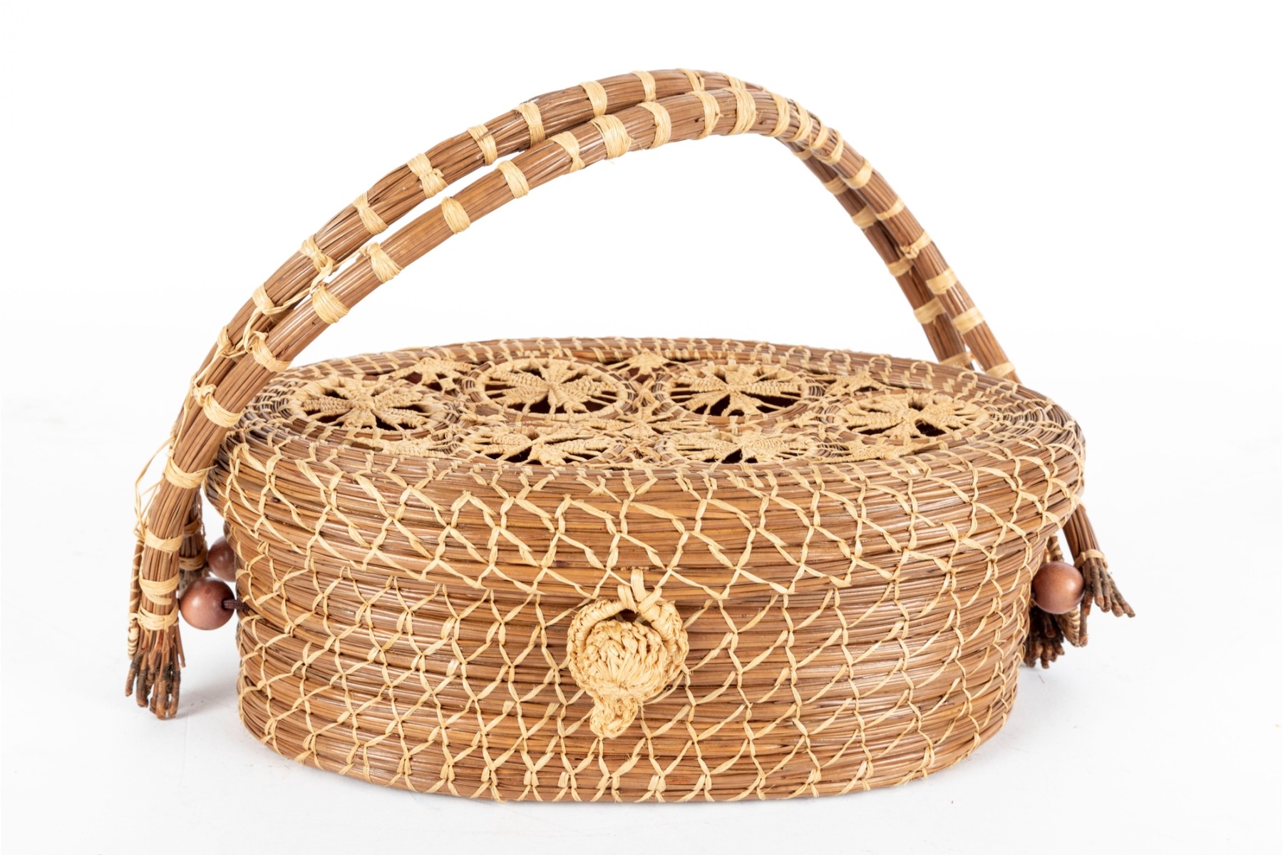 A beautifully handcrafted mid-century woven straw basket featuring intricate netted detailing and a delicate floral lace top. This oval-shaped piece has a sturdy, arched handle with woven accents and wooden bead embellishments.