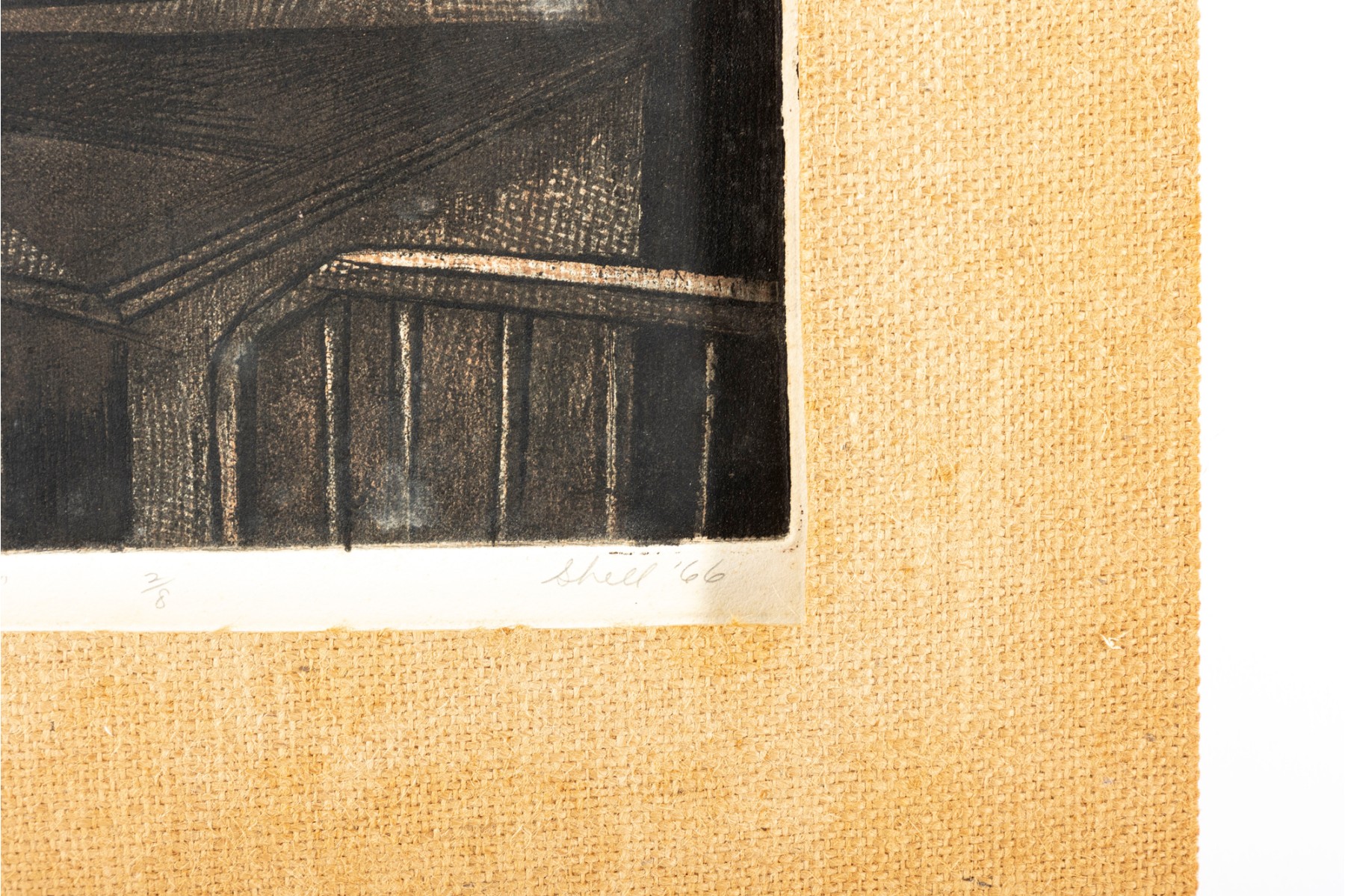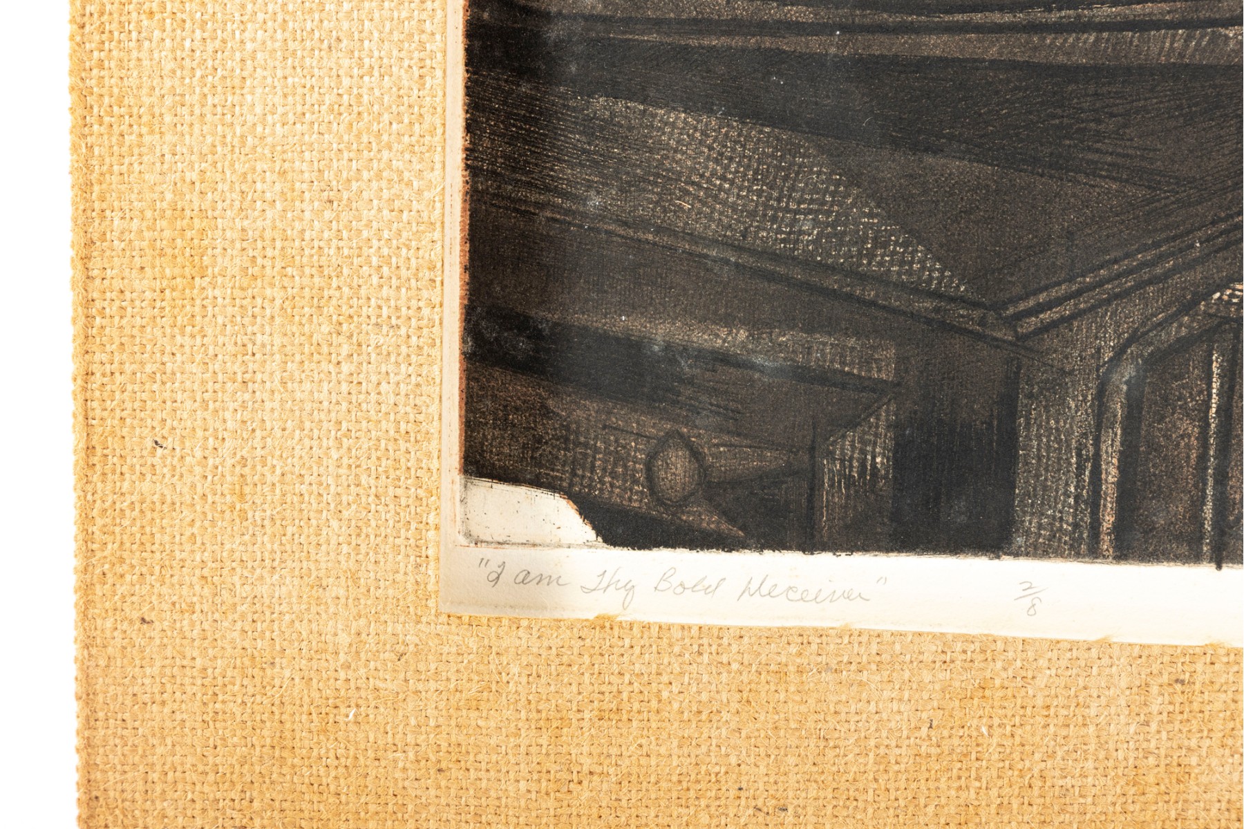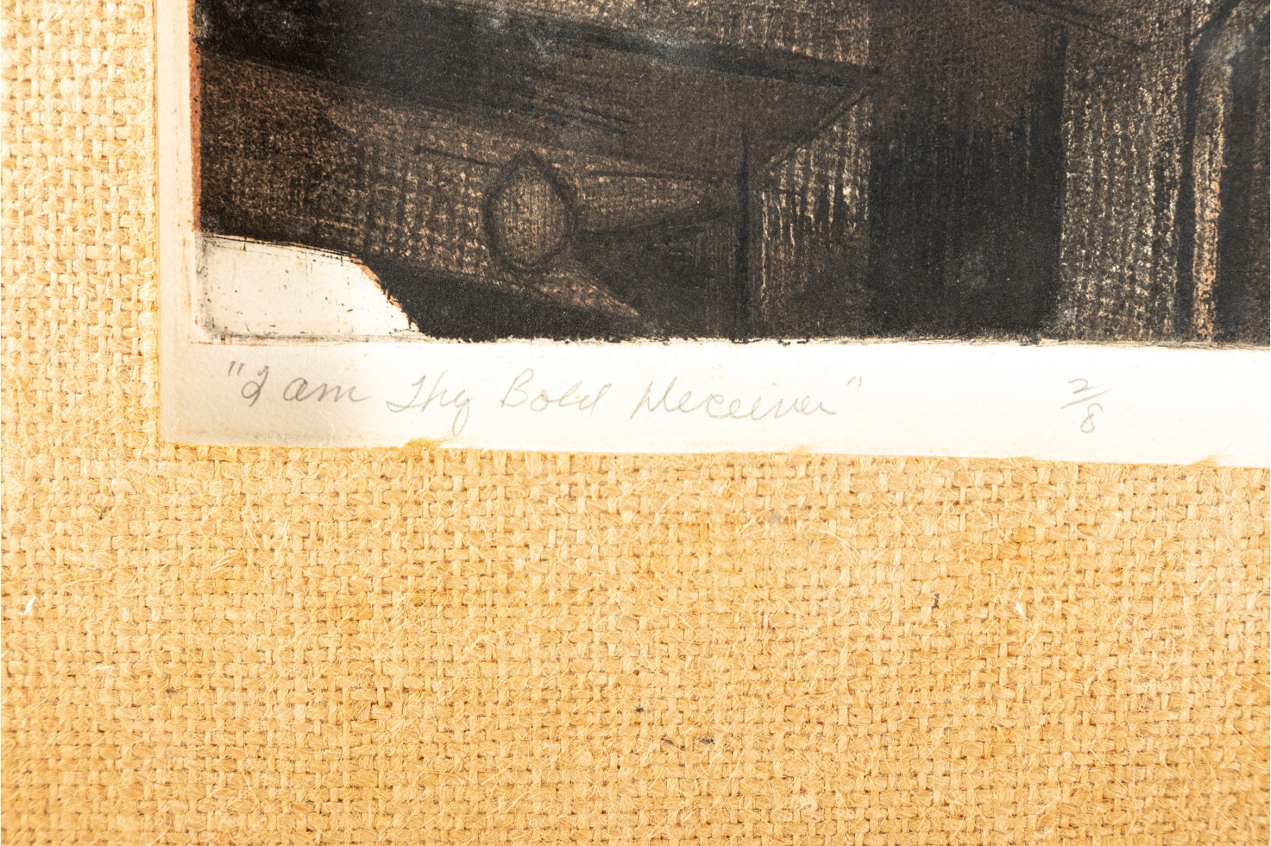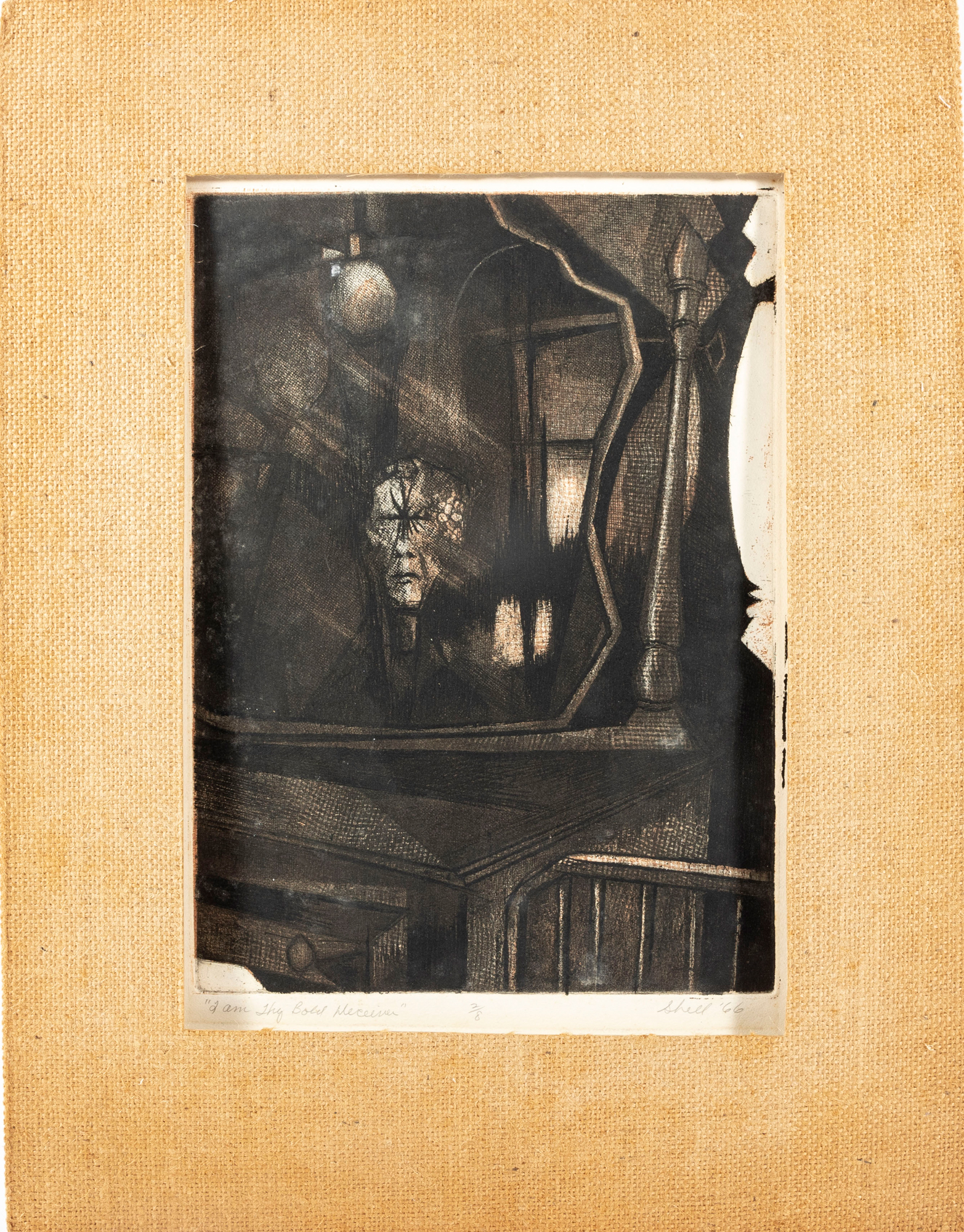 A lithograph print of James Shell's "I am Thy Bold Believer" -- 1966, numbered 2 / 8. Signed and titled in graphite on lower half. The print is unframed with a burlap mat border.