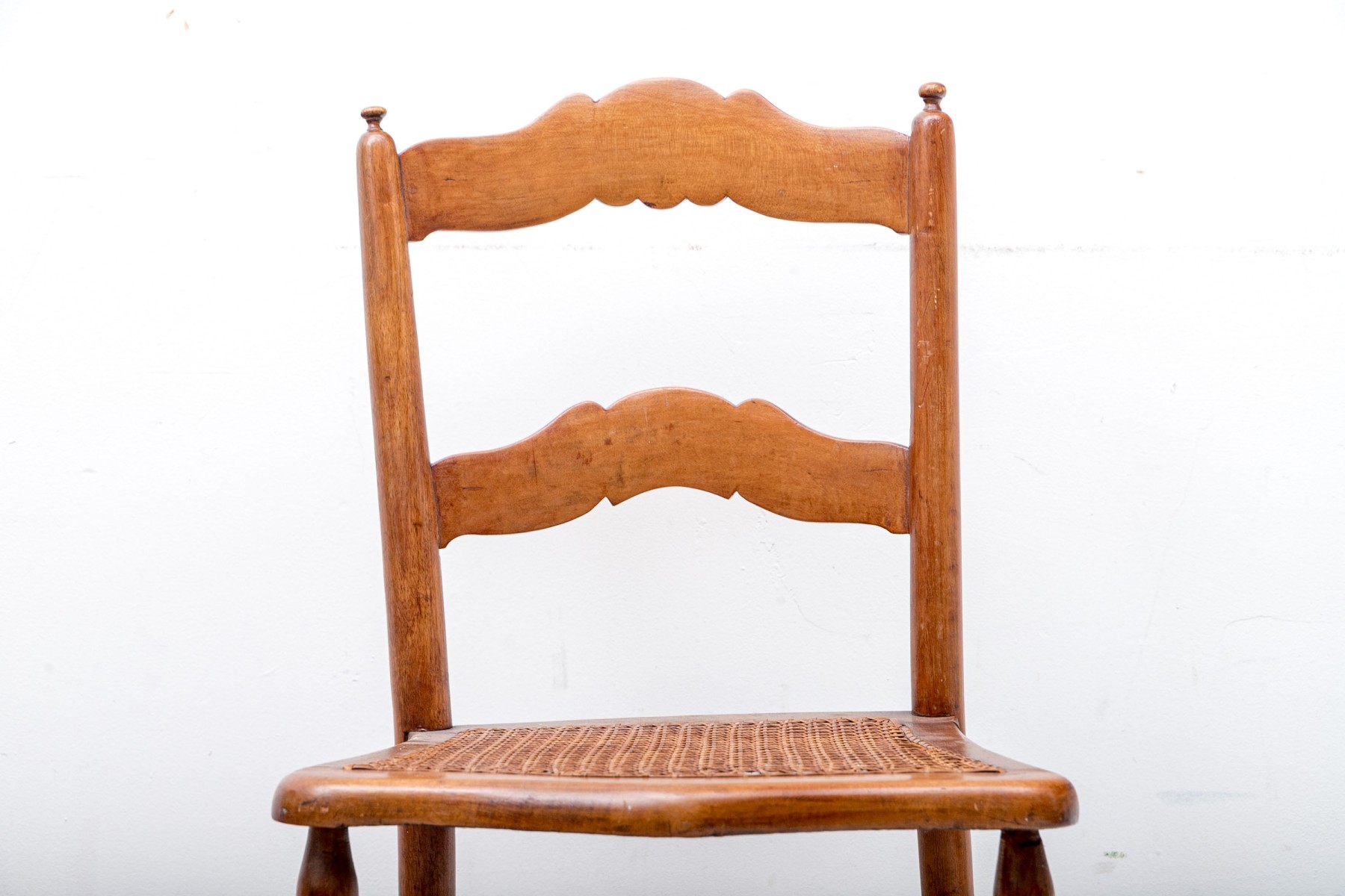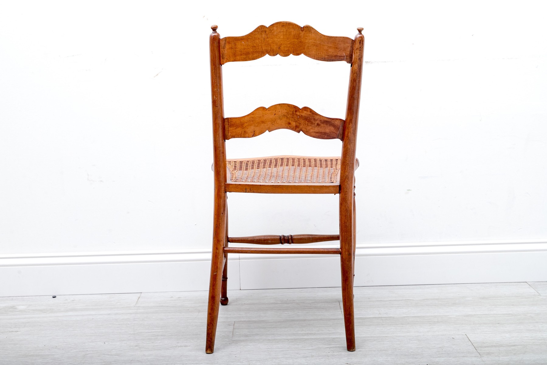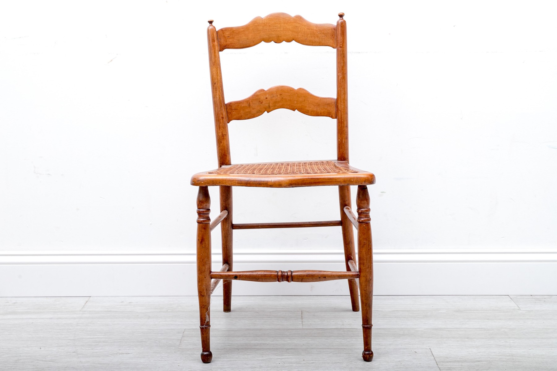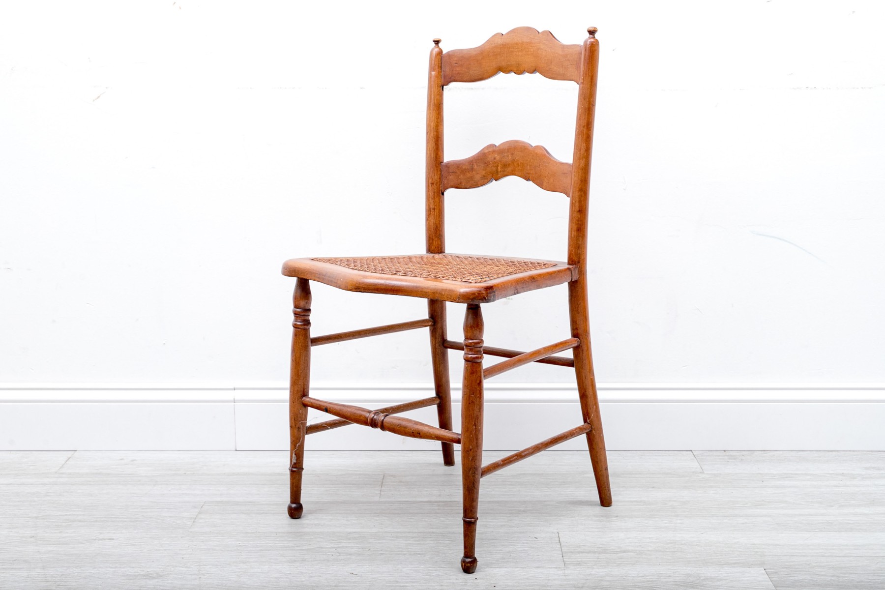 A vintage children's ladder-back chair crafted from solid wood and sporting a woven cane seat, circa 1970's.