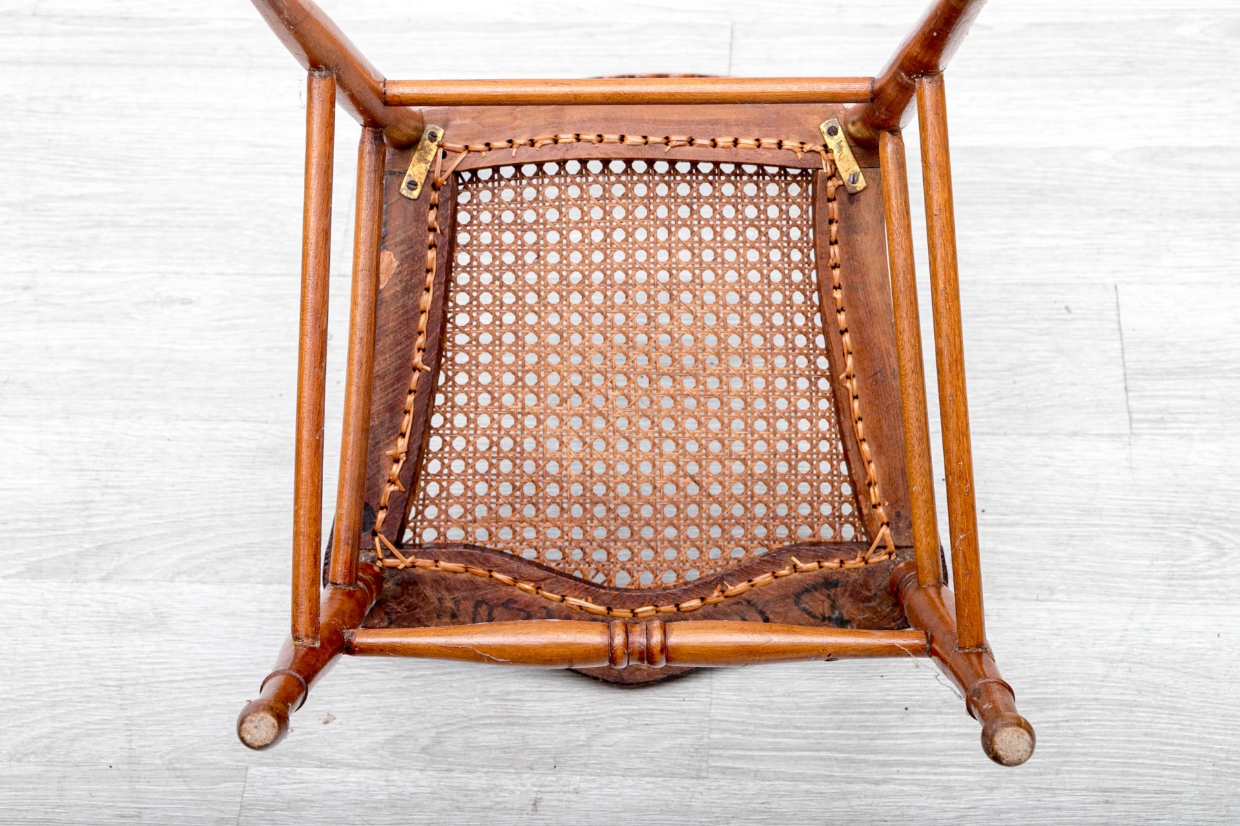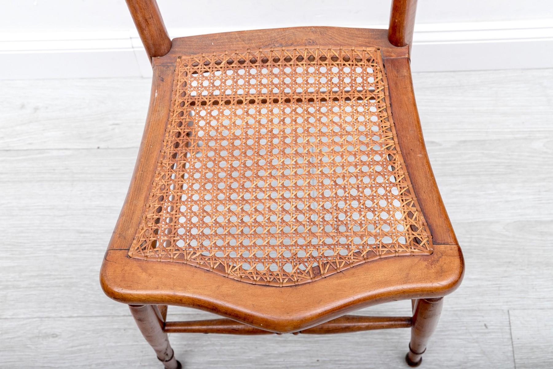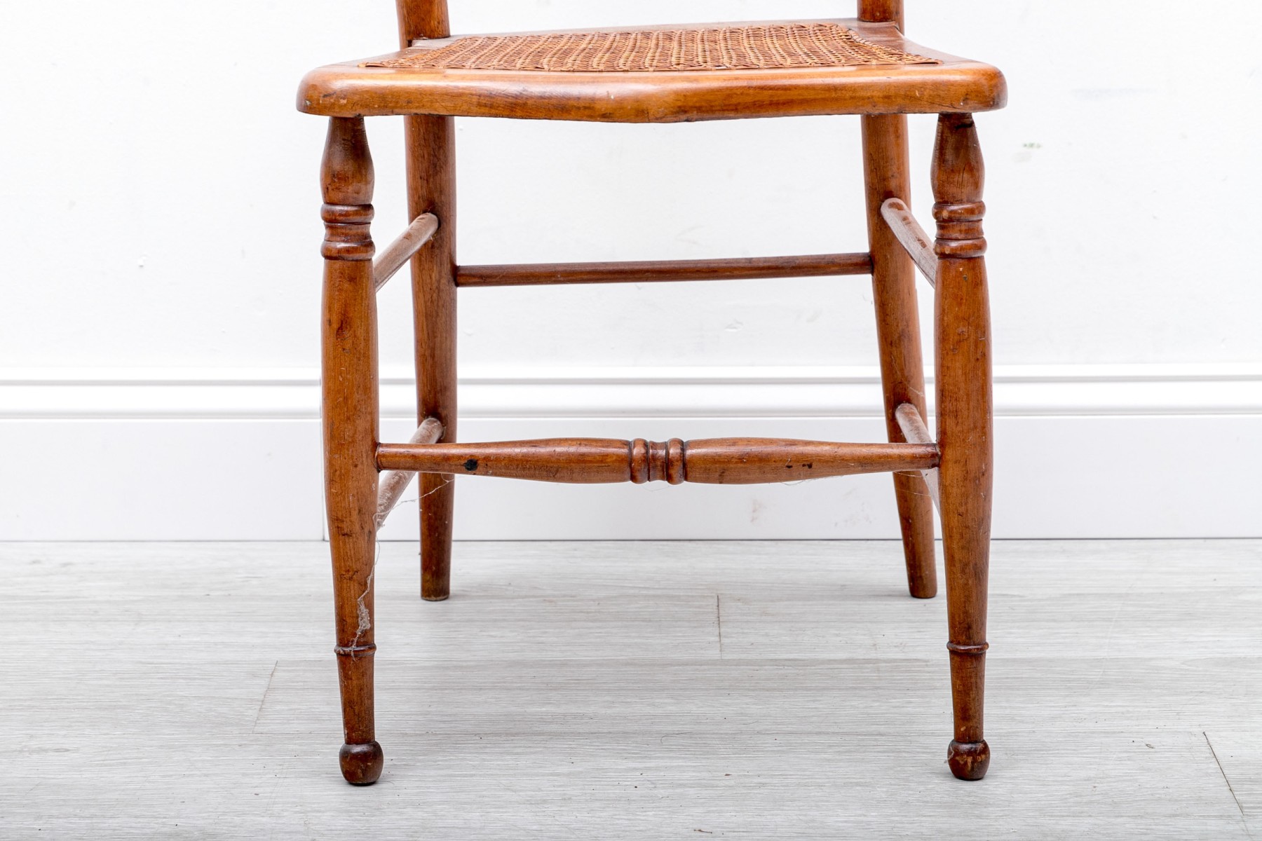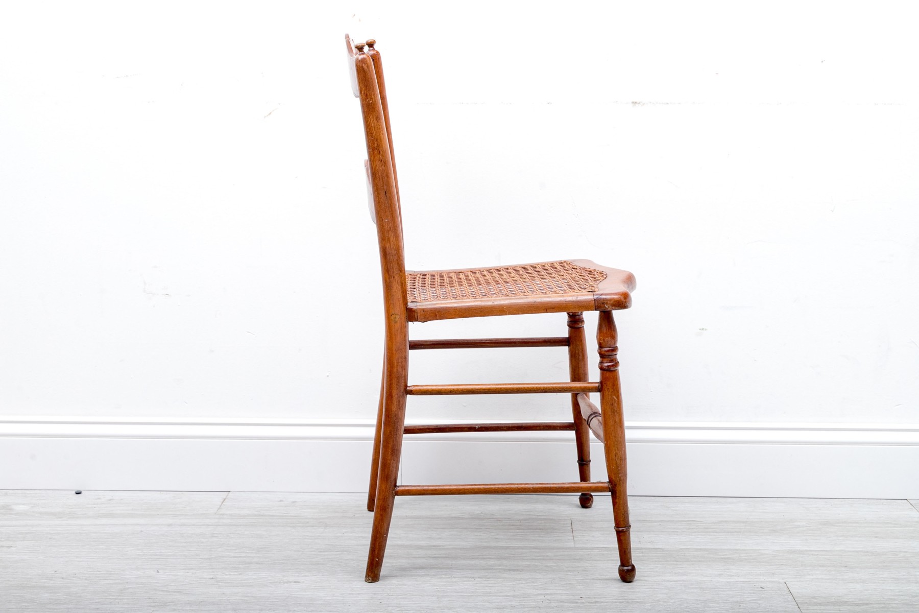 A vintage children's ladder-back chair crafted from solid wood and sporting a woven cane seat, circa 1970's.