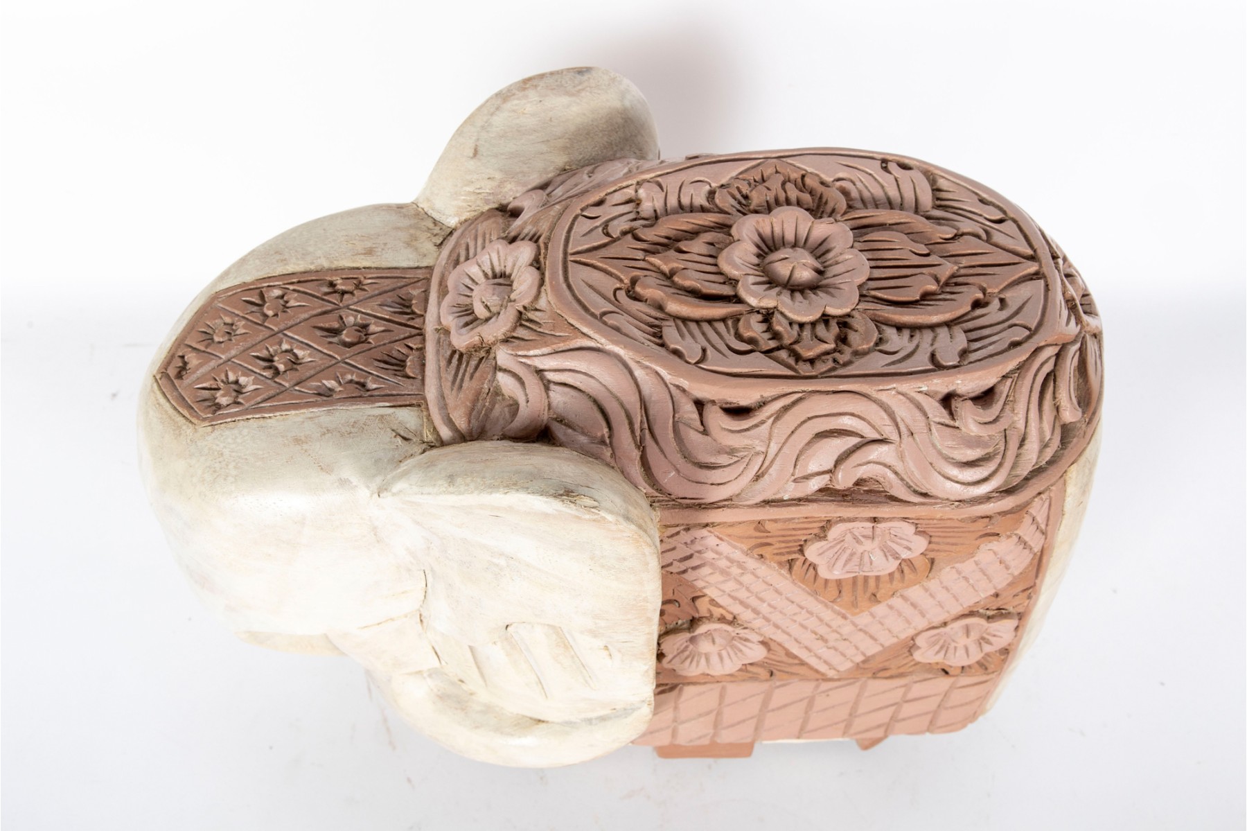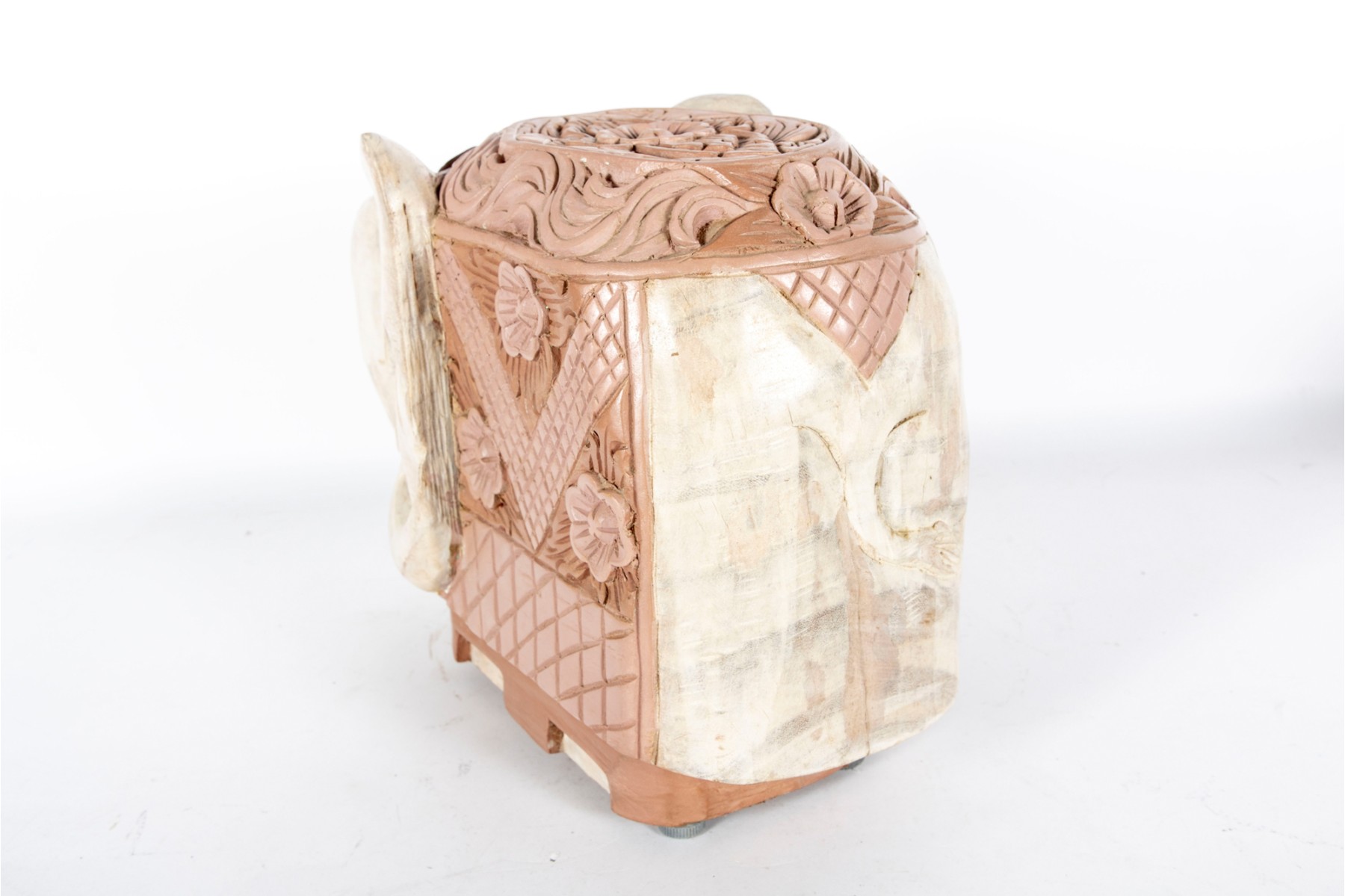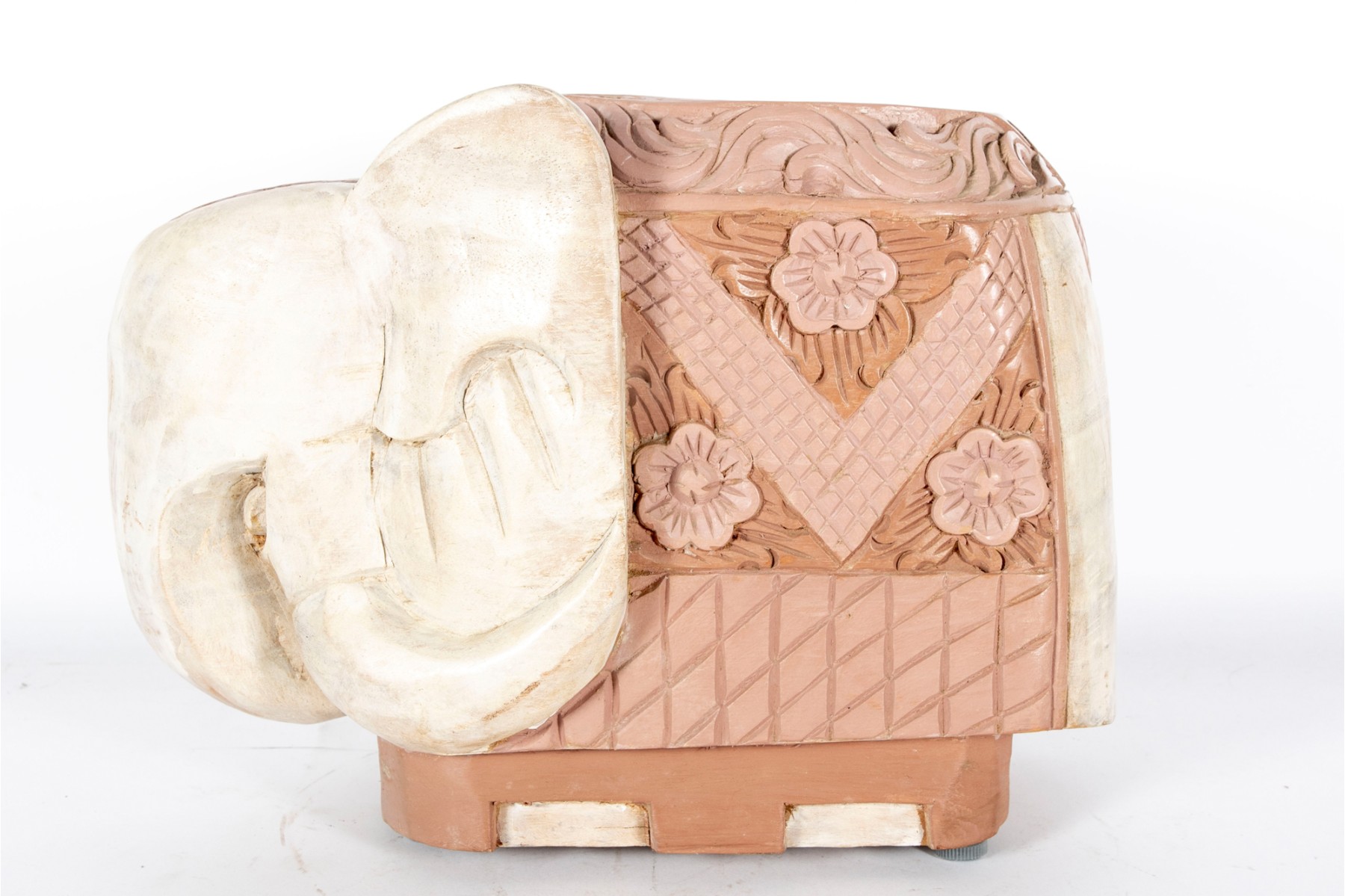 A delightful 1970's carved wood figure of an elephant painted white and mauve. The back is beautifully detailed with flowers and geometric lattices, while the face is nicely carved with abstract features and wide tusks that follow the curve of large flared ears.
