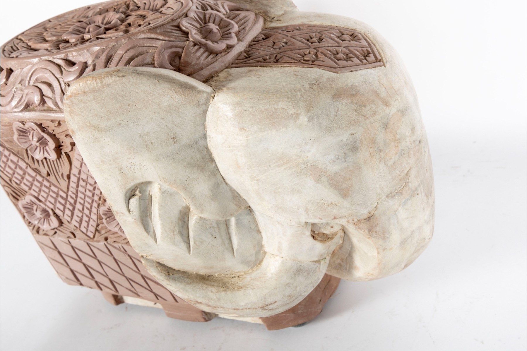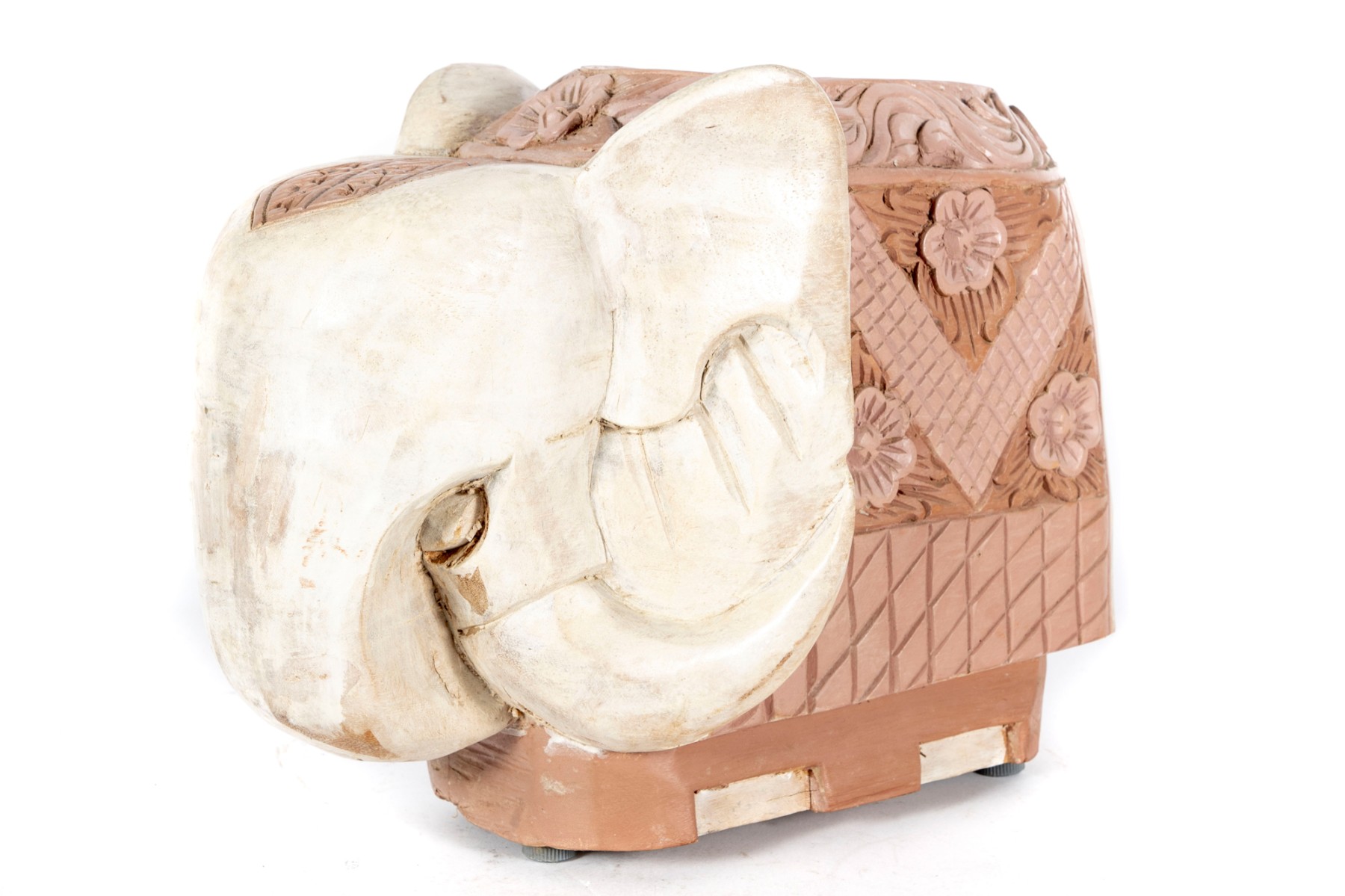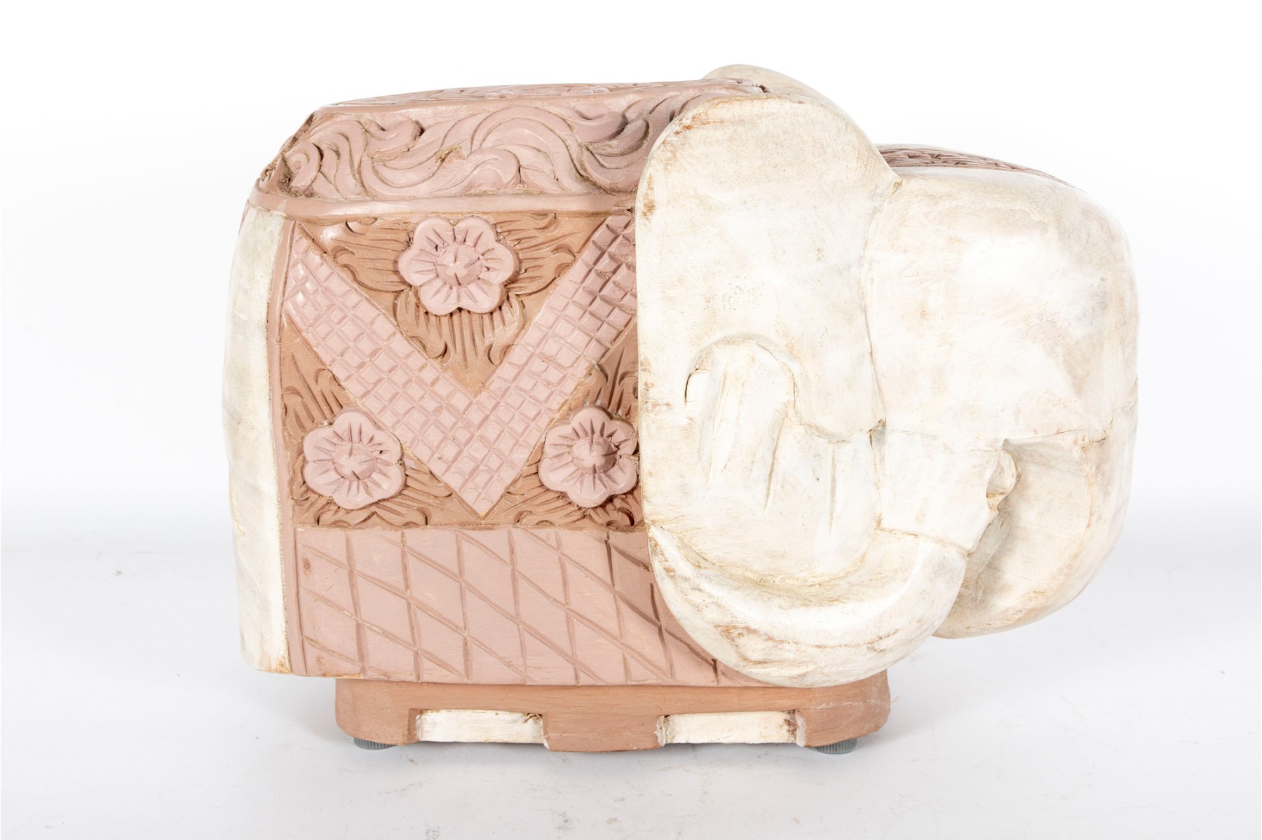 A delightful 1970's carved wood figure of an elephant painted white and mauve. The back is beautifully detailed with flowers and geometric lattices, while the face is nicely carved with abstract features and wide tusks that follow the curve of large flared ears.