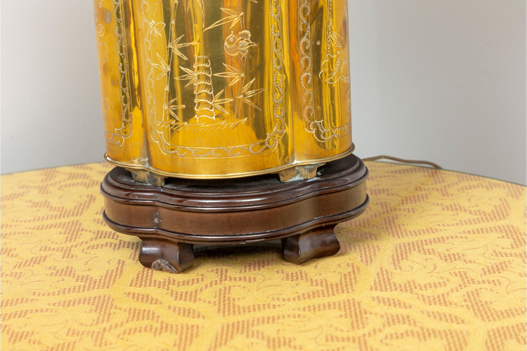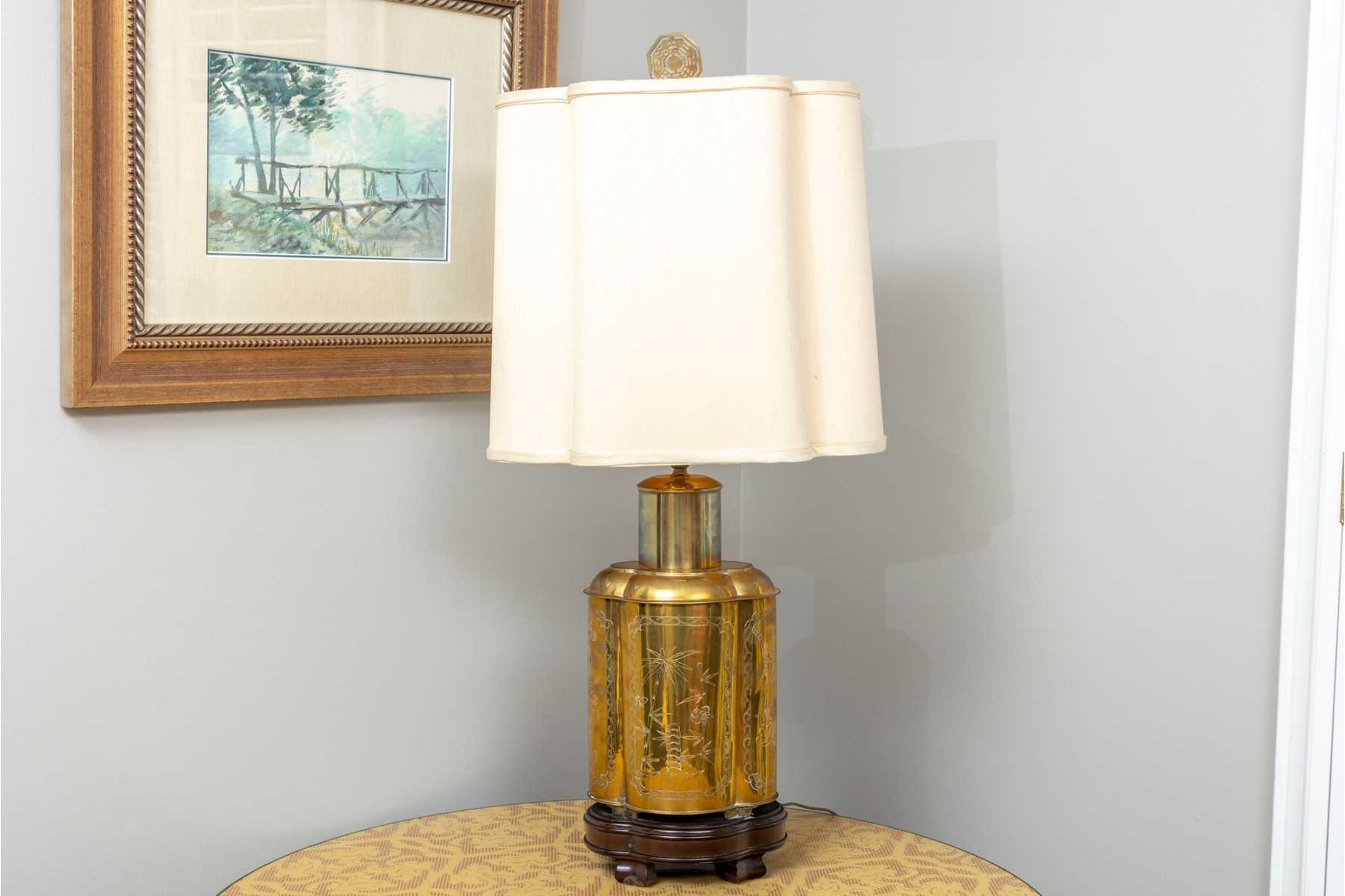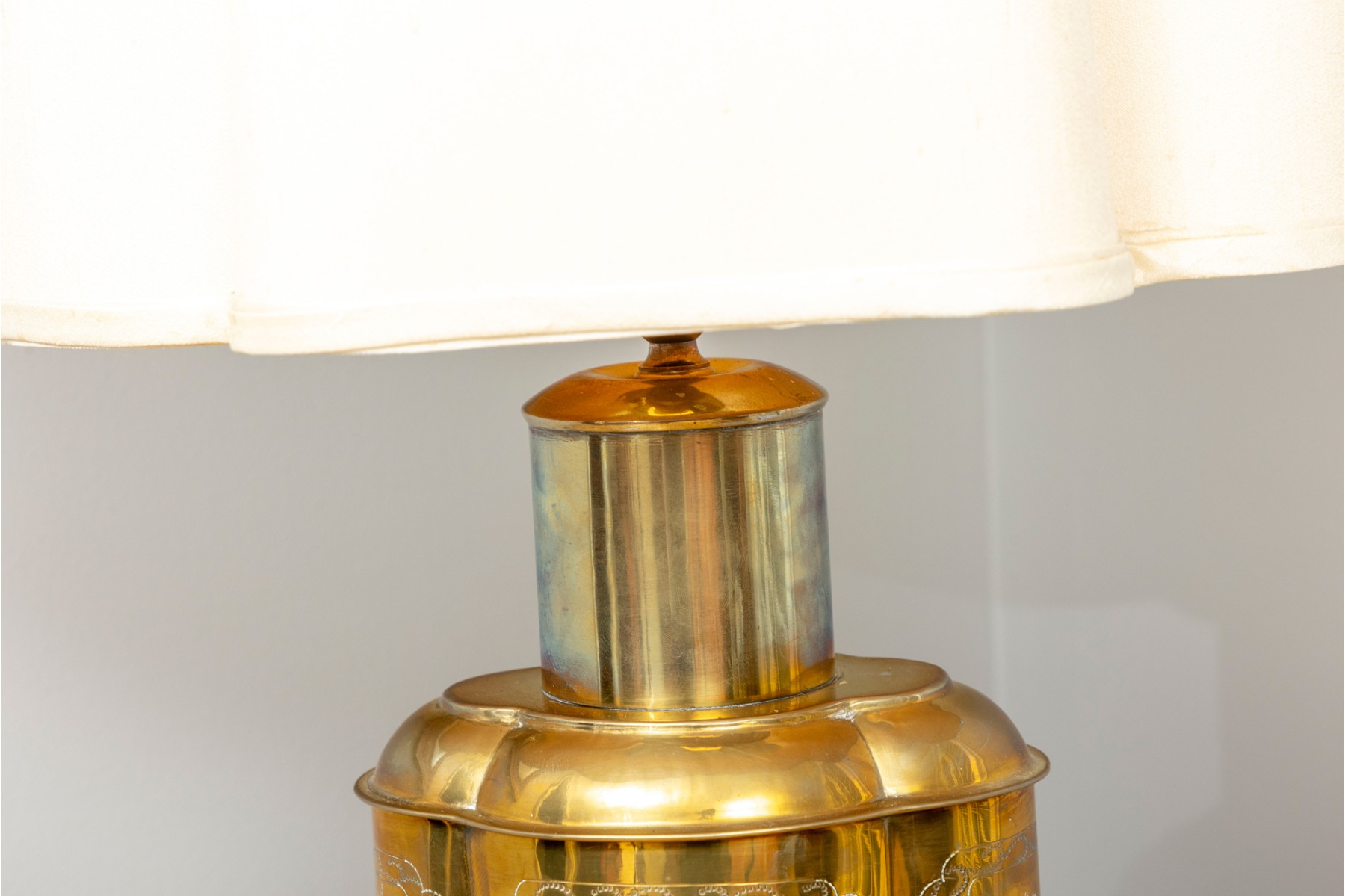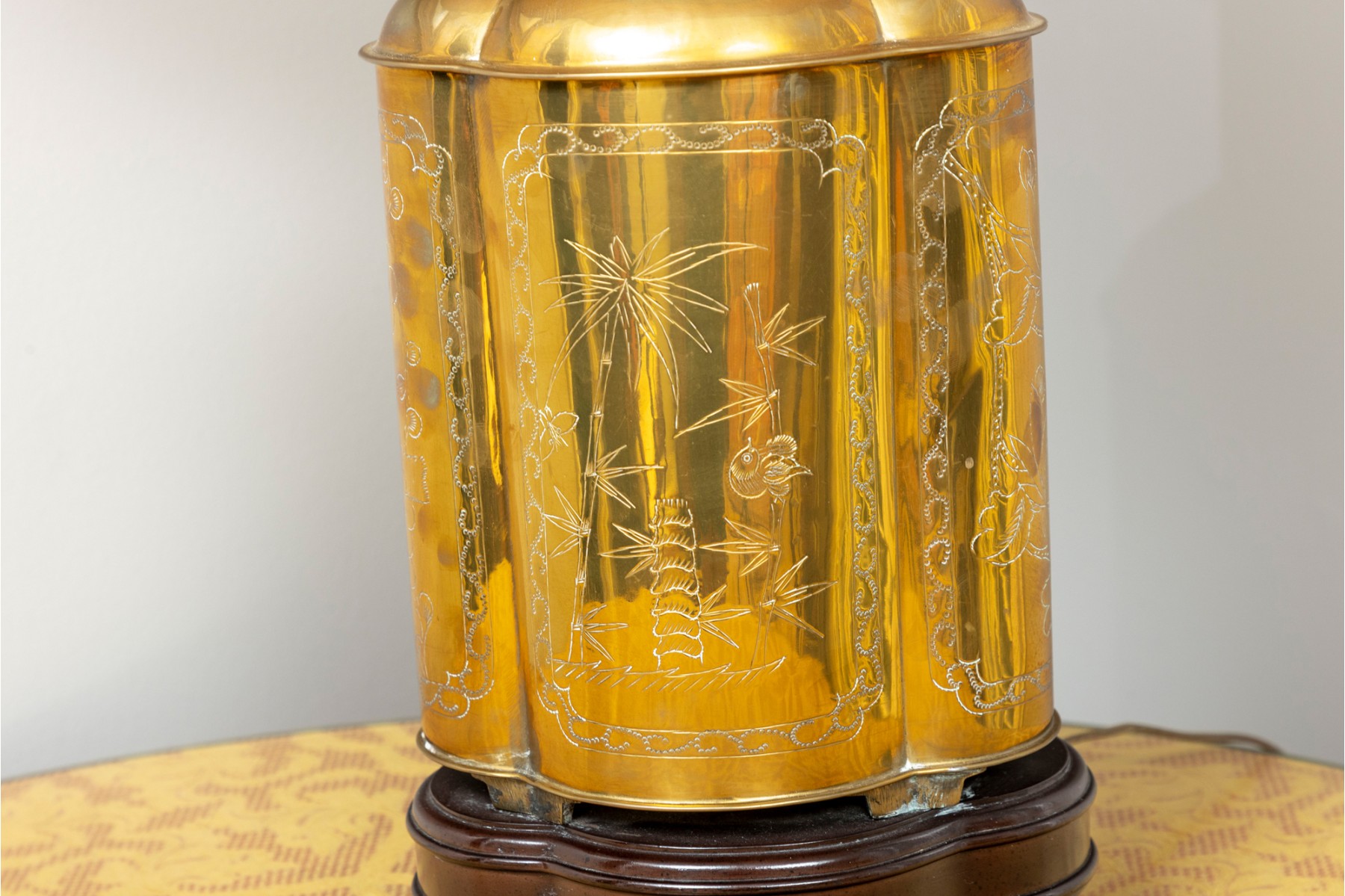 Unique Chinese tea caddy canister made of etched brass and turned into a table lamp supported by a round wooden base. Comes with a harp, finial, and shade. Circa 1970's.