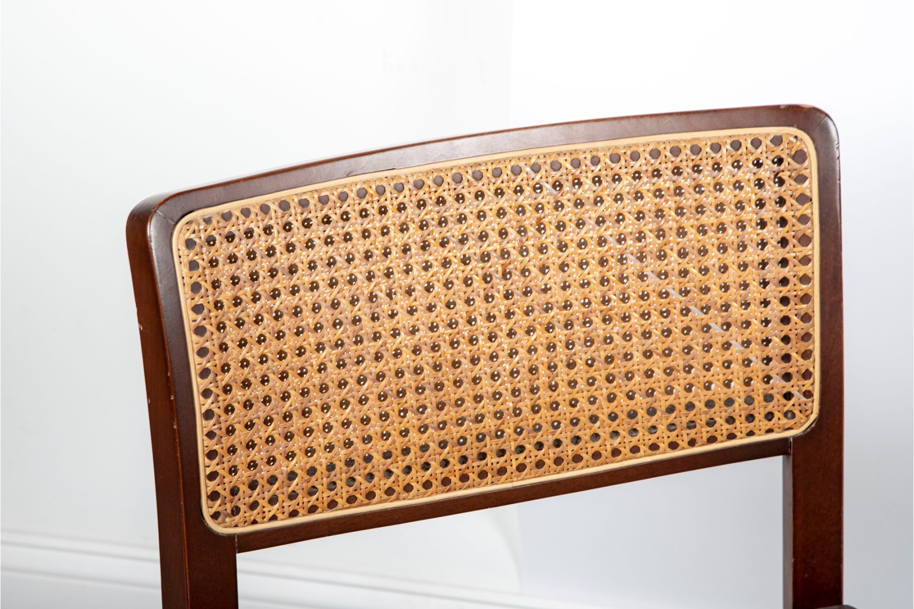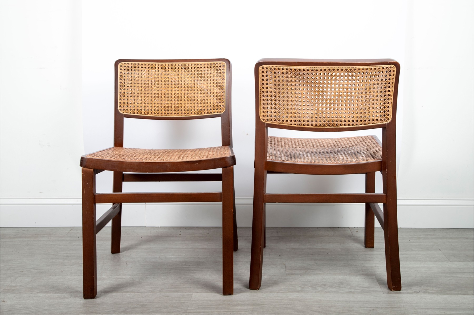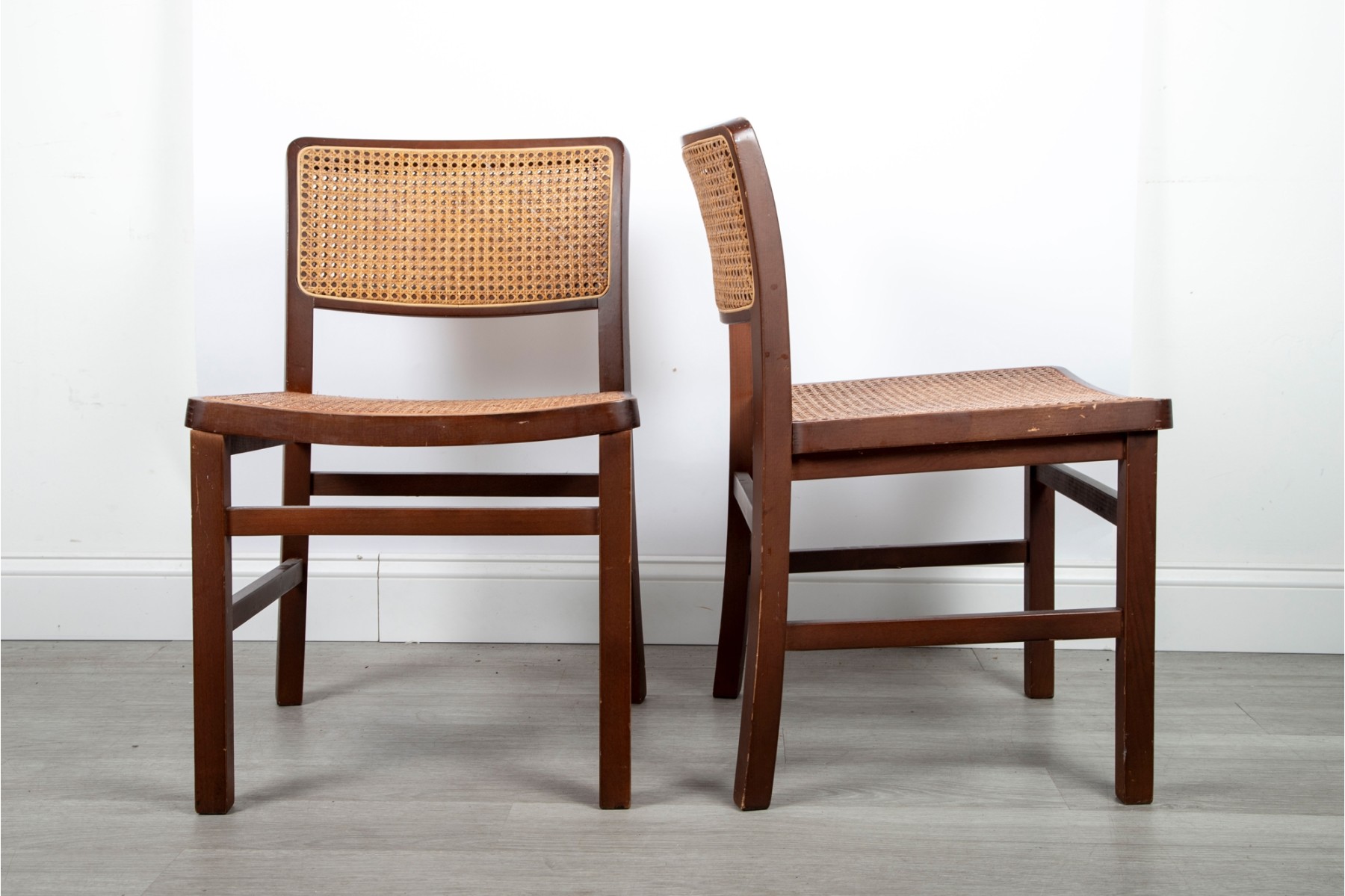 A pair of 1970's Italian cane seat chairs featuring clean, minimalist lines characteristic of mid-century modern design. The chairs are crafted from warm-toned wood frames, with woven cane backs and seats that add a natural, airy texture.