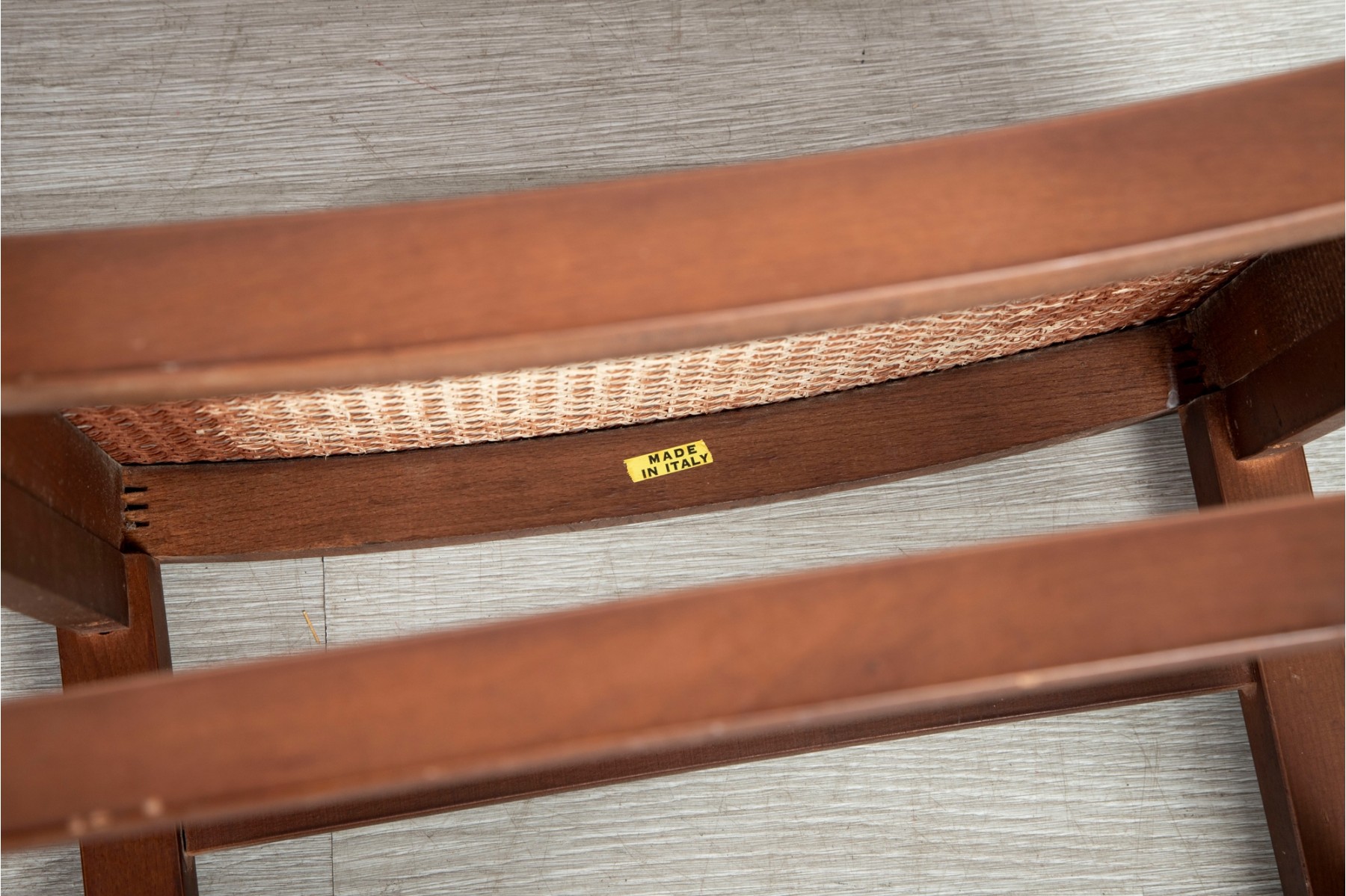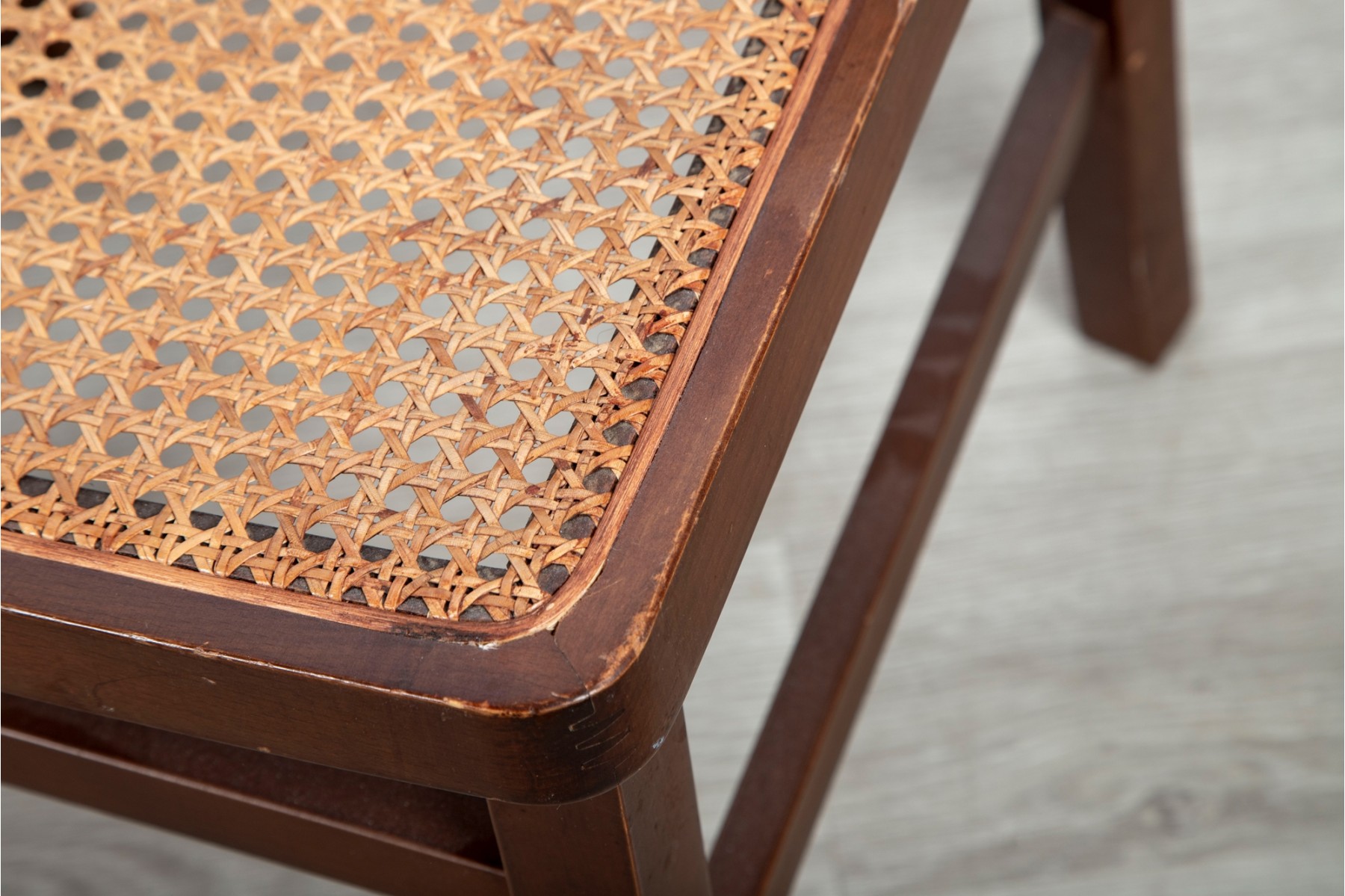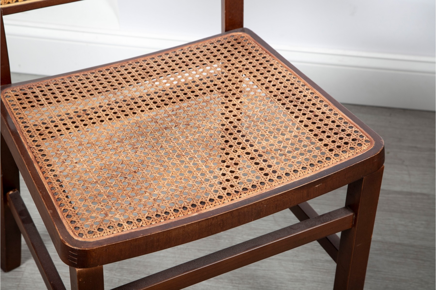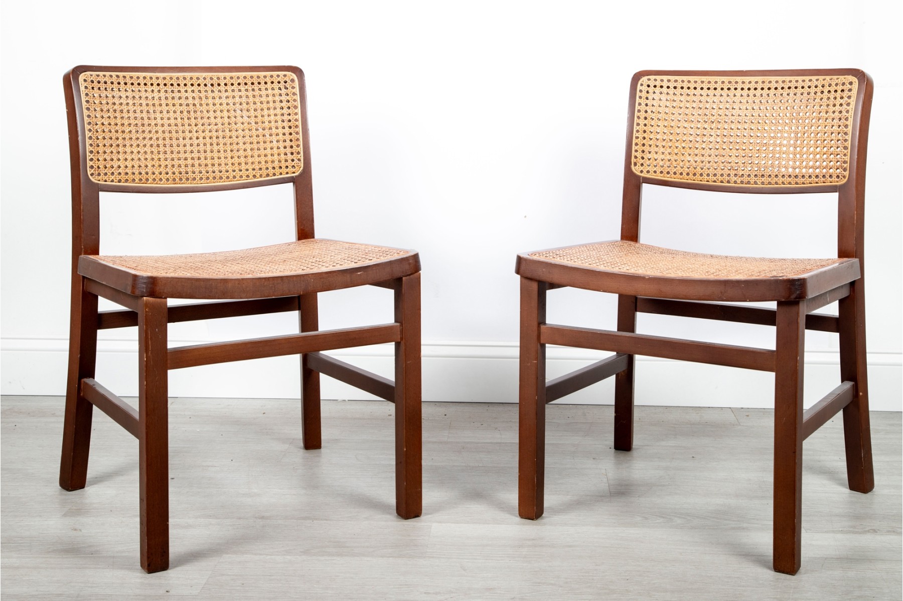 A pair of 1970's Italian cane seat chairs featuring clean, minimalist lines characteristic of mid-century modern design. The chairs are crafted from warm-toned wood frames, with woven cane backs and seats that add a natural, airy texture.