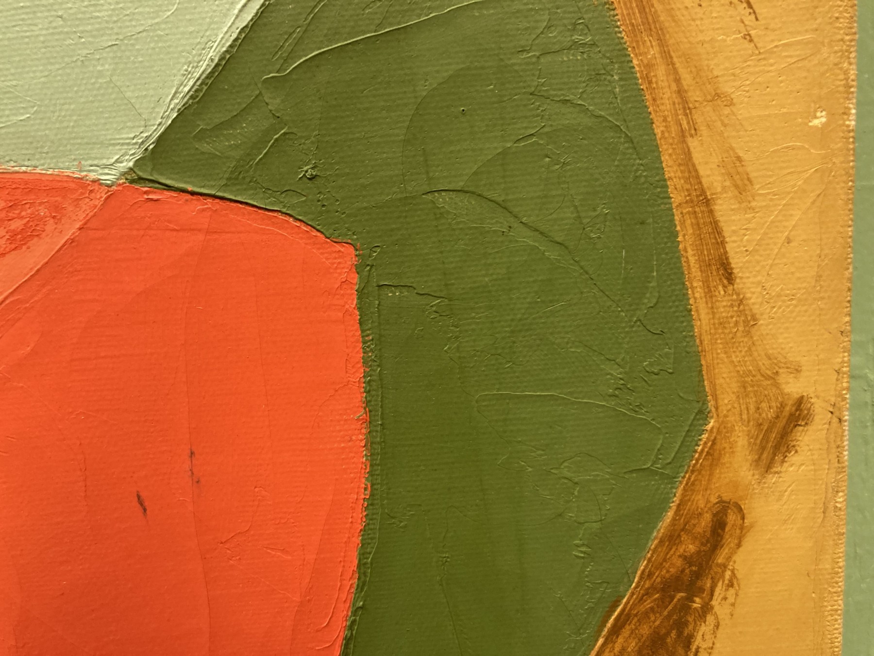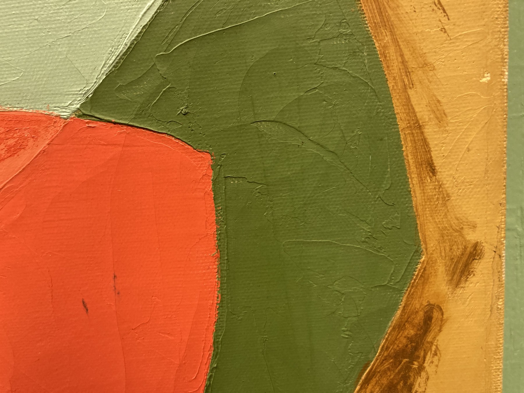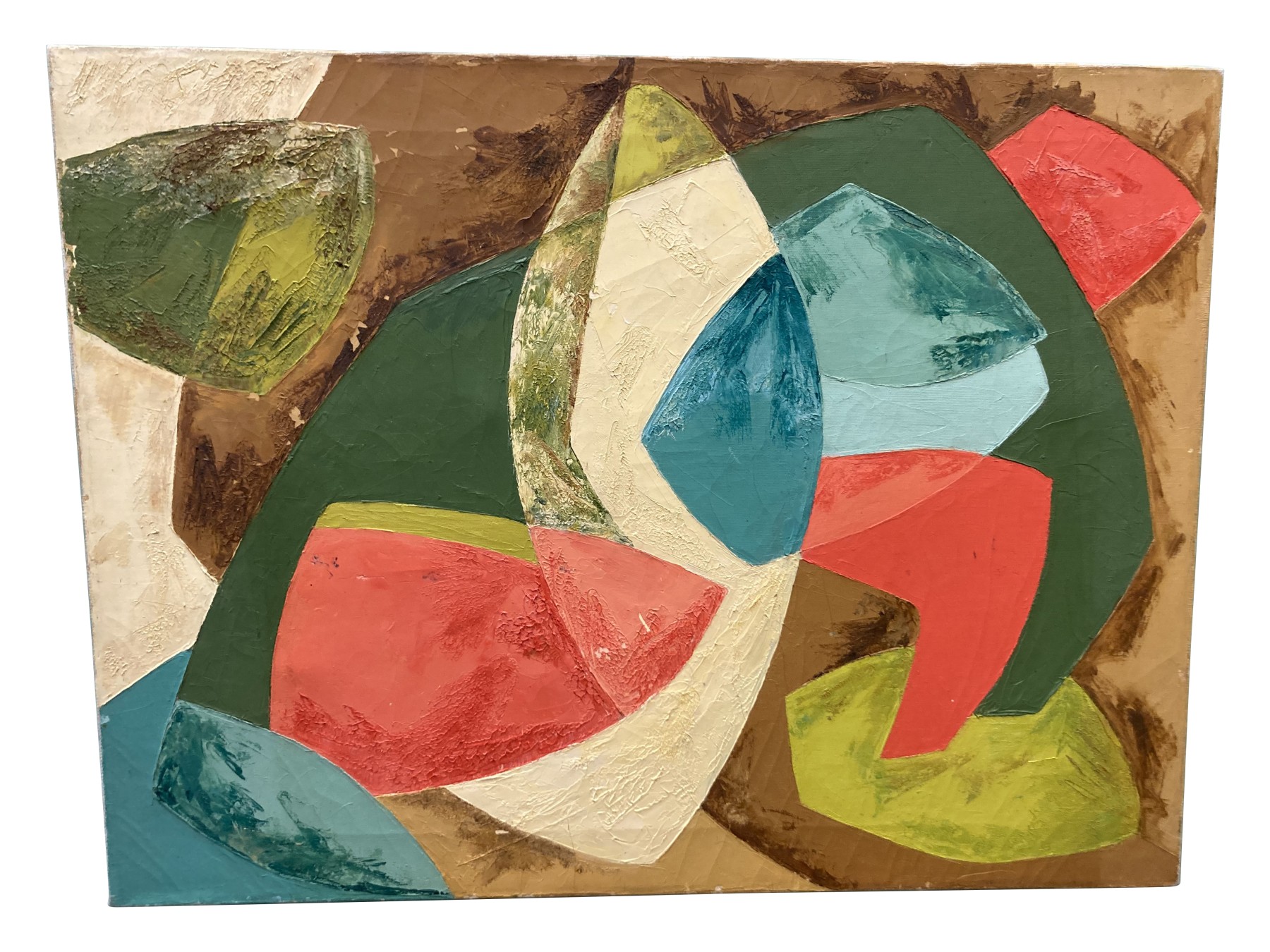 An unframed and unsigned Abstract painting in original condition with fine bold colors, thick paint application and classic Mid Century style. The free form shapes have a Surreal and anthropomorphic feel and the colors of Cream, Blue, Green and Brown are set off well with blocks of a deep Reddish Salmon. Unframed.