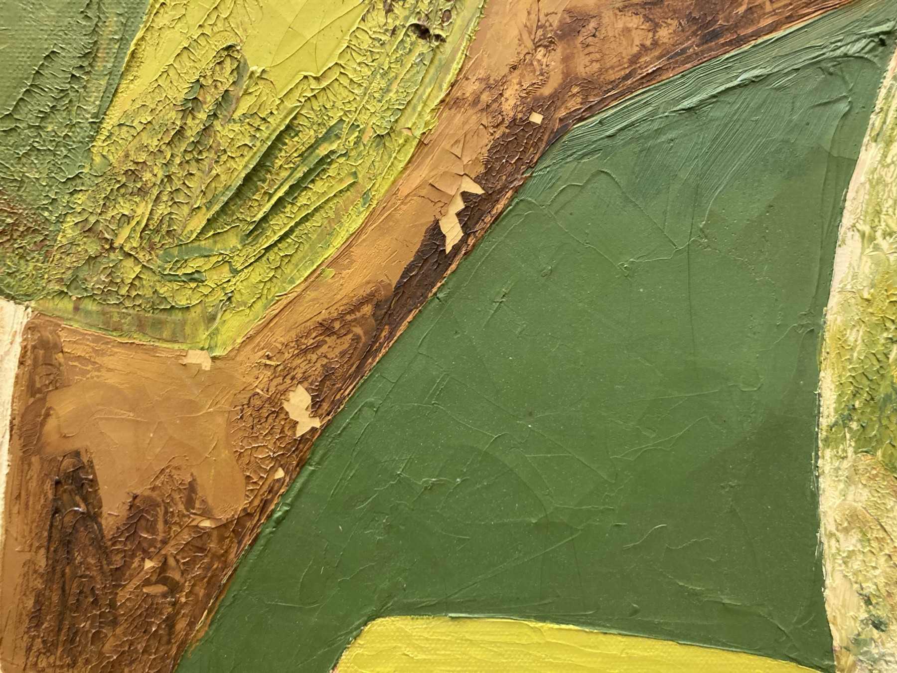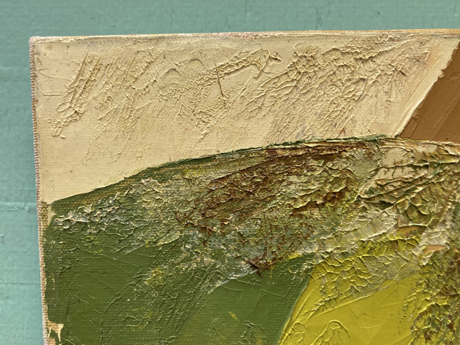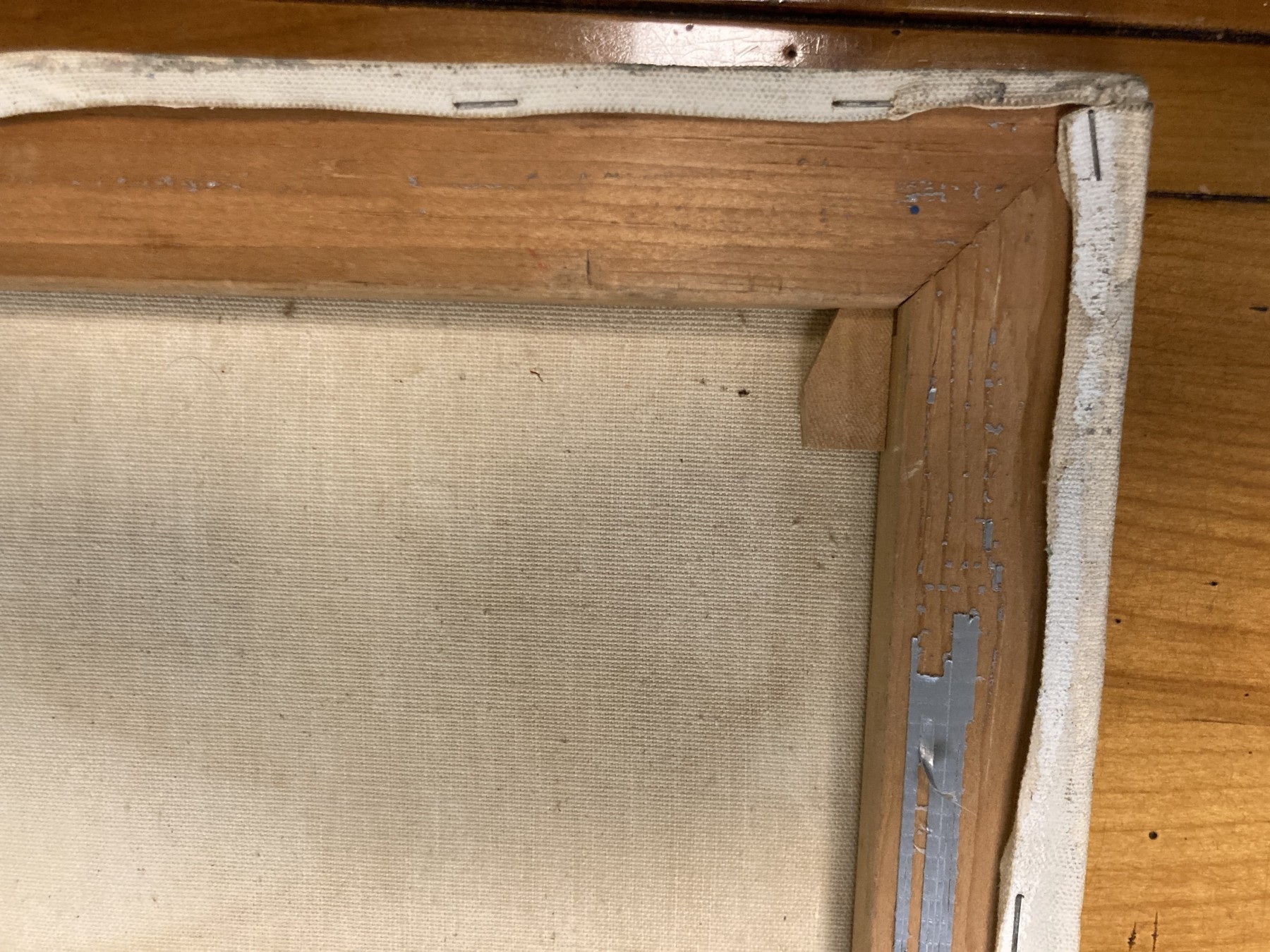 Condition: Please see detail photos. The painting is distressed with sporadic paint losses, craklure, edge wear and some flaking however despite the aging and wear maintains a striking and colorful Mid Century presentation.