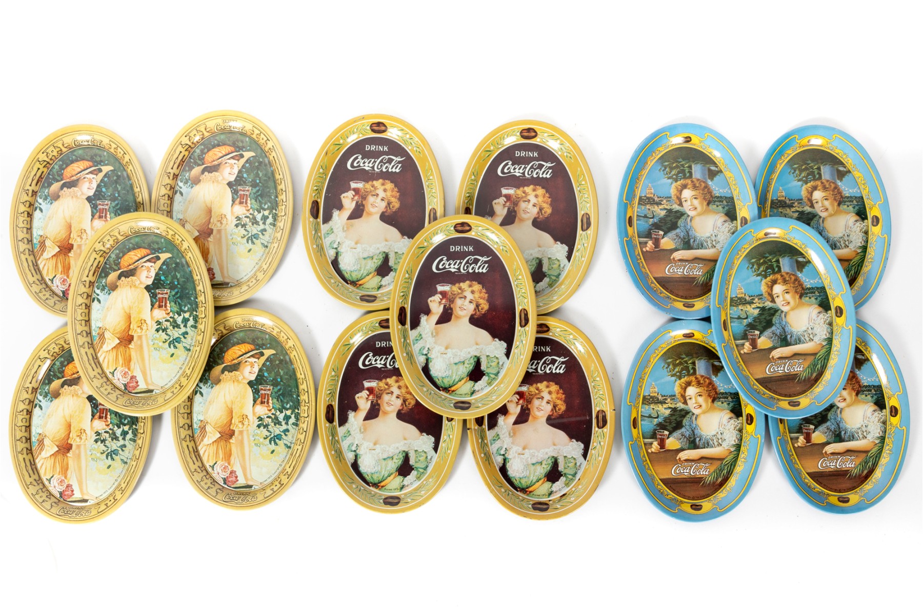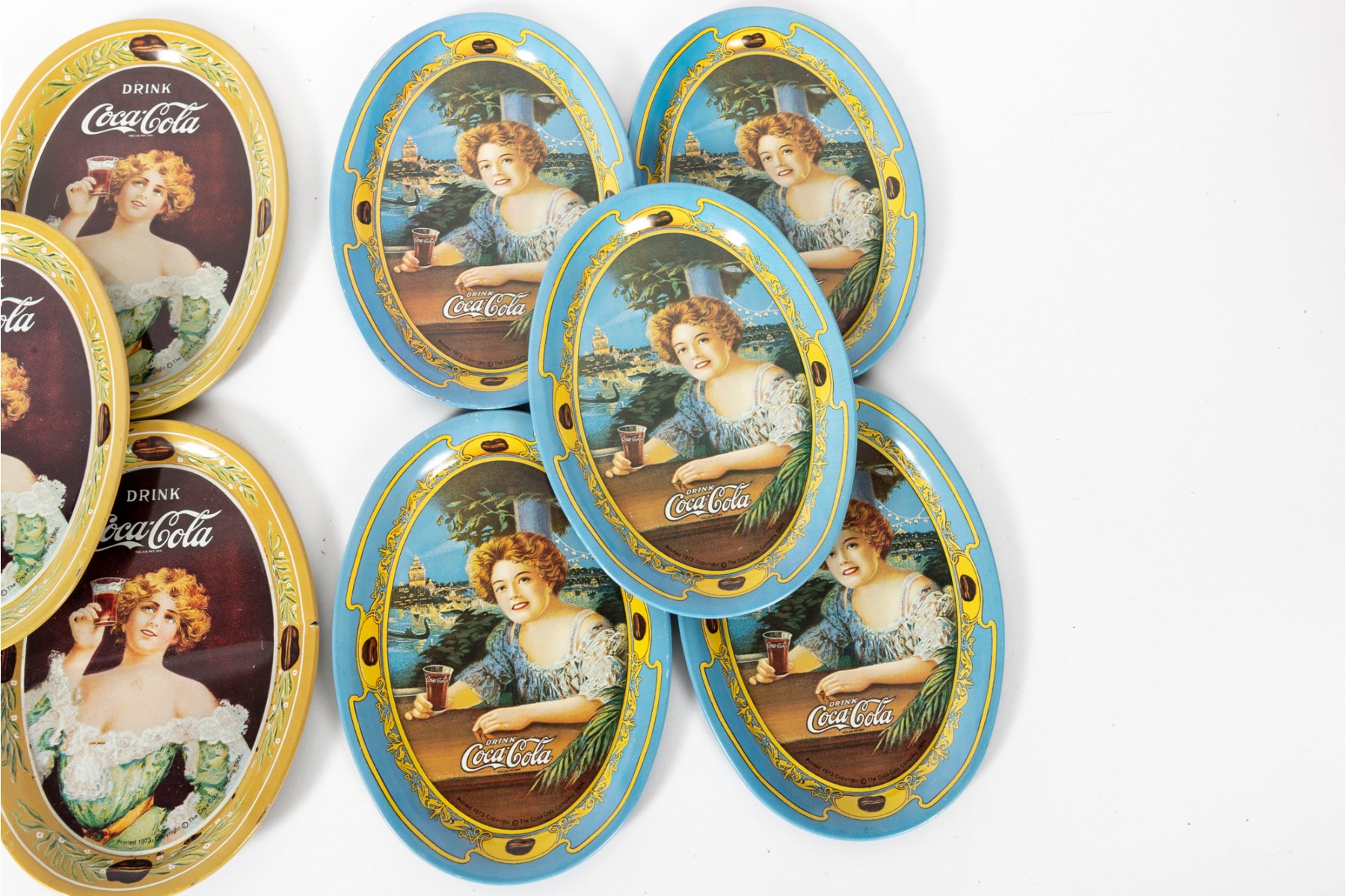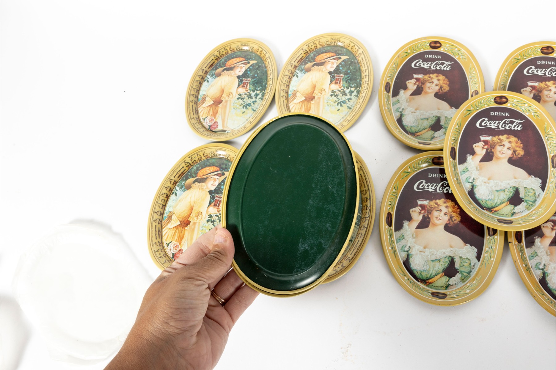 A set of 16 reproduction CocaCola advertising tin trays adorned with classical illustrations. Varying colors, multiple duplicates. See photos for details.