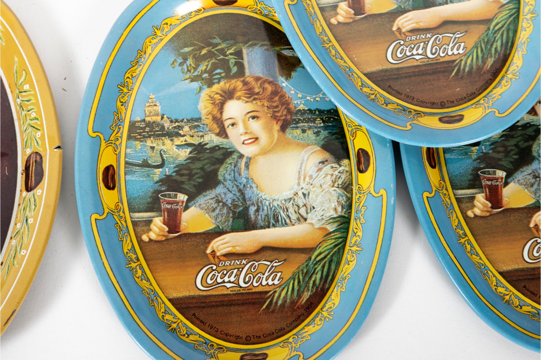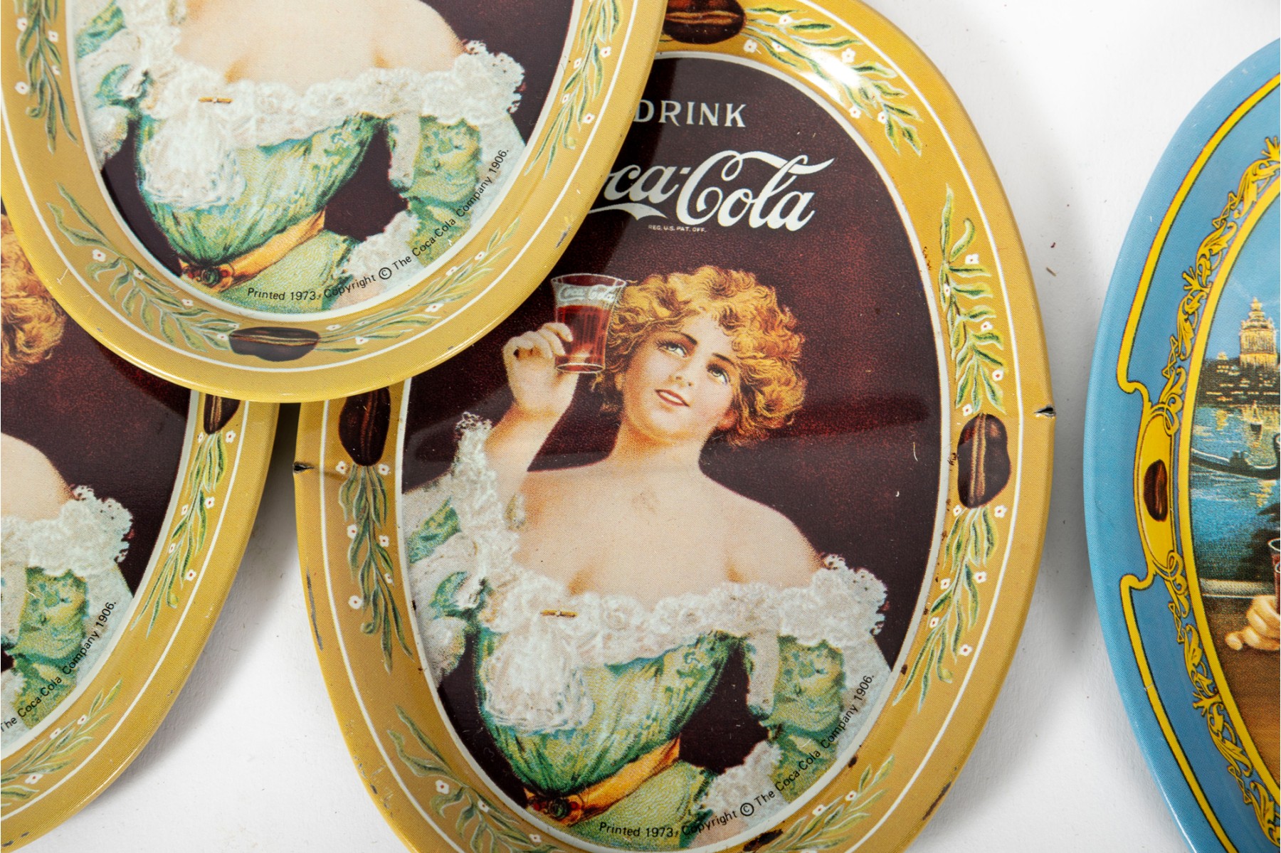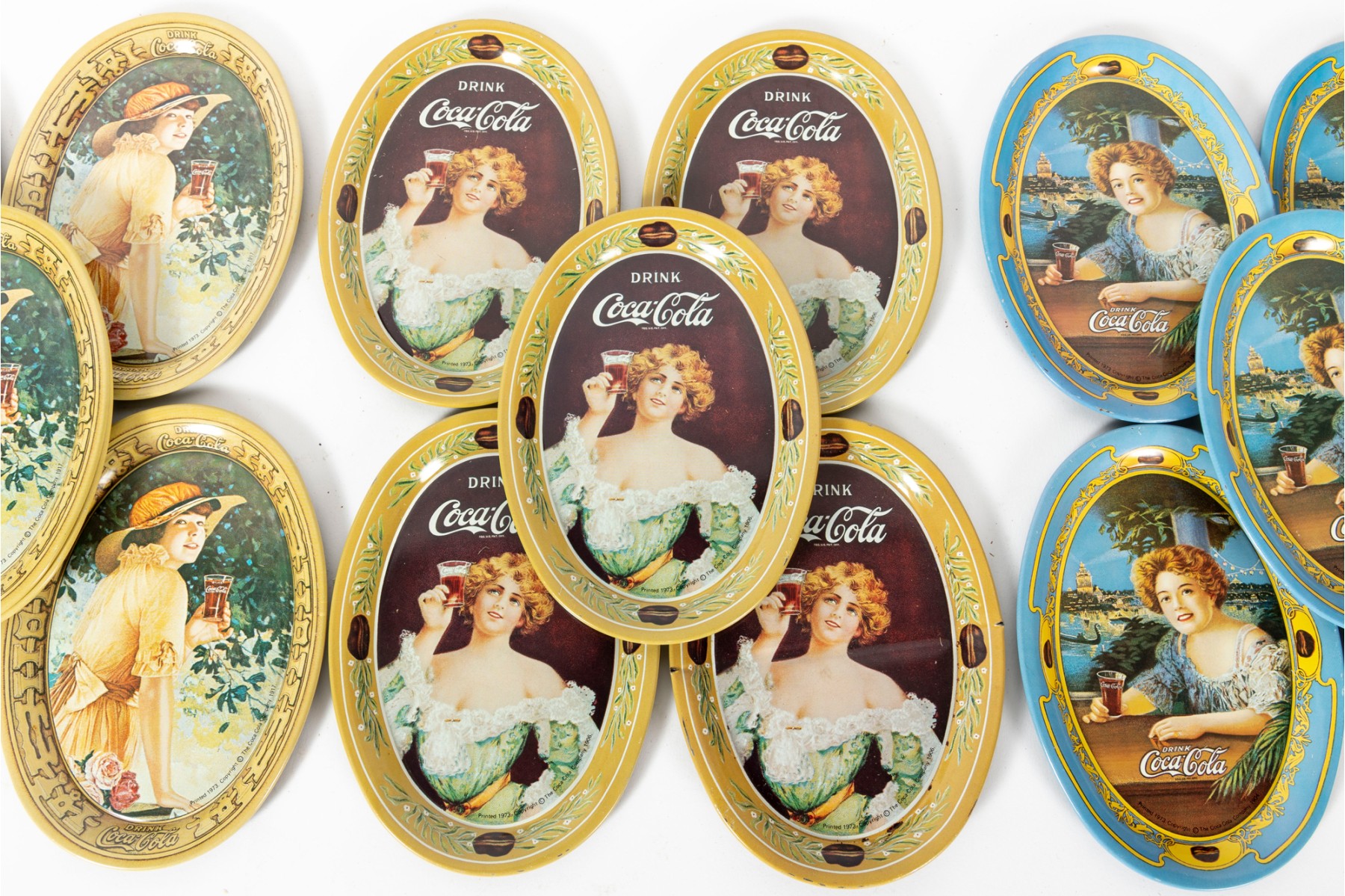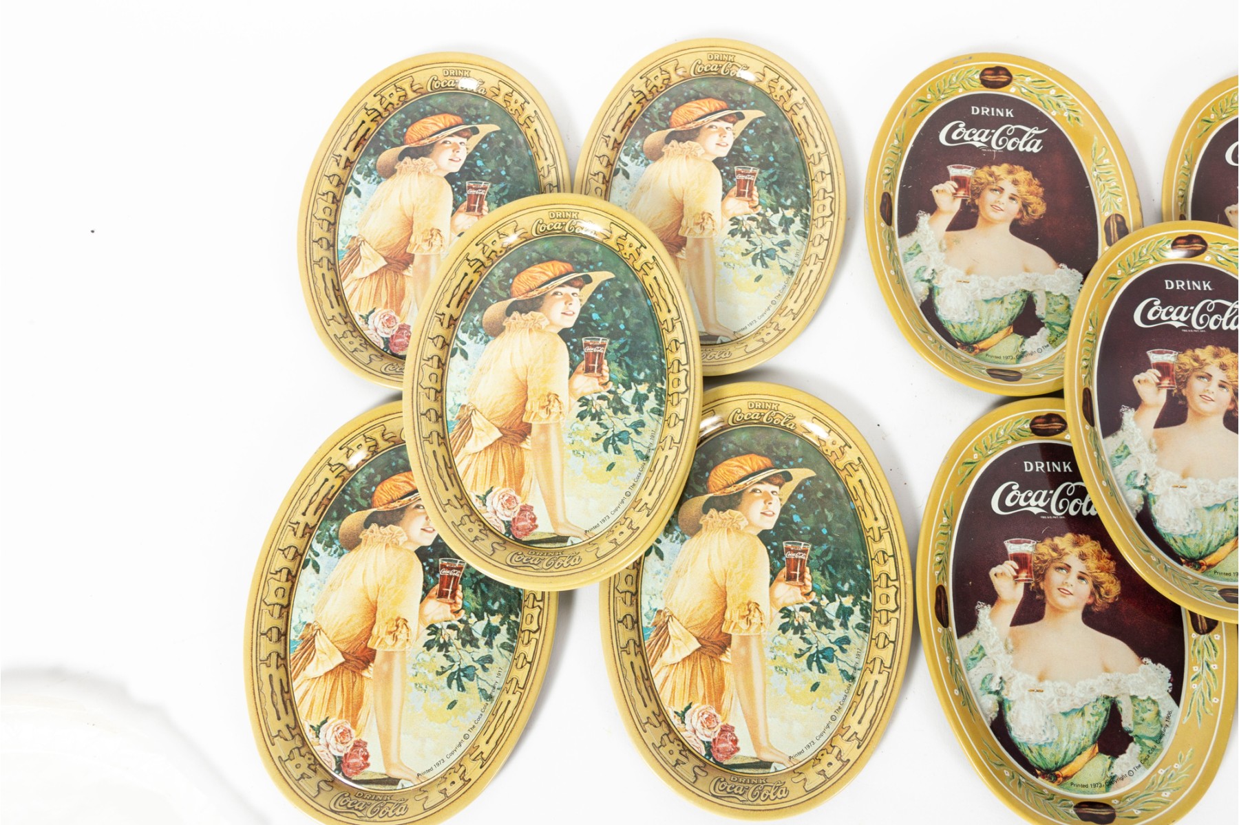 A set of 16 reproduction CocaCola advertising tin trays adorned with classical illustrations. Varying colors, multiple duplicates. See photos for details.