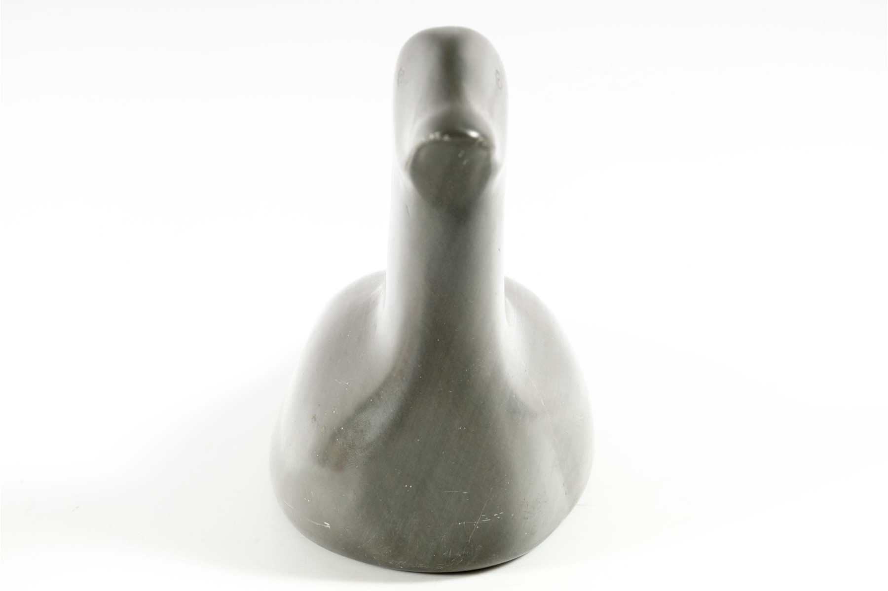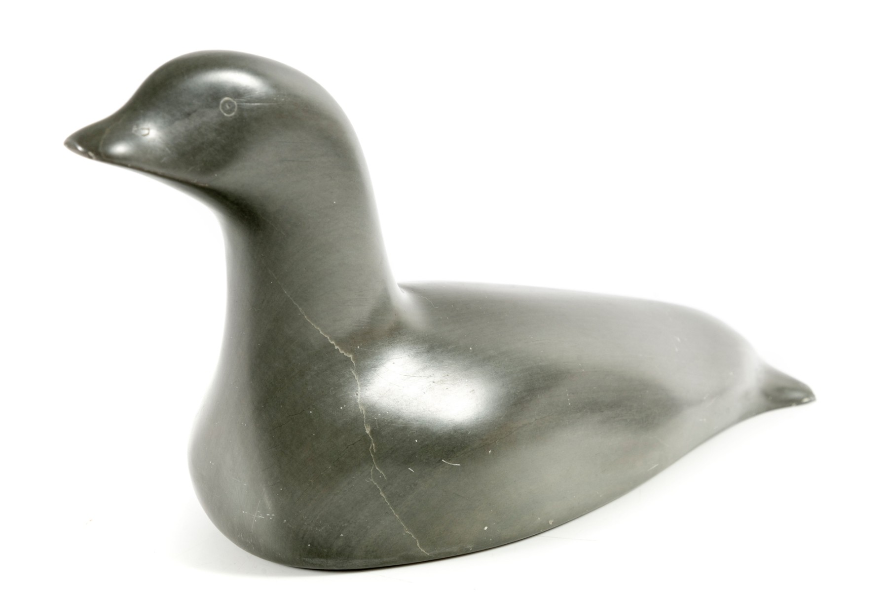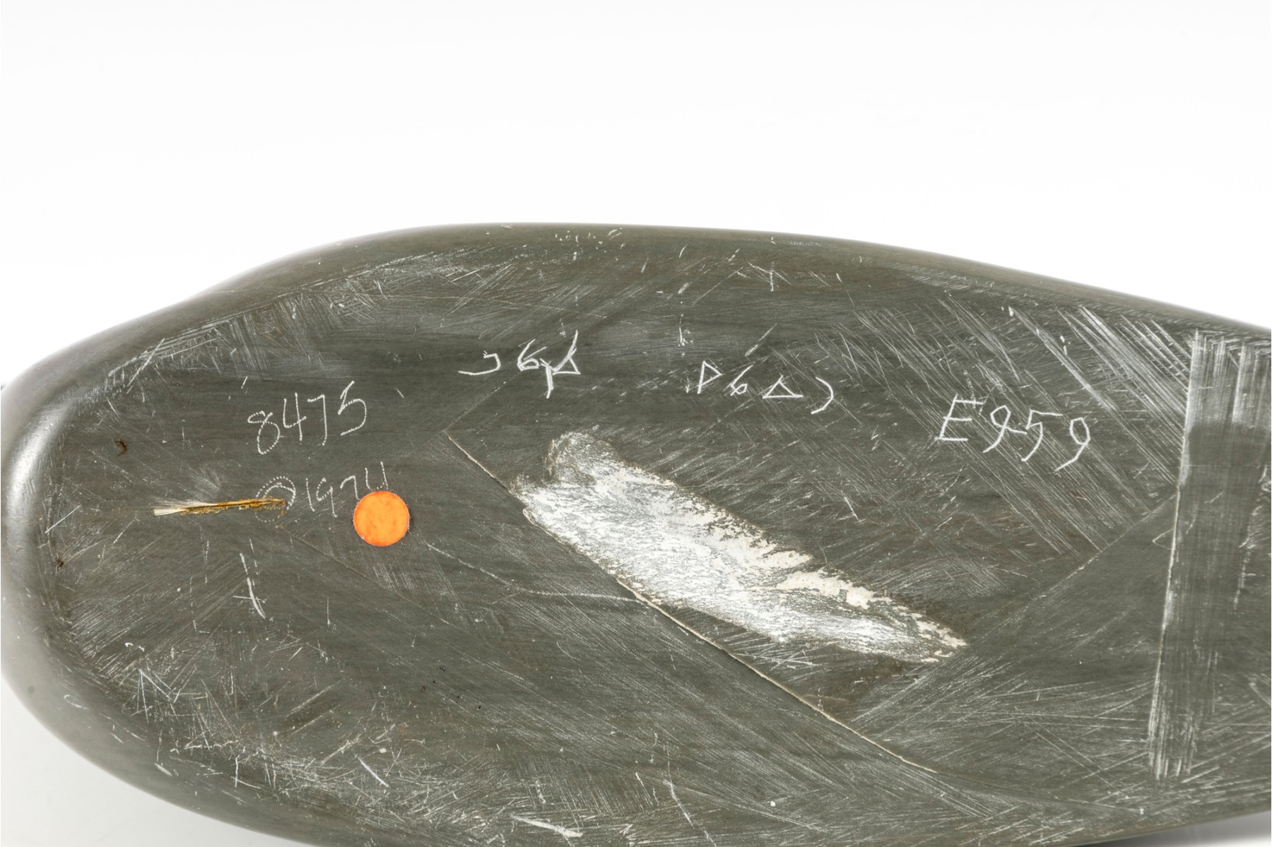A carved soapstone Inuit duck decoy sculpture, rounded and smoothed to a glossy finish. Multiple markings, dated 1974. Perfect for display.
